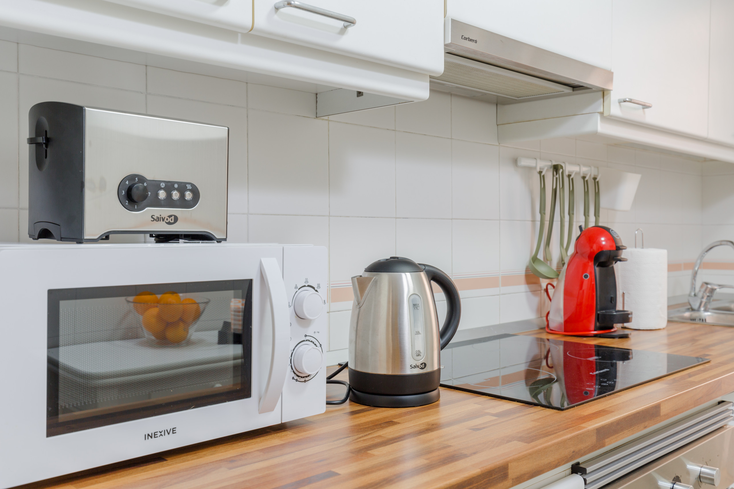 The independent kitchen, of vitroceramic, is equipped with refrigerator, microwave, oven, freezer, washing machine, dryer, kitchen utensils, coffee machine, toaster, kettle and juicer.