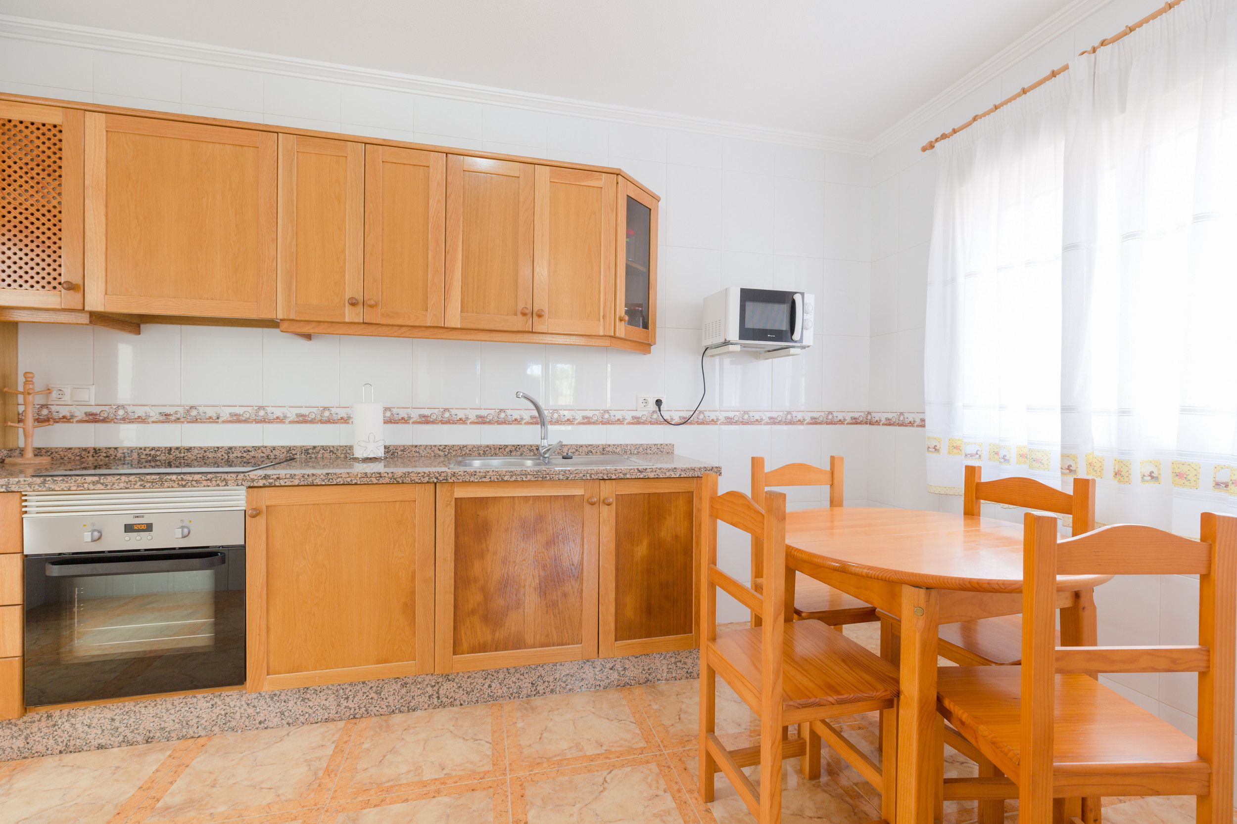 In the kitchen, refrigerator, microwave, oven, freezer, washing machine, dishes/cutlery and kitchen utensils are provided.