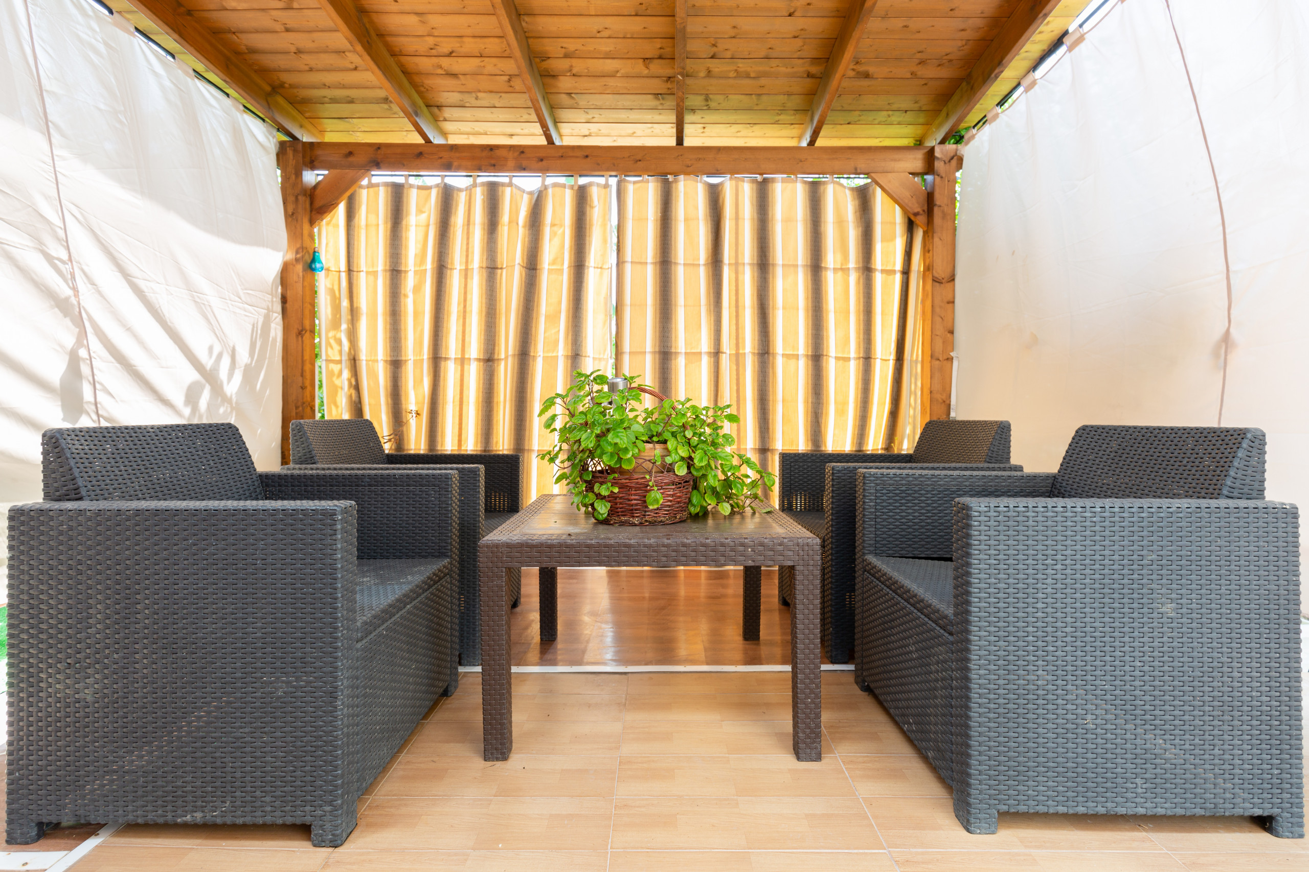 It has a garden, garden furniture, fenced plot, 200 m² terrace, barbecue, fireplace, iron, internet access, hairdryer, heat pump heating, air conditioning, private pool, open-air parking in the same building, 1 TV.