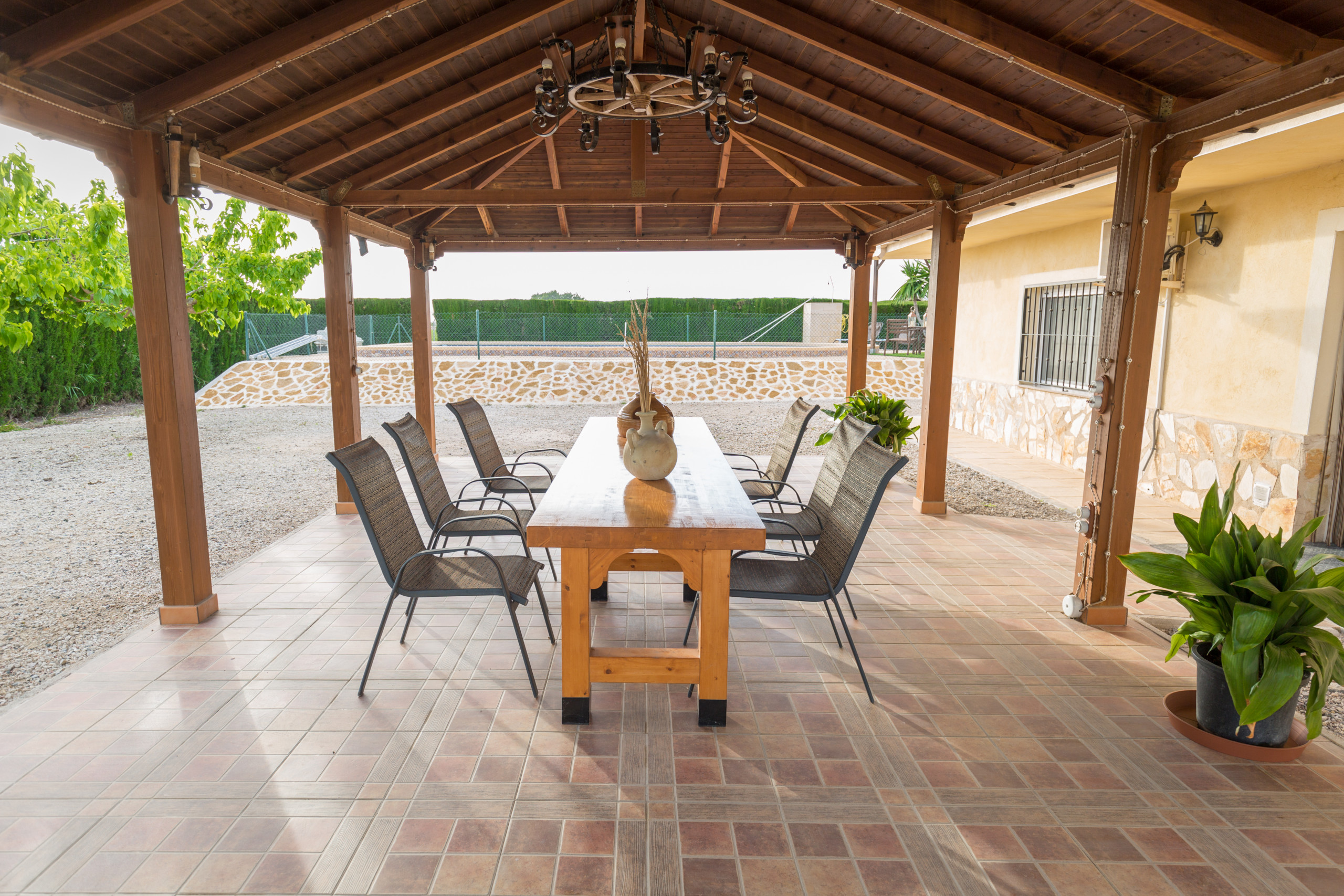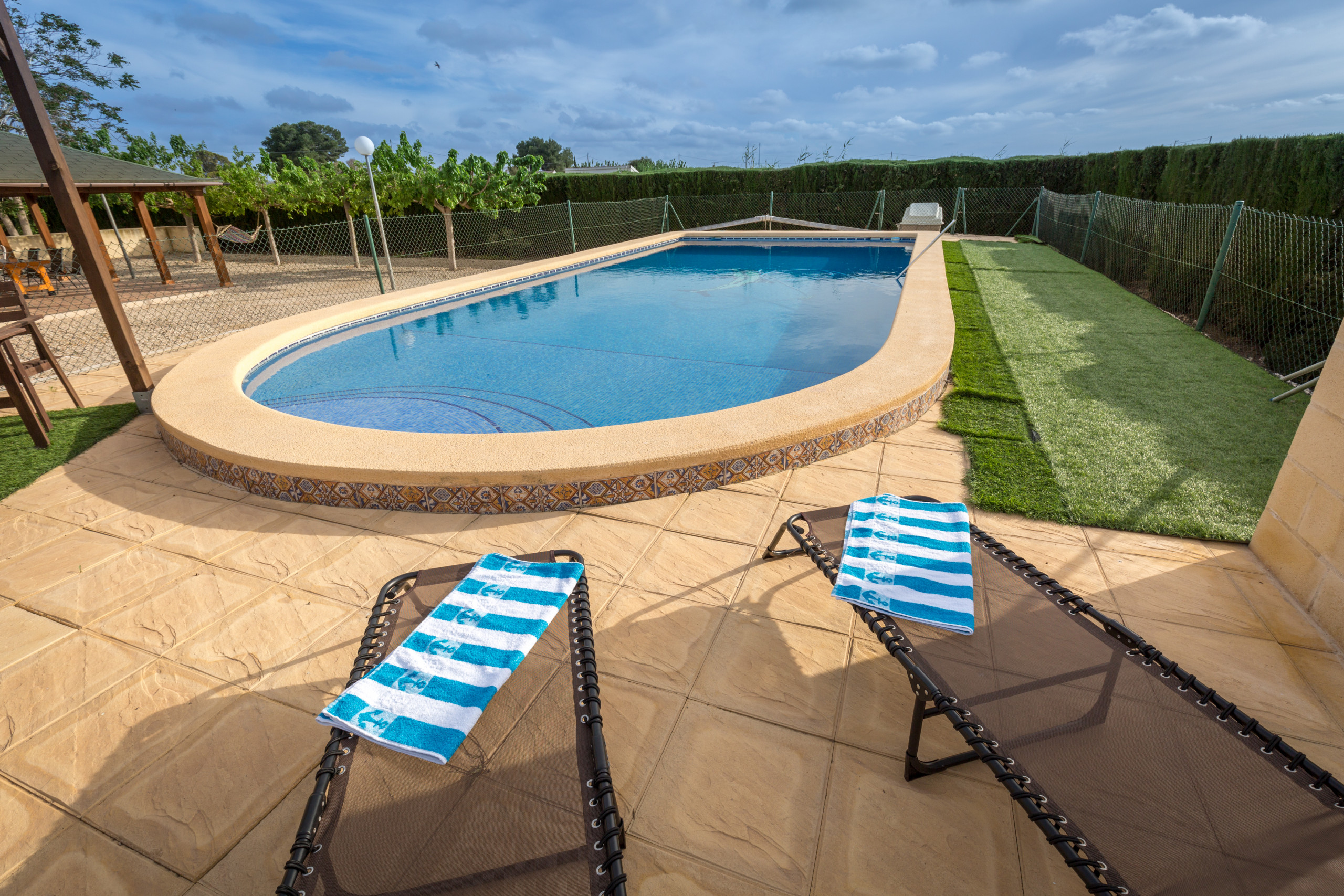 The accommodation is equipped with the following items: garden, garden furniture, fenced garden, terrace, barbecue, fireplace, internet, hair dryer, air conditioning (hot/cold), air-conditioned, swimming pool private, open-air parking in the same building, TV.
