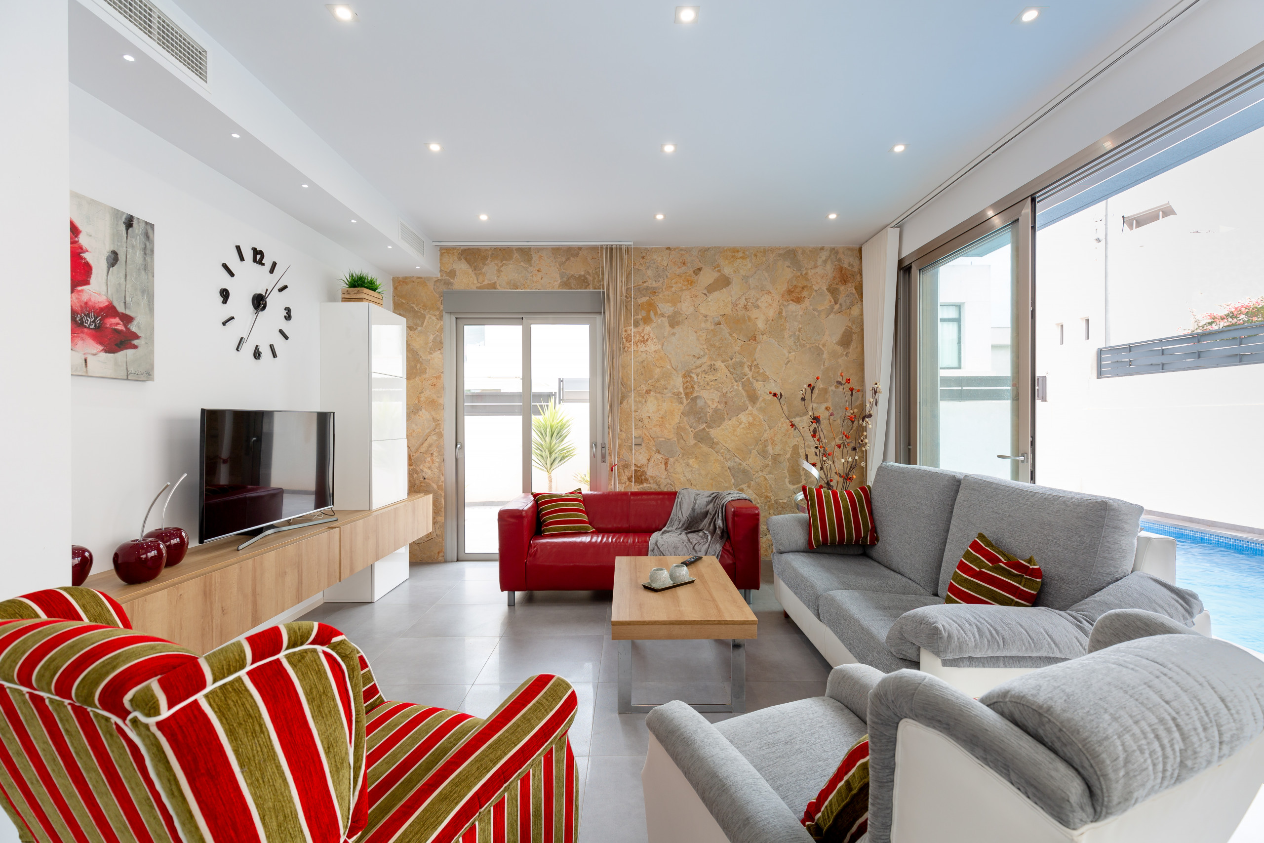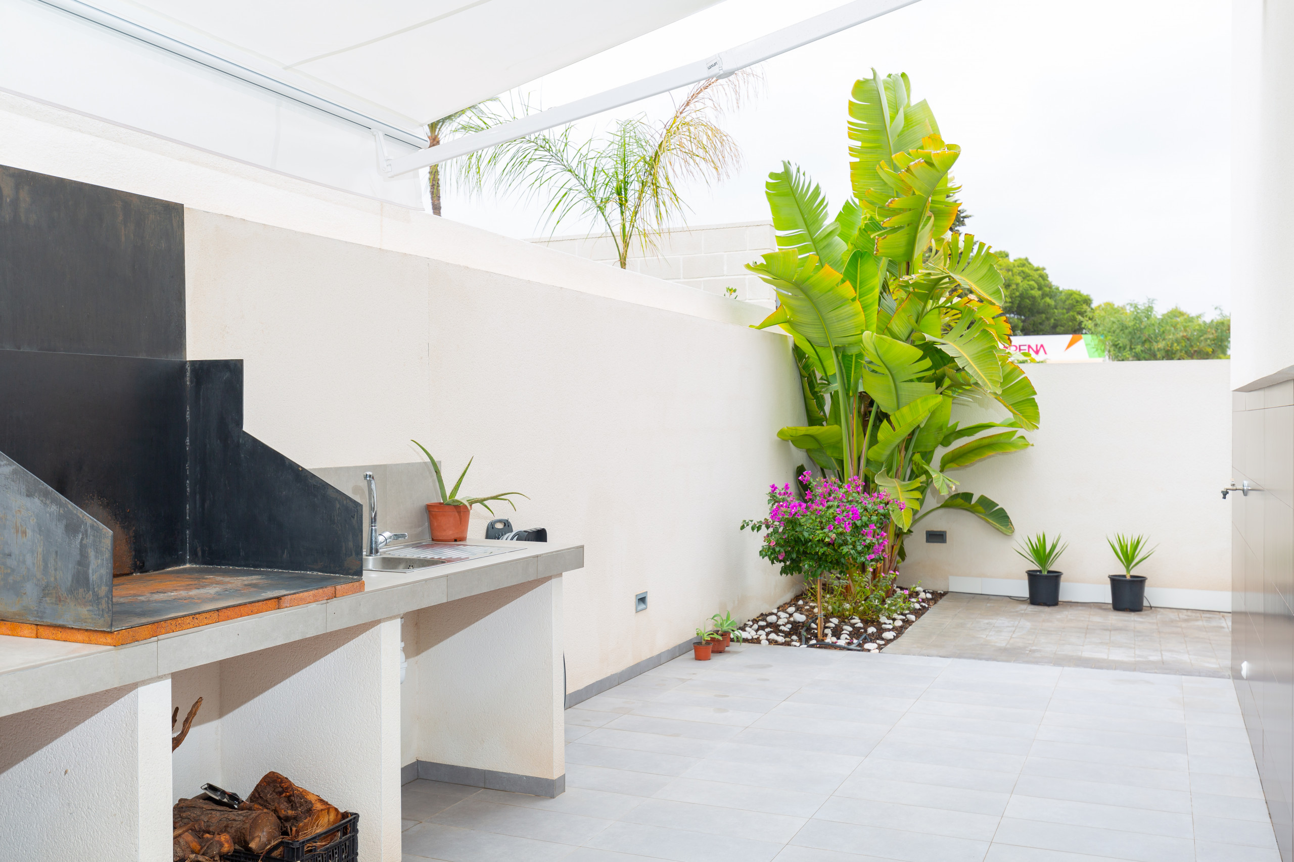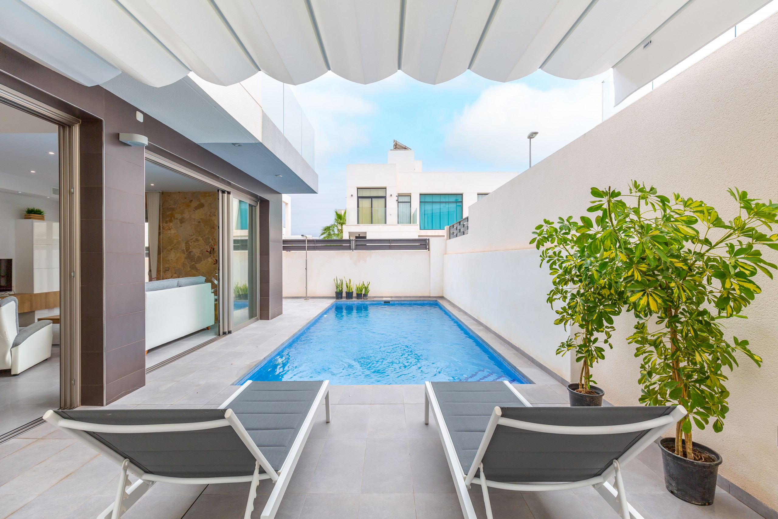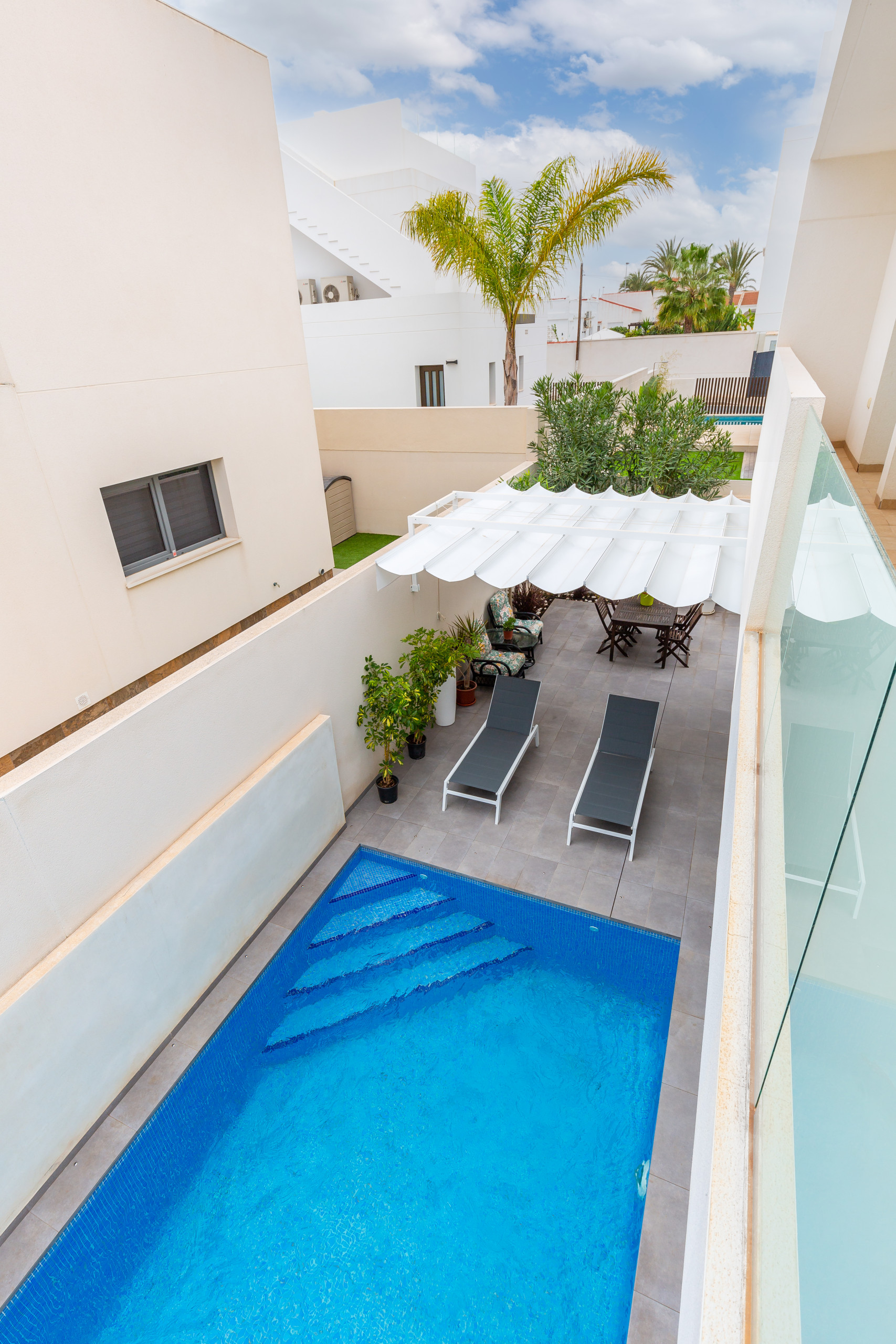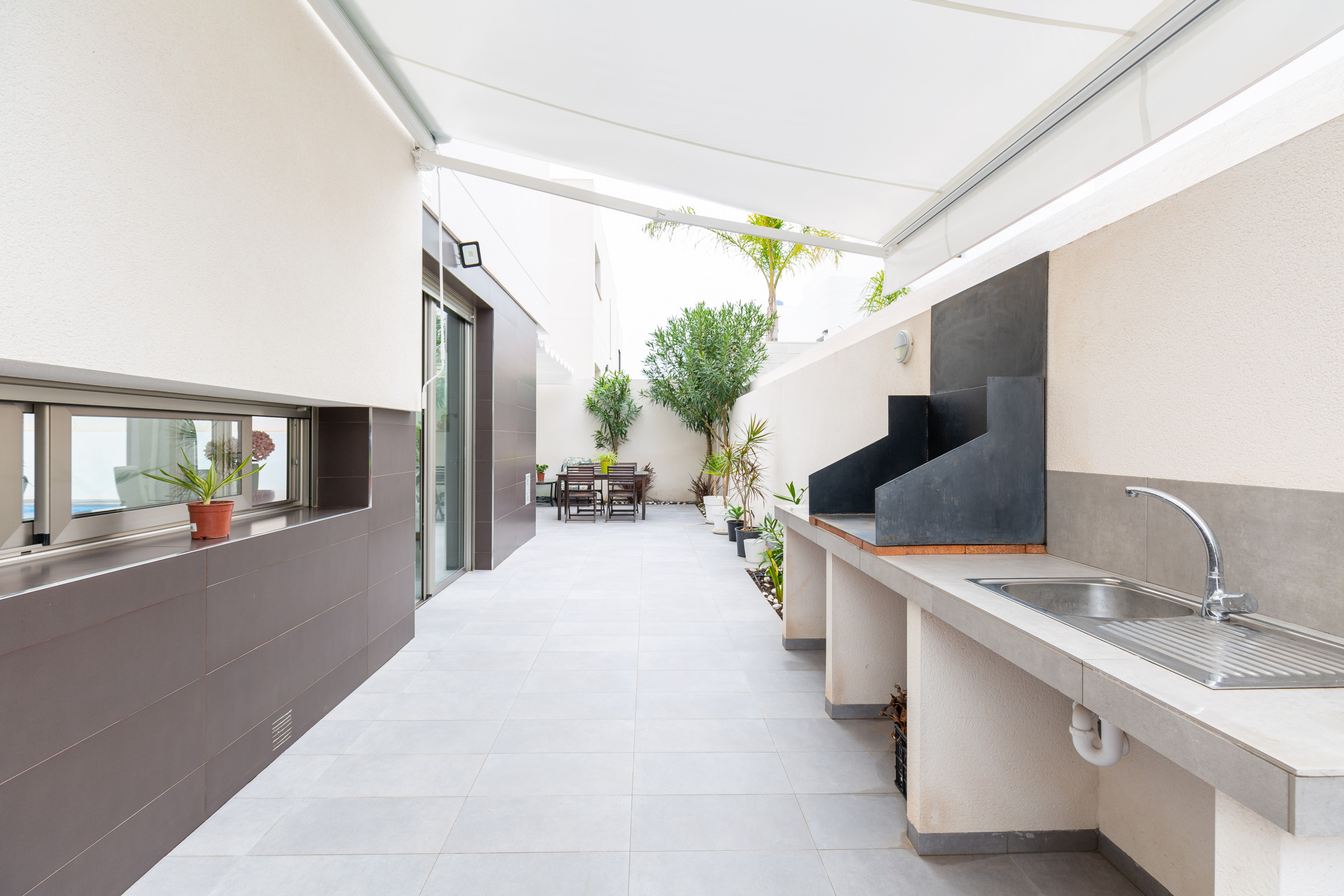 The villa is tastefully-furnished, is a new build, and is 175 m². It has views of the garden and the swimming pool.