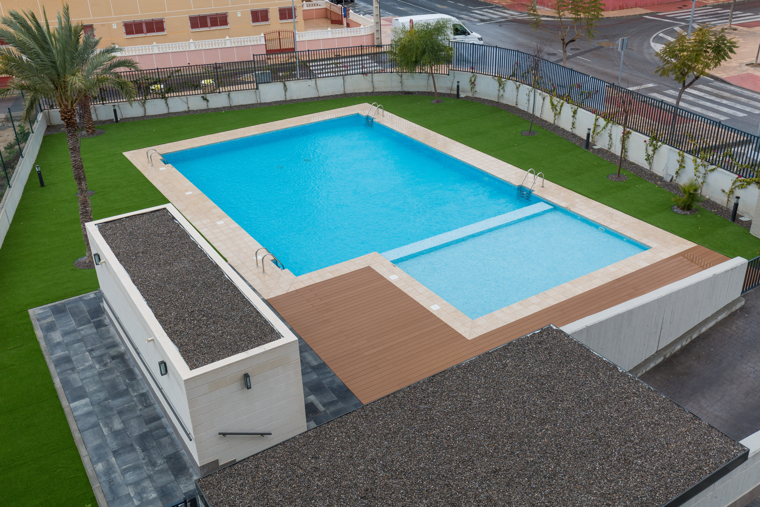 Newly built, 75 m² well furnished apartment with views of the pool.