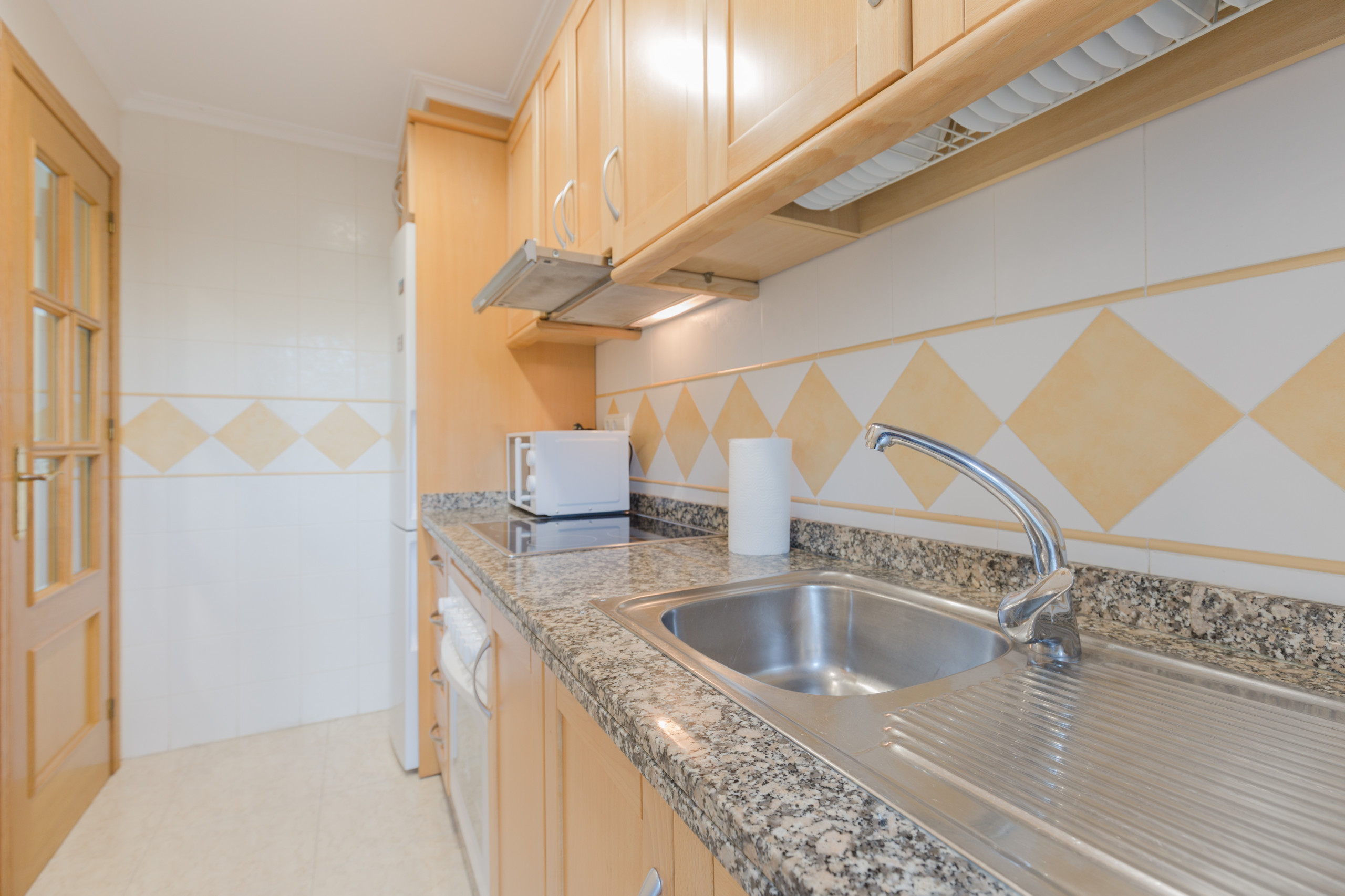 In the vitroceramic independent kitchen, refrigerator, microwave, oven, freezer, washing machine, dishes/cutlery, kitchen utensils, coffee machine, toaster, kettle and juicer are provided.