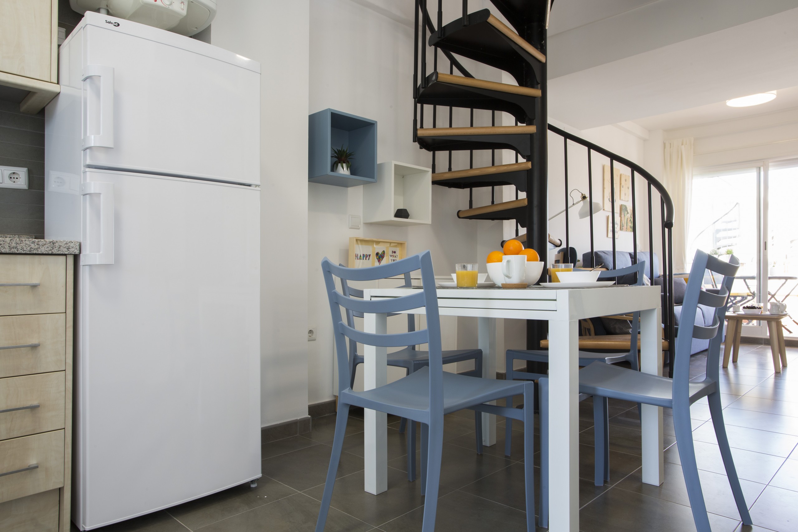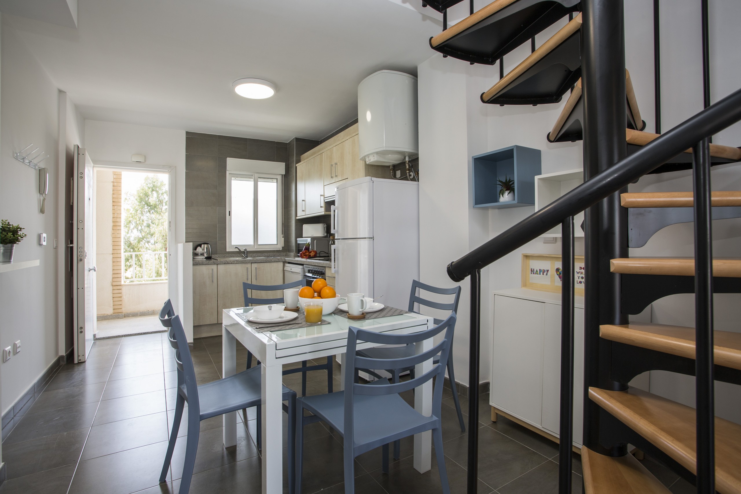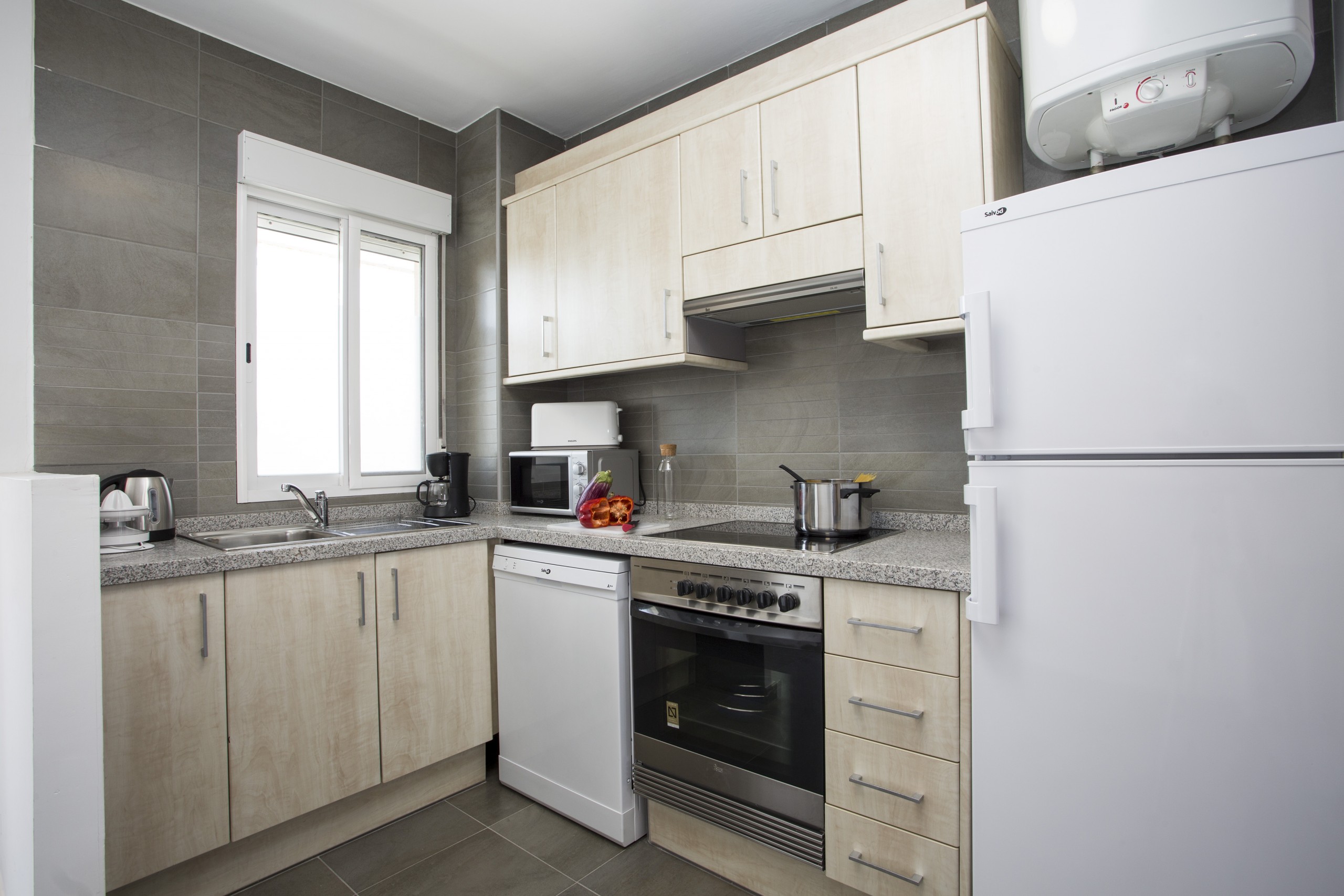 In the vitroceramic open plan kitchen, refrigerator, microwave, oven, freezer, washing machine, dishwasher, dishes/cutlery, kitchen utensils, coffee machine, toaster, kettle and juicer are provided.