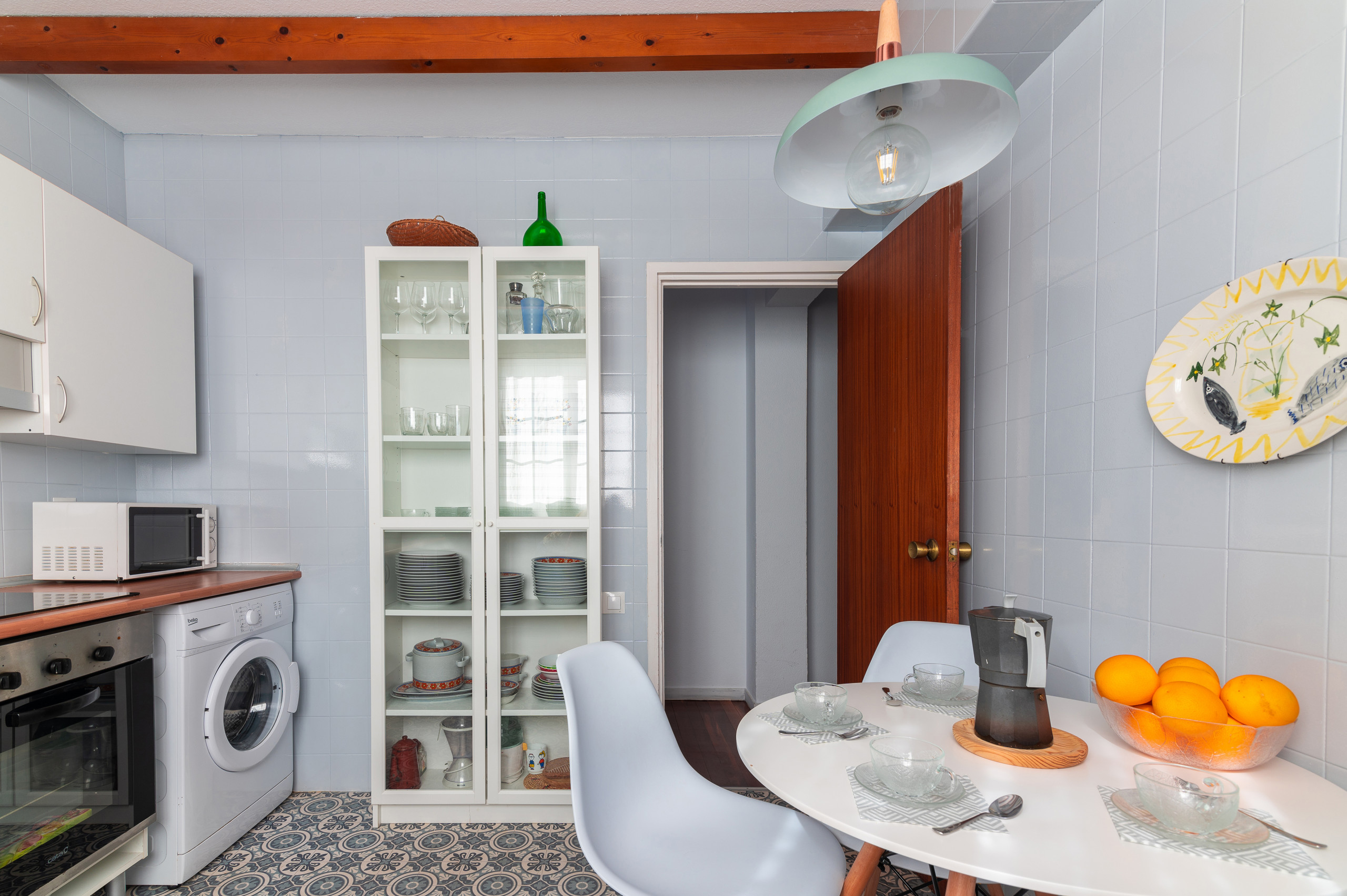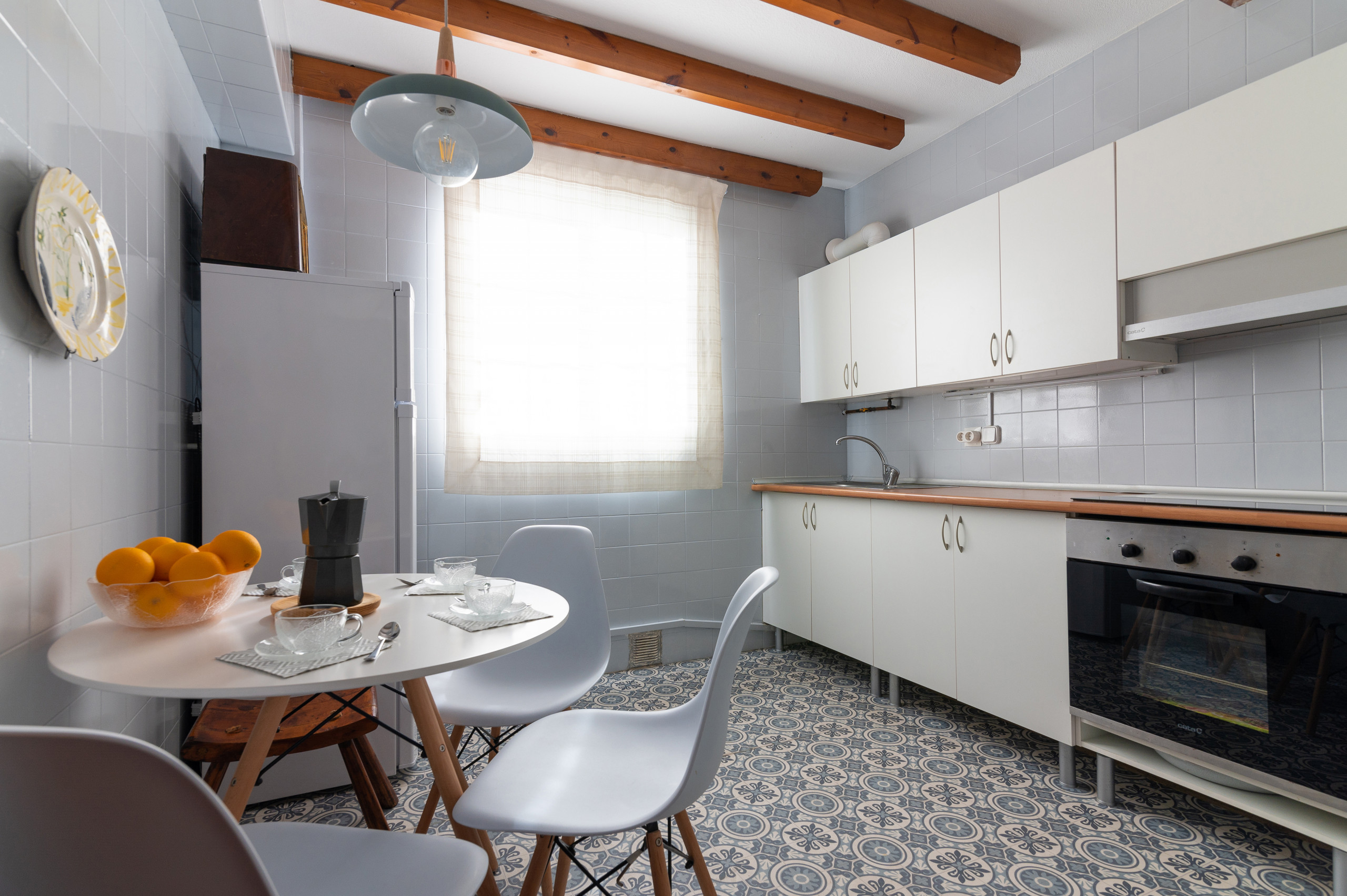 In the vitroceramic independent kitchen, refrigerator, microwave, oven, freezer, washing machine, dishes/cutlery, kitchen utensils, coffee machine, toaster, kettle and juicer are provided.
