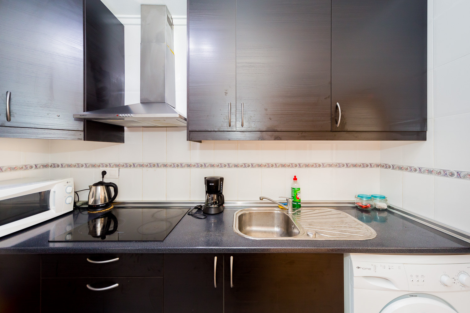 The apartment includes furniture, appliances, coffee maker, crockery, bedding and towels. The living room is equipped with remote controlled air conditioning. Spanish TV is also available.