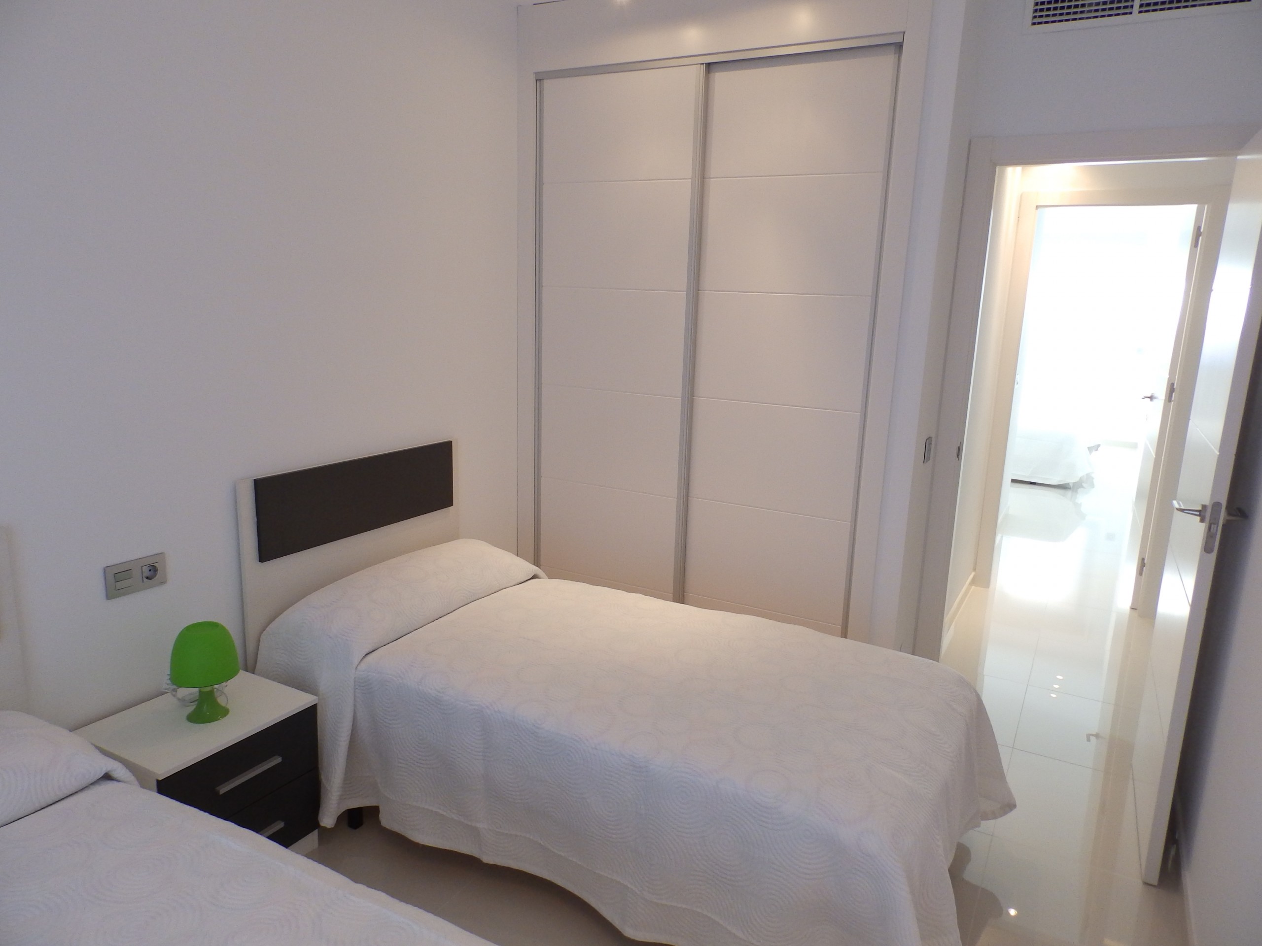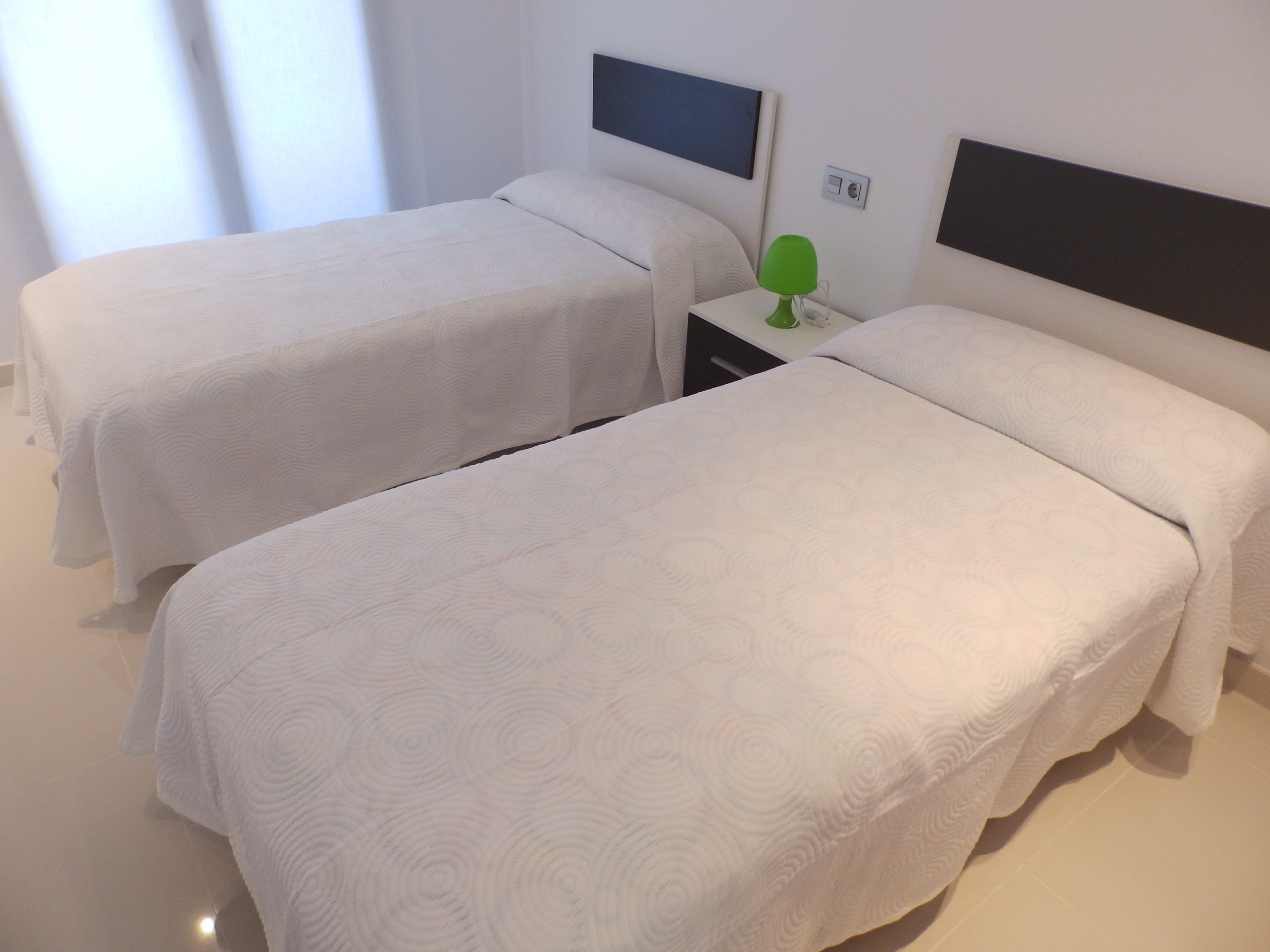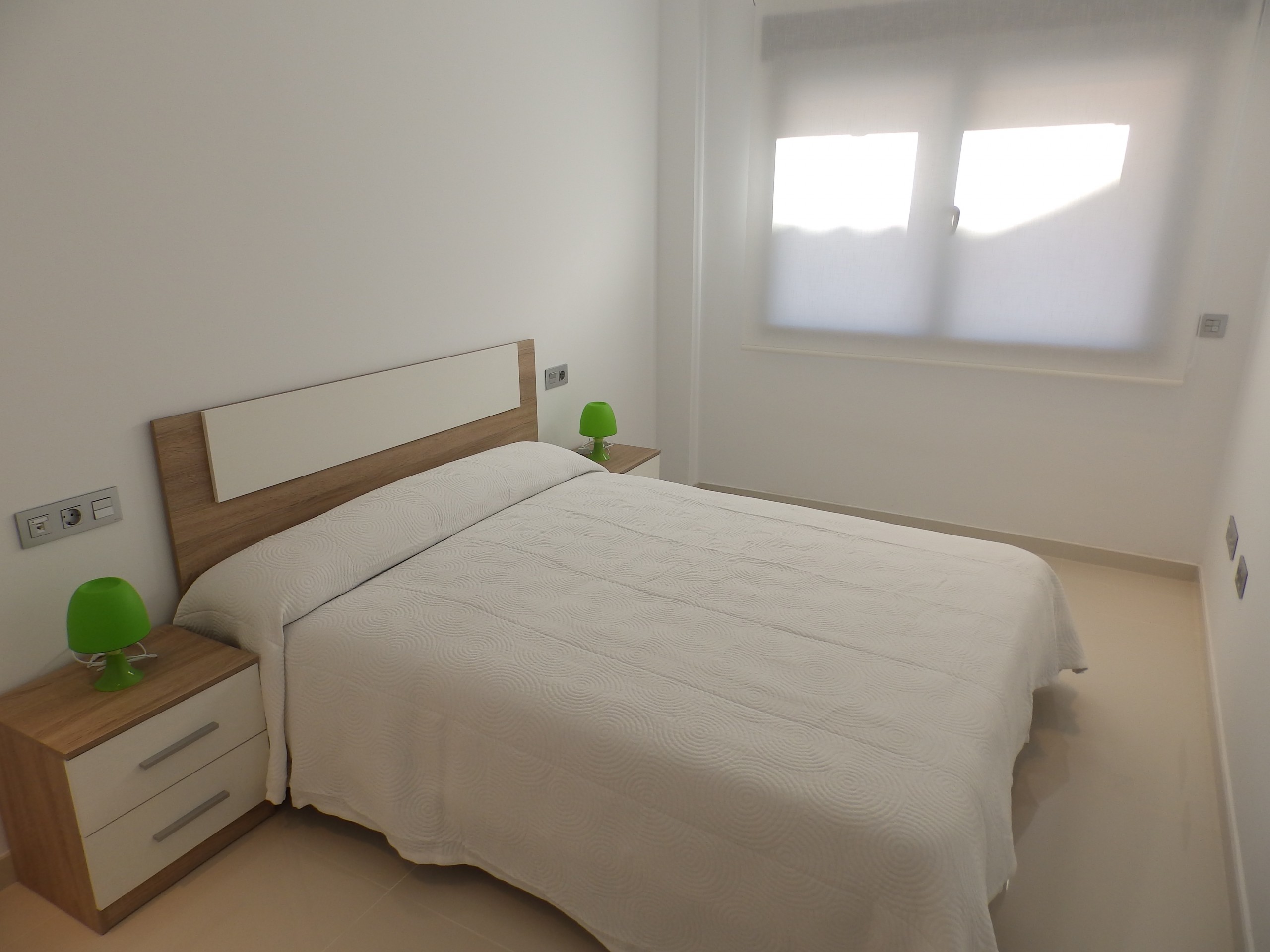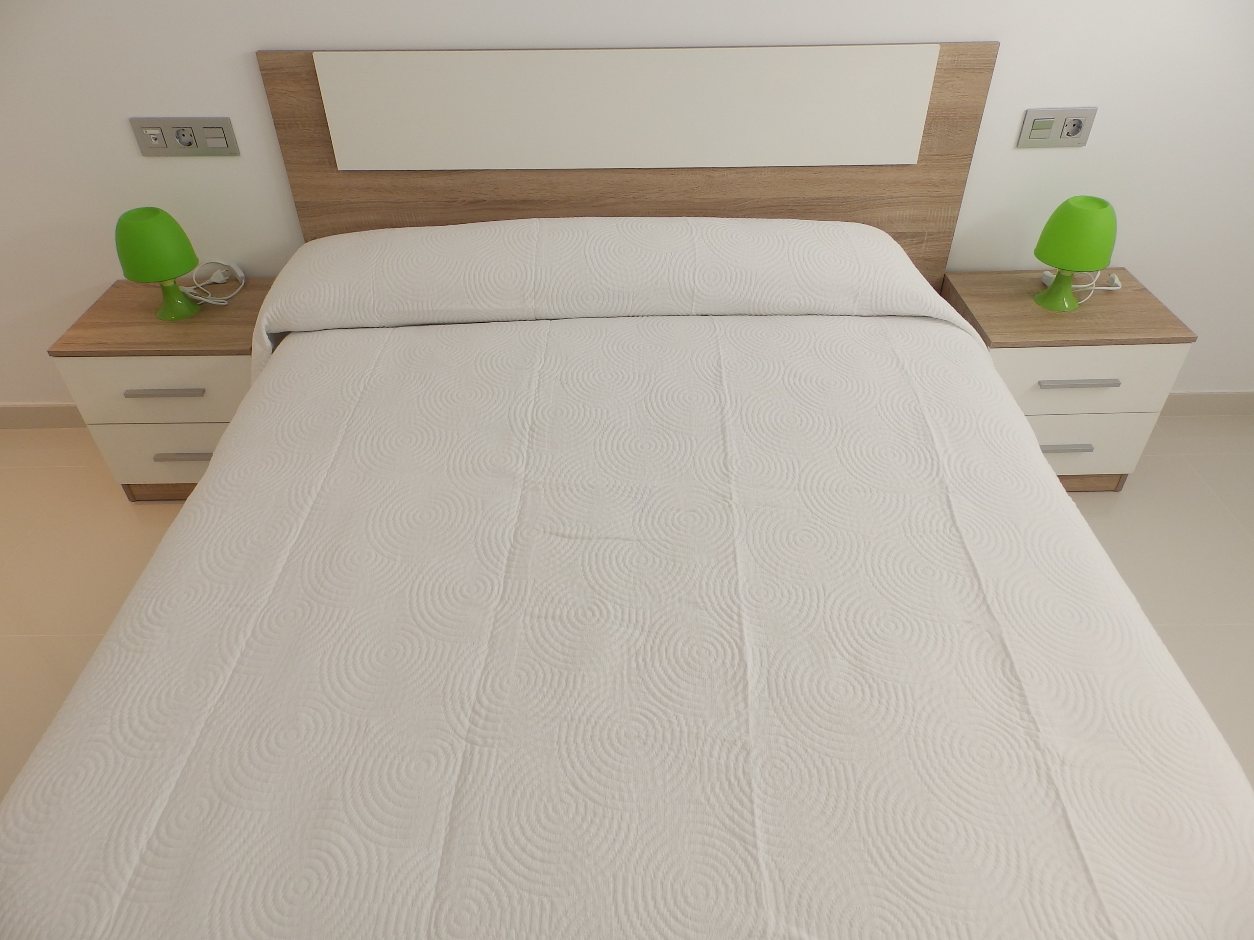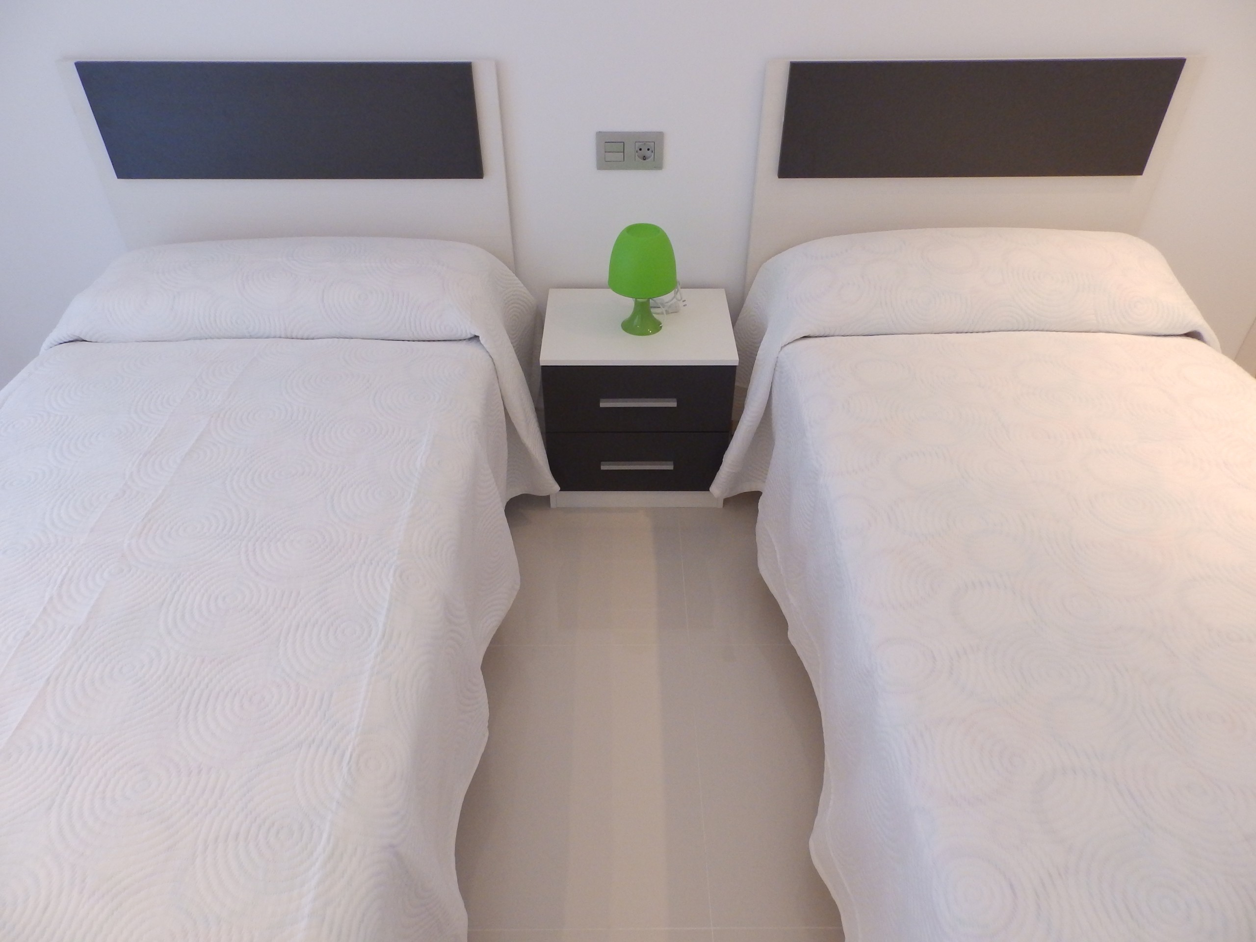 For rent a two bedroom apartment in a modern complex built in 2015 called Residencial Alegría 1. The area of the apartment is 75 m2 and consists of two bedrooms, spacious and bright and airy lounge, American-style kitchen, two bathrooms, balcony and terrace overlooking the communal swimming pool. The apartment is equipped with furniture, household appliances (including dishwasher), central air conditioning, kitchen utensils, linens and towels. Spanish television is available. It features a saltwater communal swimming pool and Jacuzzi, sauna, sports and children's playground, solarium and barbecue area on the rooftop. It is within walking distance of many bars, restaurants and all local amenities. It is approximately a 6 minute’s walk to the blue flag beaches of Los Locos and Del Cura. It sleeps up to five people. Pets are not allowed and smoking is only permitted on the terrace or in the solarium.