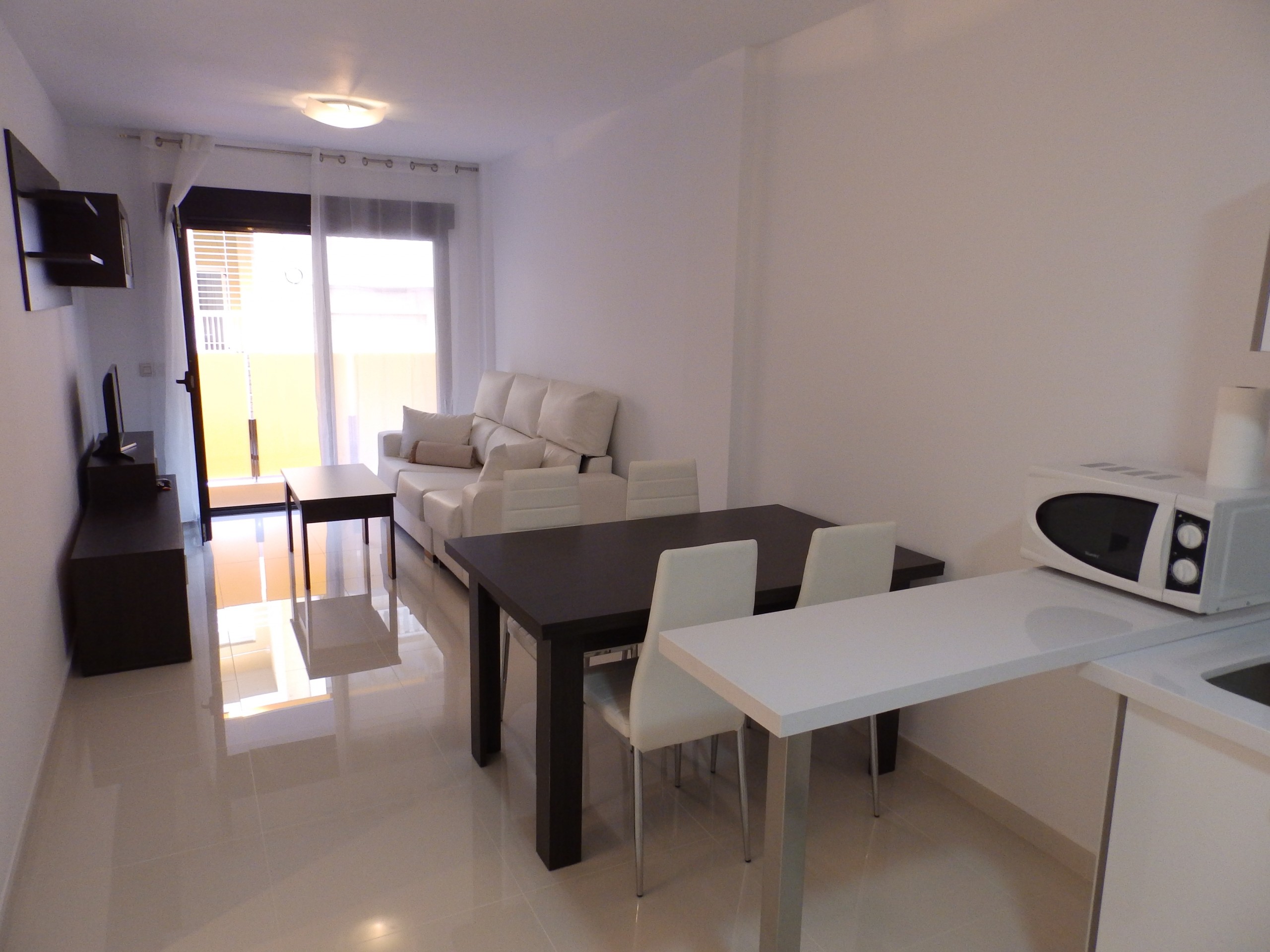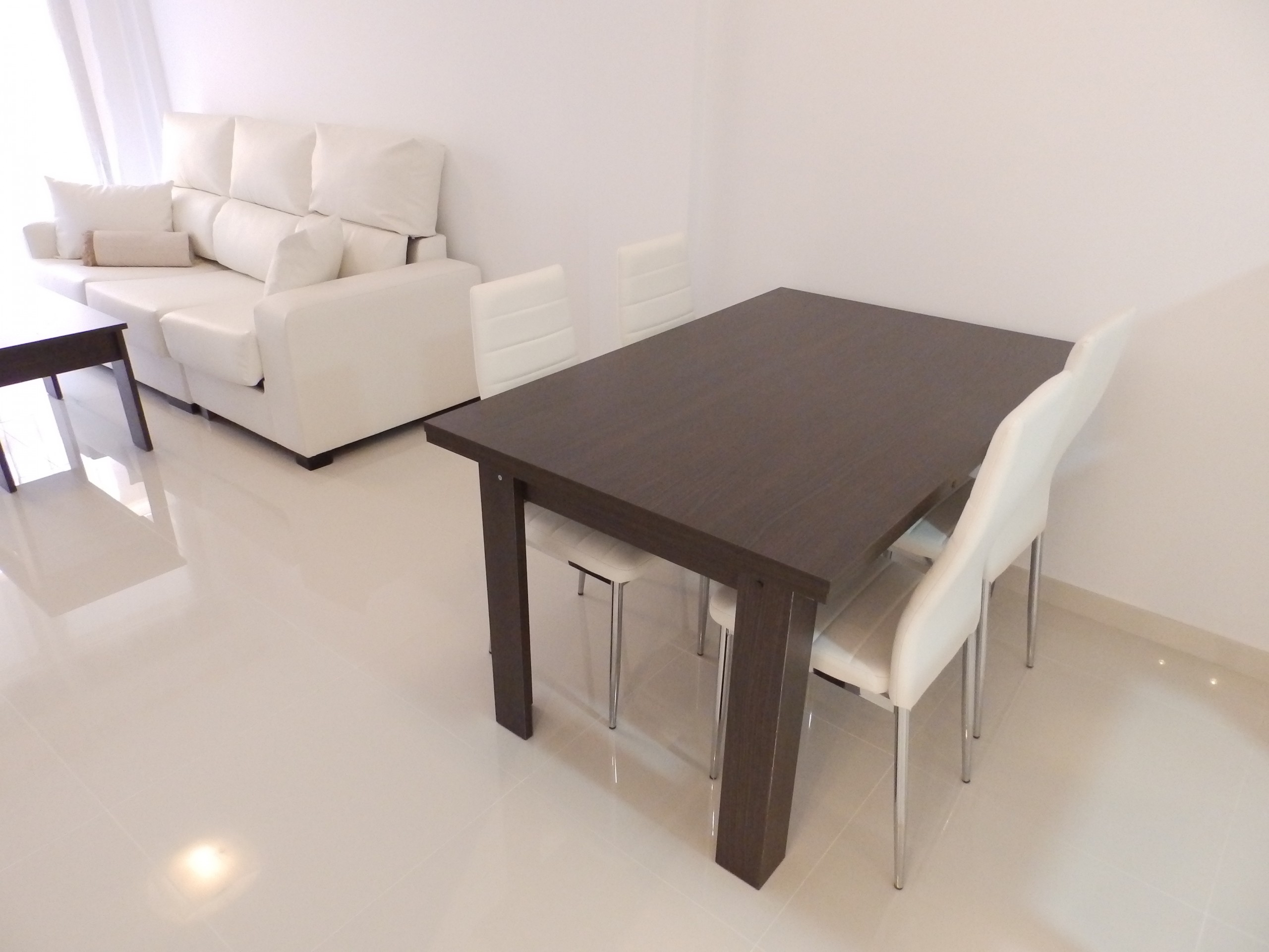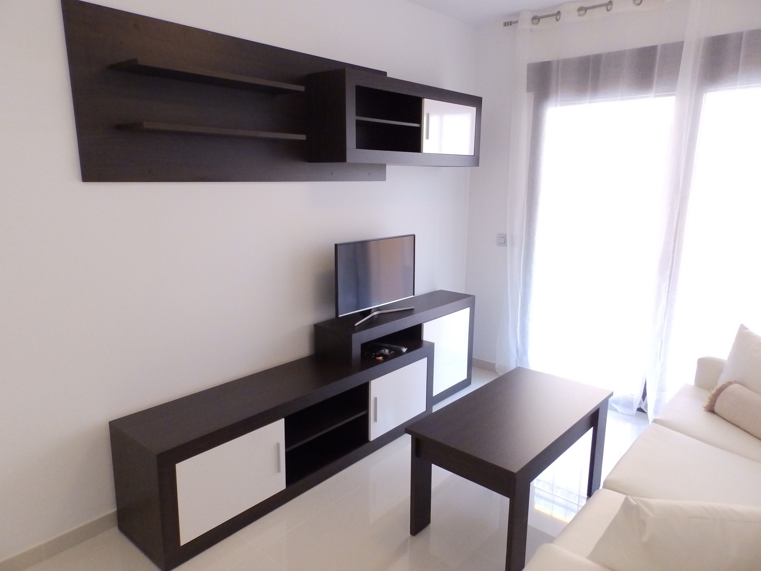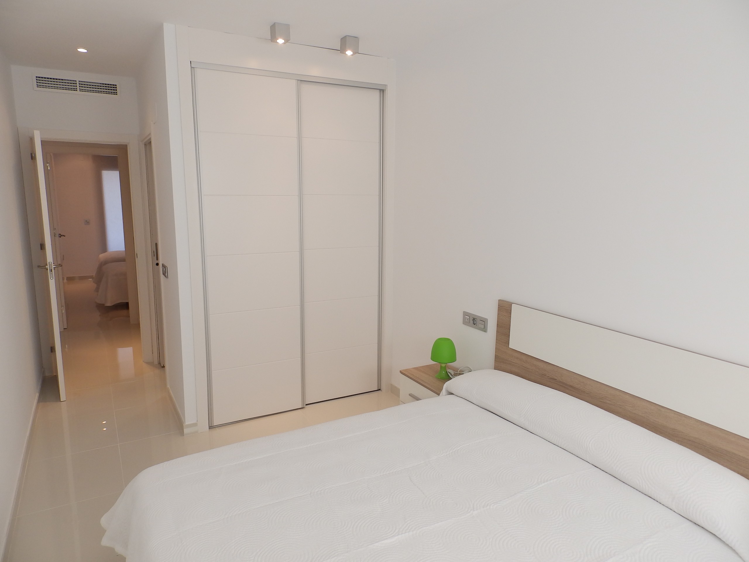 For rent a two bedroom apartment in a modern complex built in 2015 called Residencial Alegría 1. The area of the apartment is 75 m2 and consists of two bedrooms, spacious and bright and airy lounge, American-style kitchen, two bathrooms, balcony and terrace overlooking the communal swimming pool. The apartment is equipped with furniture, household appliances (including dishwasher), central air conditioning, kitchen utensils, linens and towels. Spanish television is available. It features a saltwater communal swimming pool and Jacuzzi, sauna, sports and children's playground, solarium and barbecue area on the rooftop. It is within walking distance of many bars, restaurants and all local amenities. It is approximately a 6 minute’s walk to the blue flag beaches of Los Locos and Del Cura. It sleeps up to five people. Pets are not allowed and smoking is only permitted on the terrace or in the solarium.
