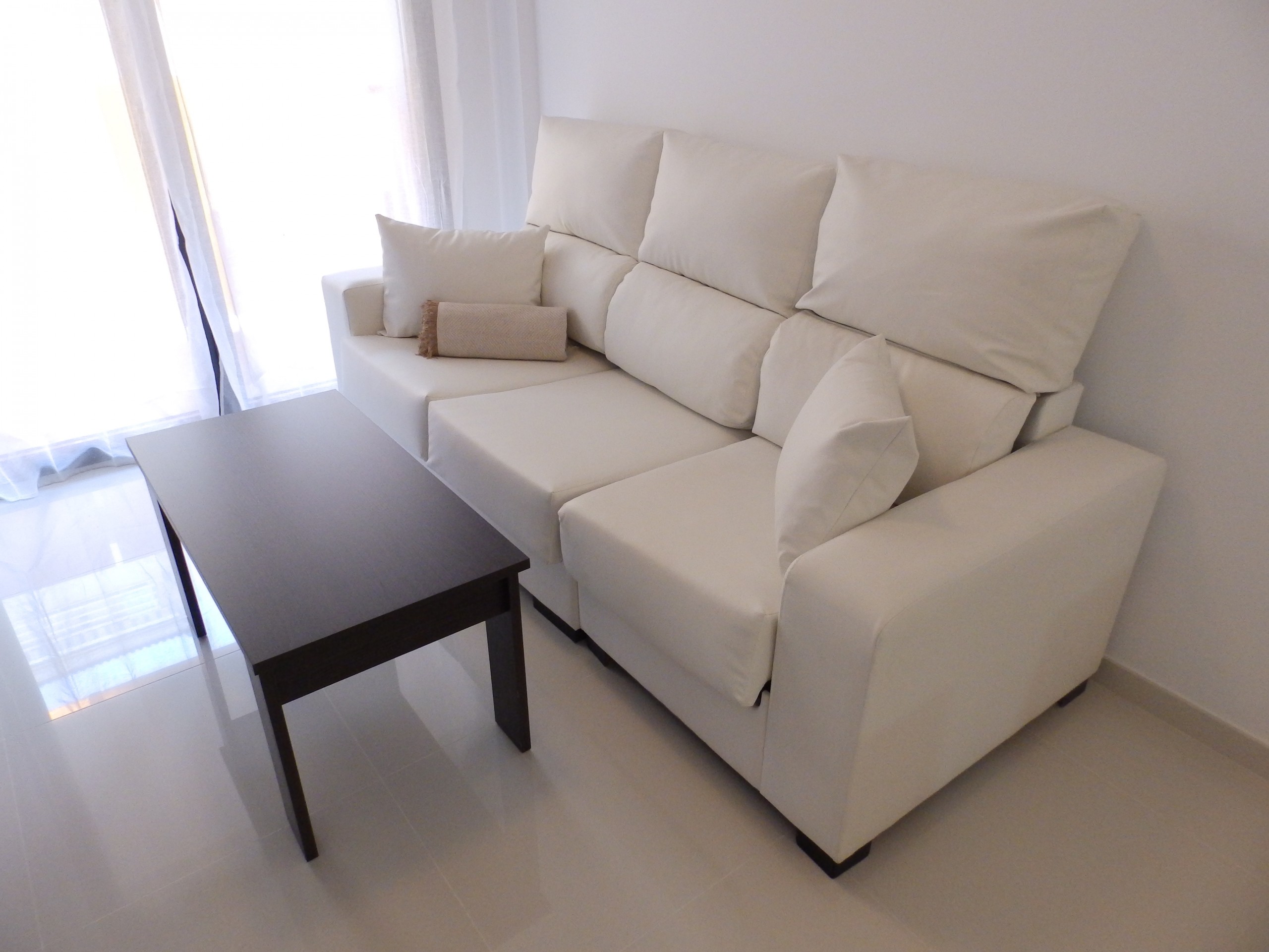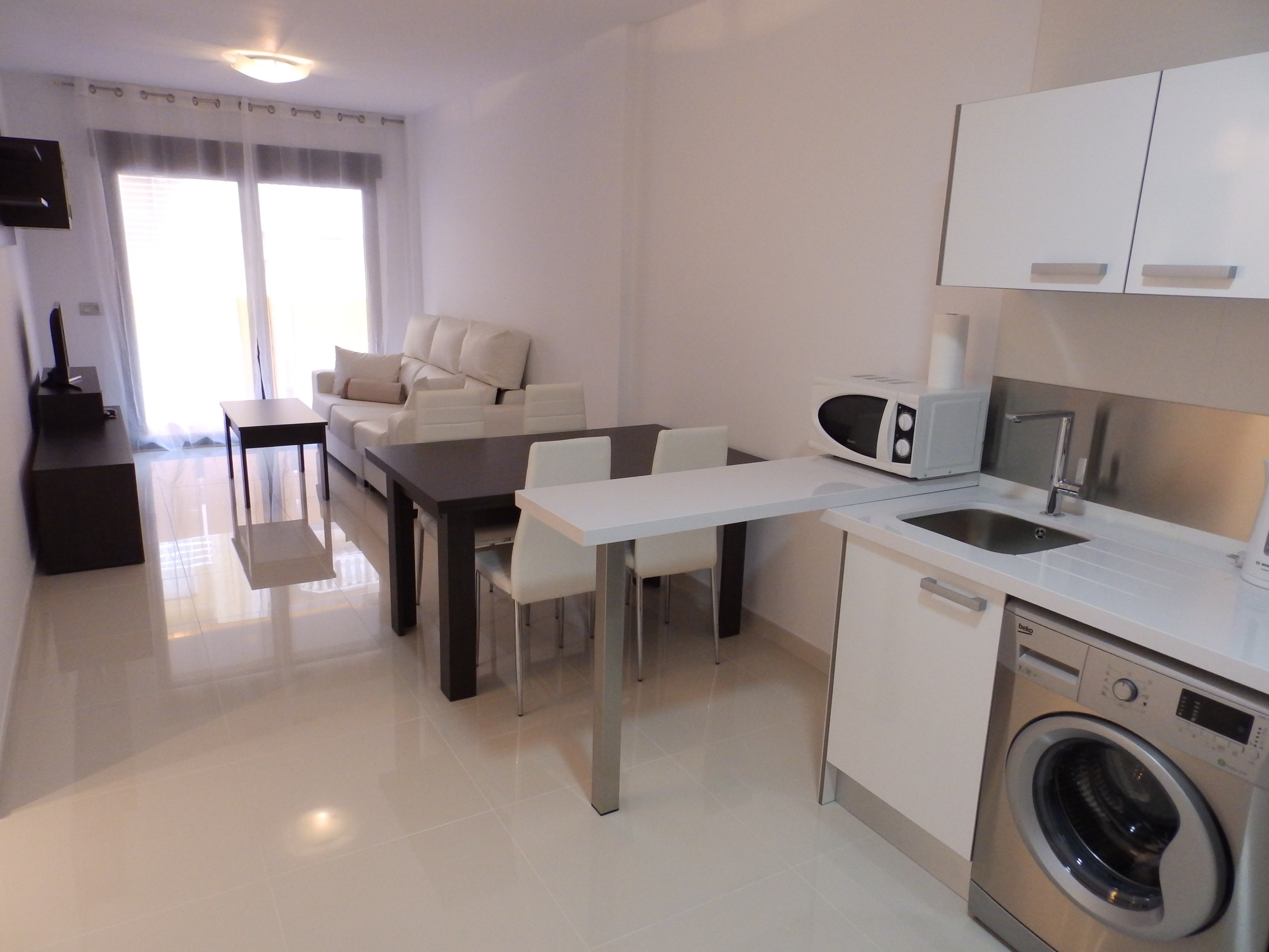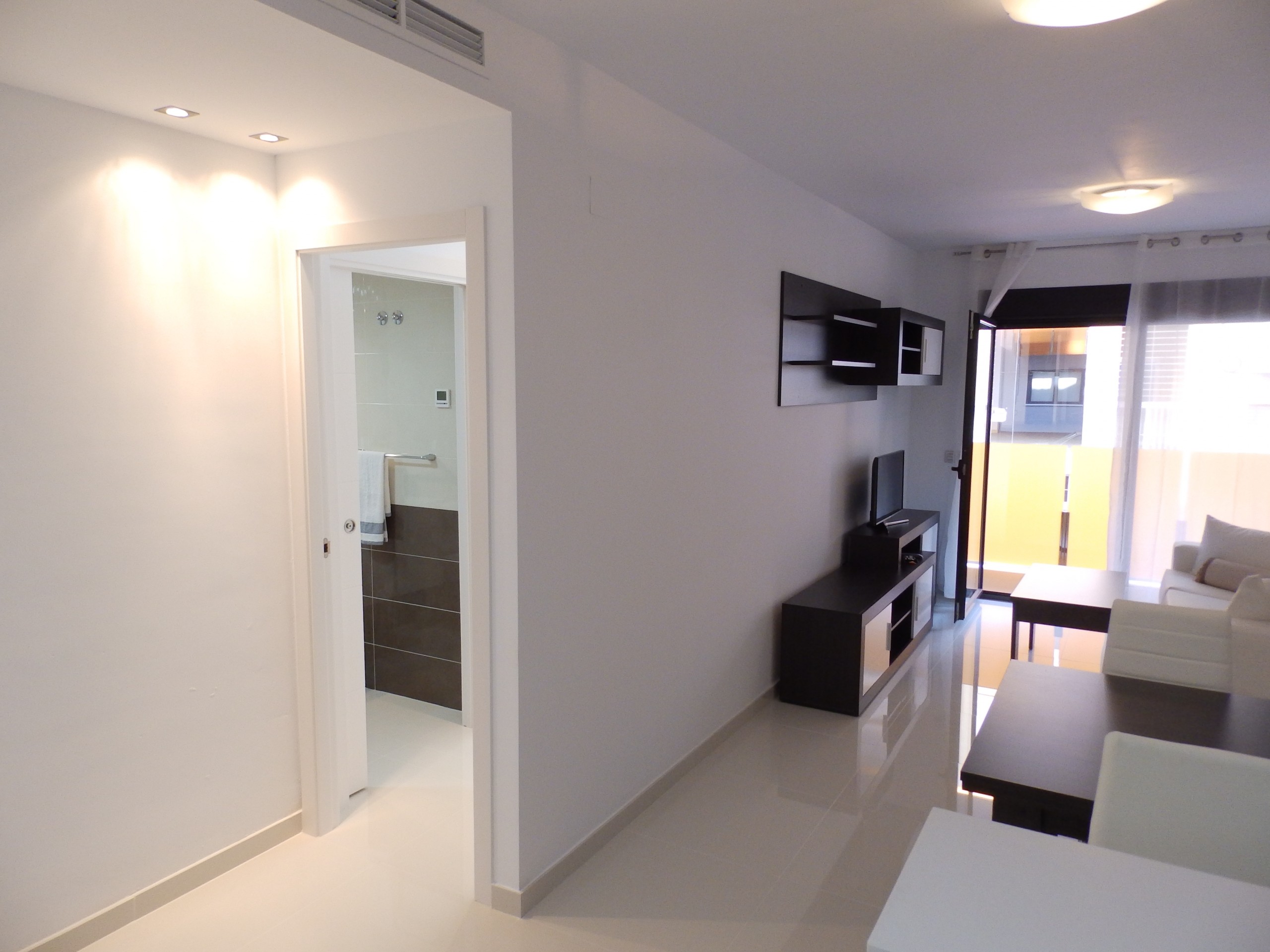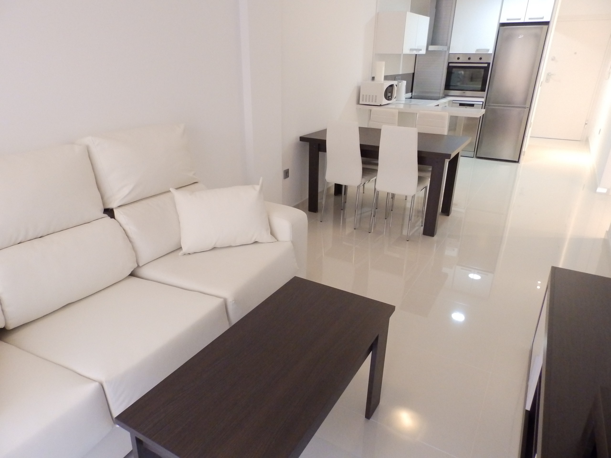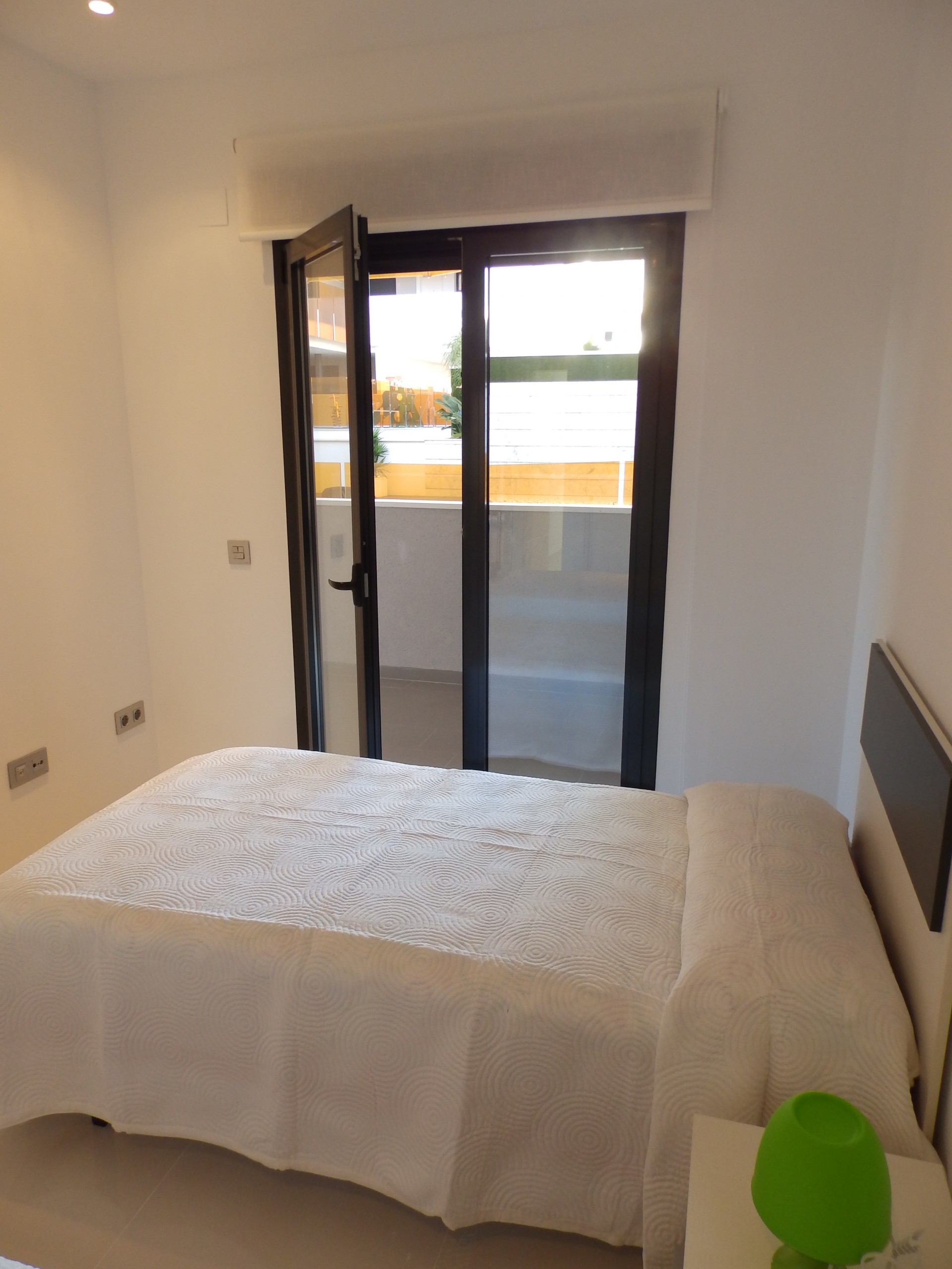 For rent a two bedroom apartment in a modern complex built in 2015 called Residencial Alegría 1. The area of the apartment is 75 m2 and consists of two bedrooms, spacious and bright and airy lounge, American-style kitchen, two bathrooms, balcony and terrace overlooking the communal swimming pool. The apartment is equipped with furniture, household appliances (including dishwasher), central air conditioning, kitchen utensils, linens and towels. Spanish television is available. It features a saltwater communal swimming pool and Jacuzzi, sauna, sports and children's playground, solarium and barbecue area on the rooftop. It is within walking distance of many bars, restaurants and all local amenities. It is approximately a 6 minute’s walk to the blue flag beaches of Los Locos and Del Cura. It sleeps up to five people. Pets are not allowed and smoking is only permitted on the terrace or in the solarium.
