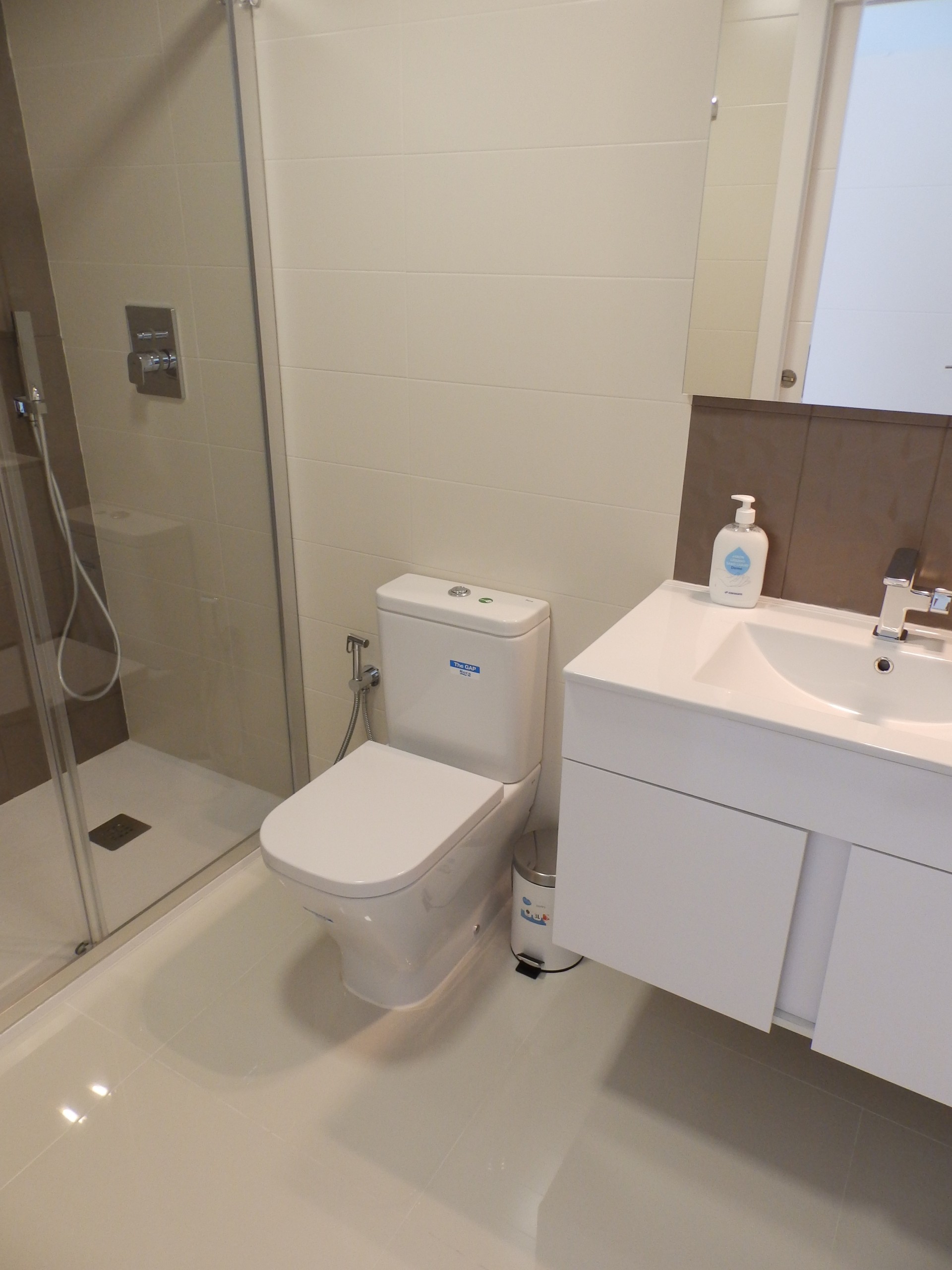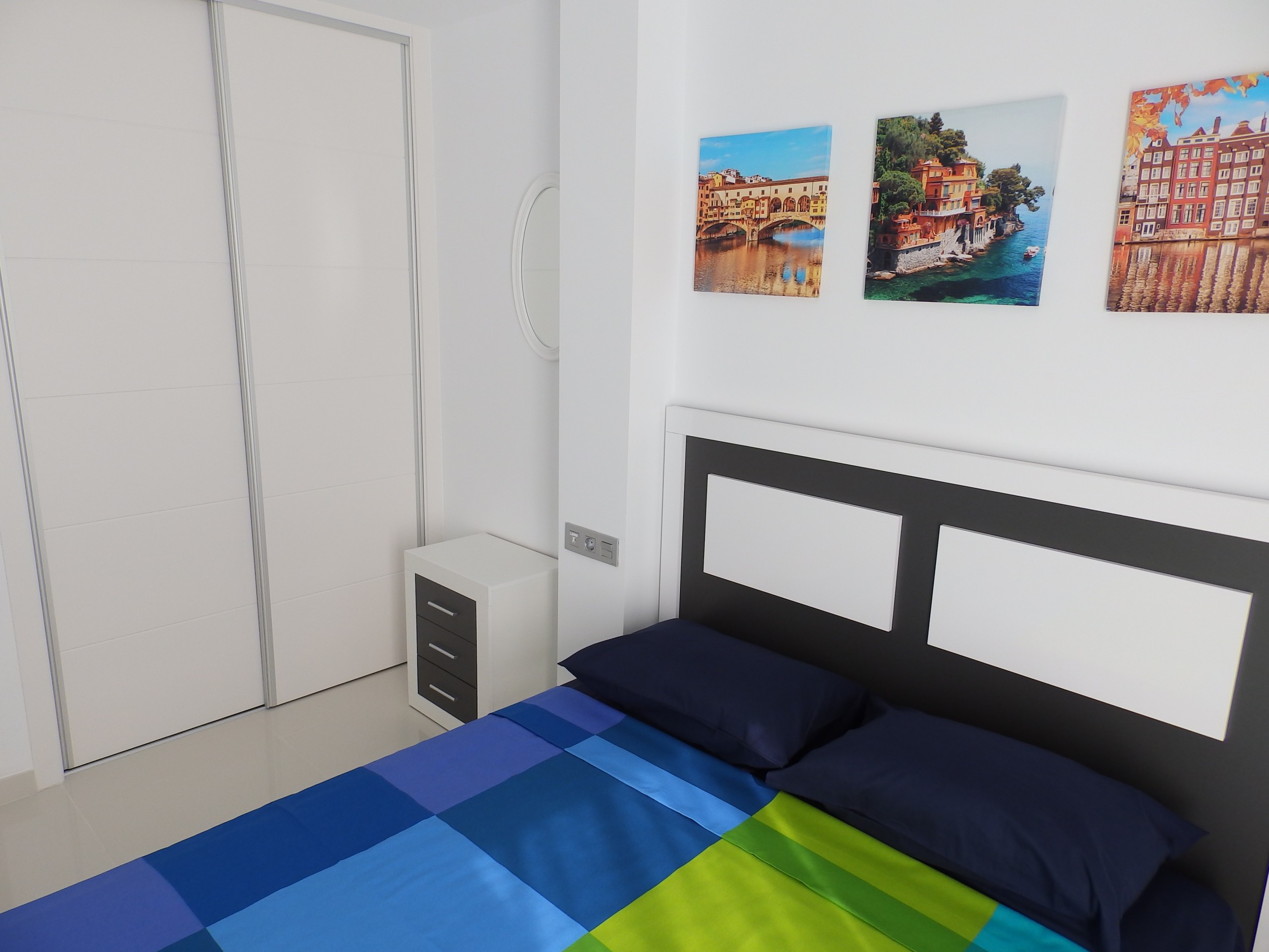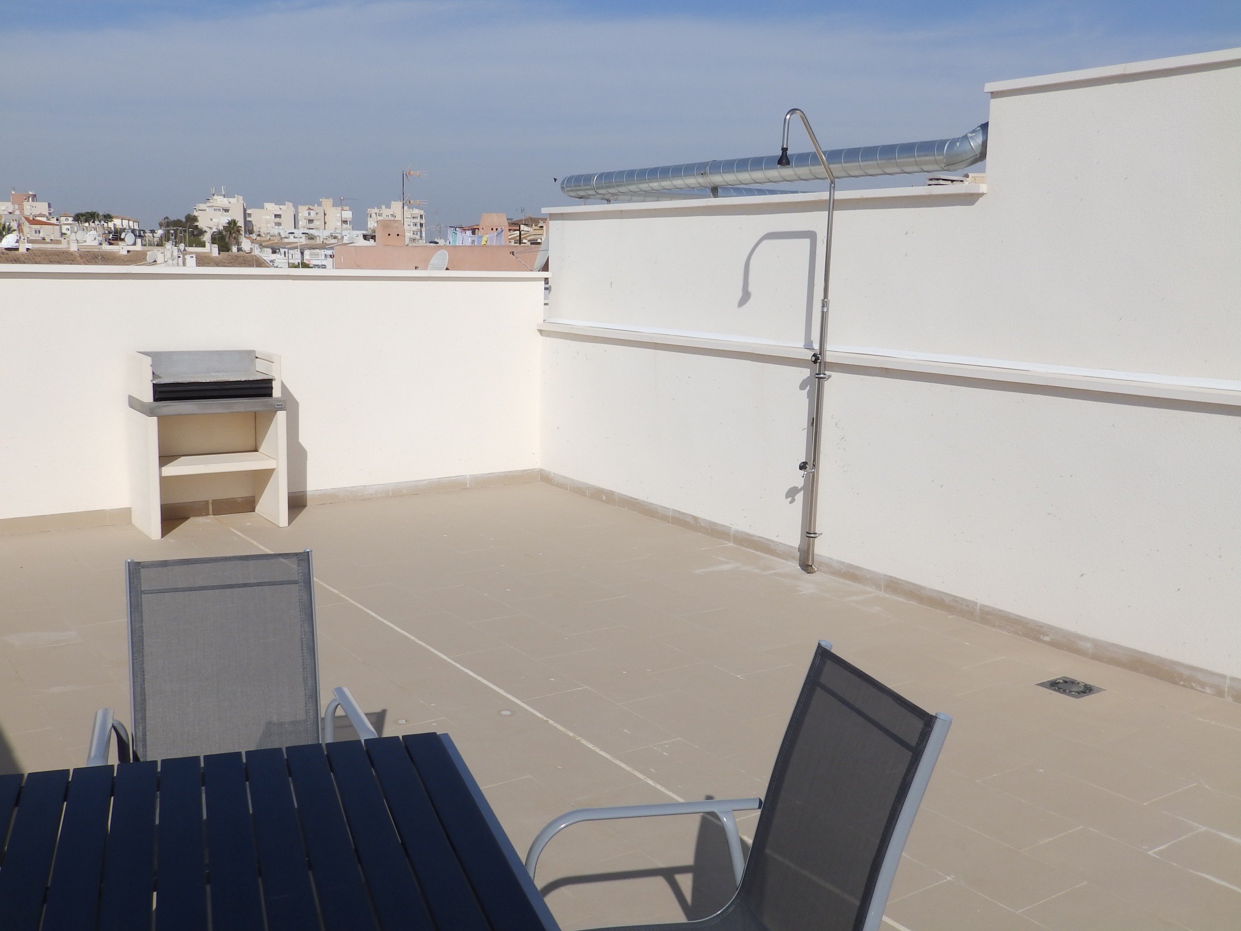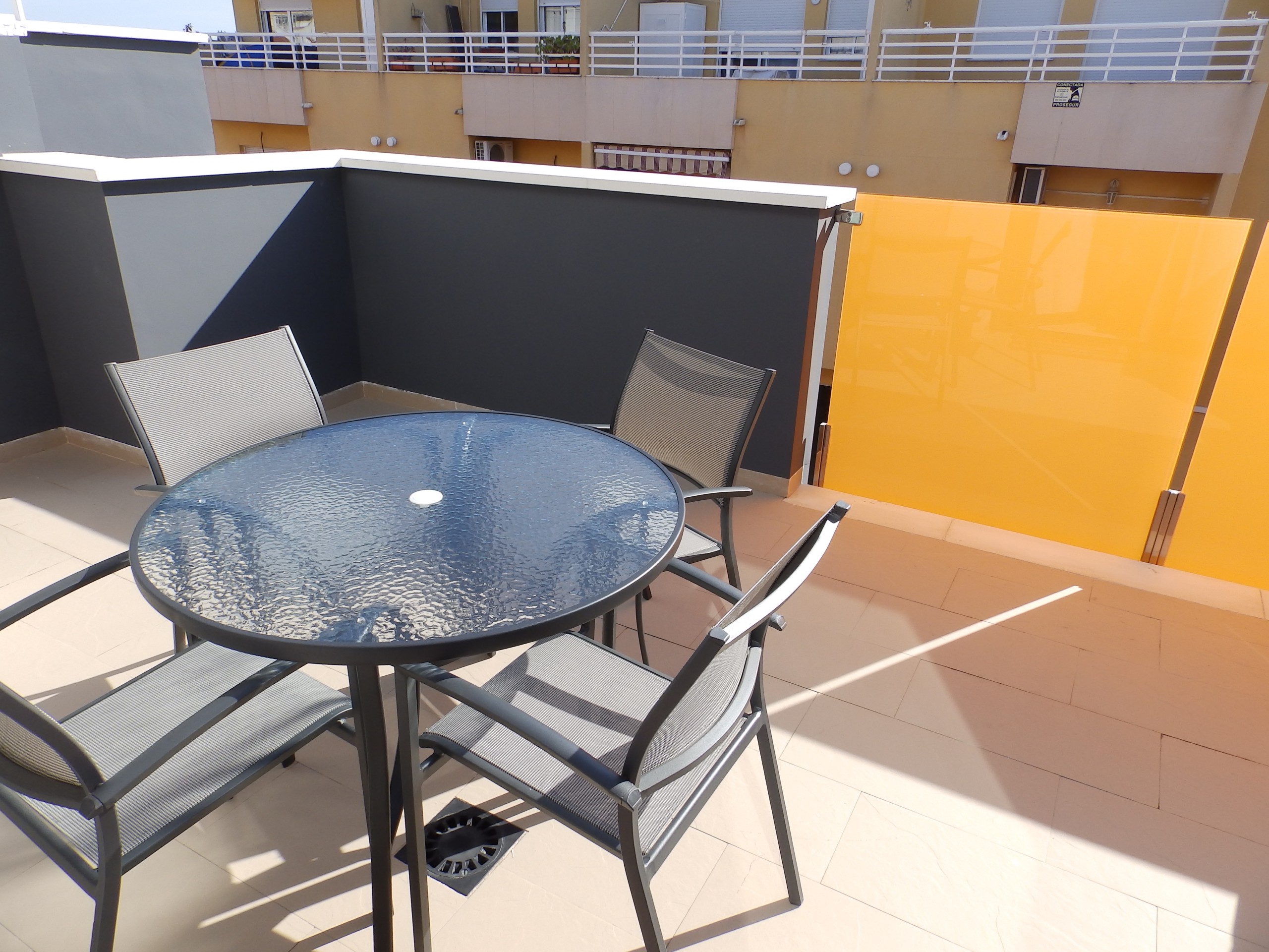 For rent a two bedroom apartment in a modern complex built in 2015 called Residential Algeria 1. It has a terrace and a private solarium of 121sqm. It consists of two bedrooms that are spacious and bright. American-style kitchen, two bathrooms, terrace and private solarium. The terrace has outdoor furniture and sun loungers. Upstairs in the solarium there is also outdoor furniture, barbecue and shower. The apartment is equipped with furniture, household appliances (including dishwasher), central air conditioning, kitchen utensils, linens and towels. Spanish and Russian Television is also available. The complex is gated and features a saltwater pool and Jacuzzi, sauna, sports and children's playground. There is a private parking space in the underground garage included in the rental.