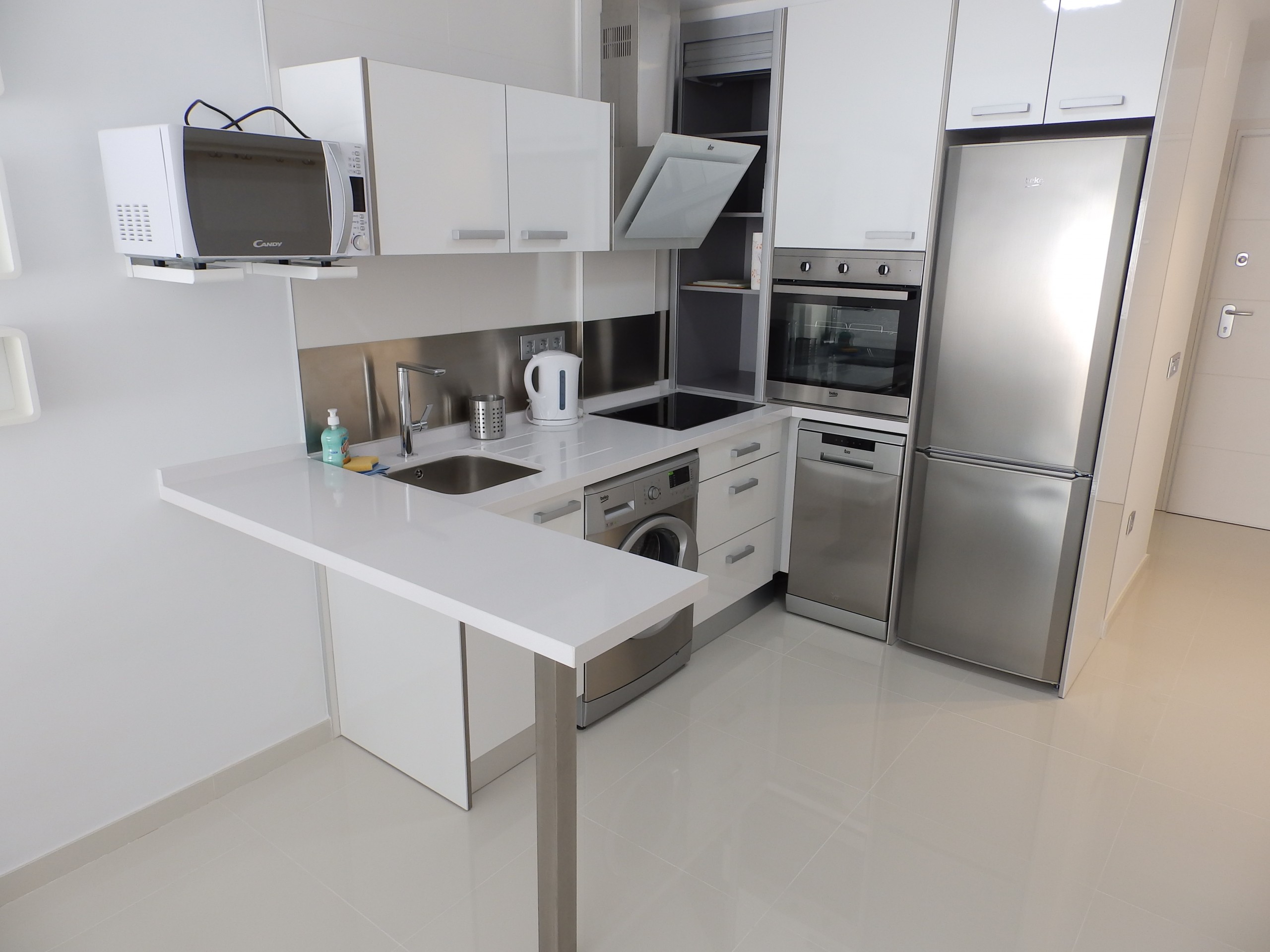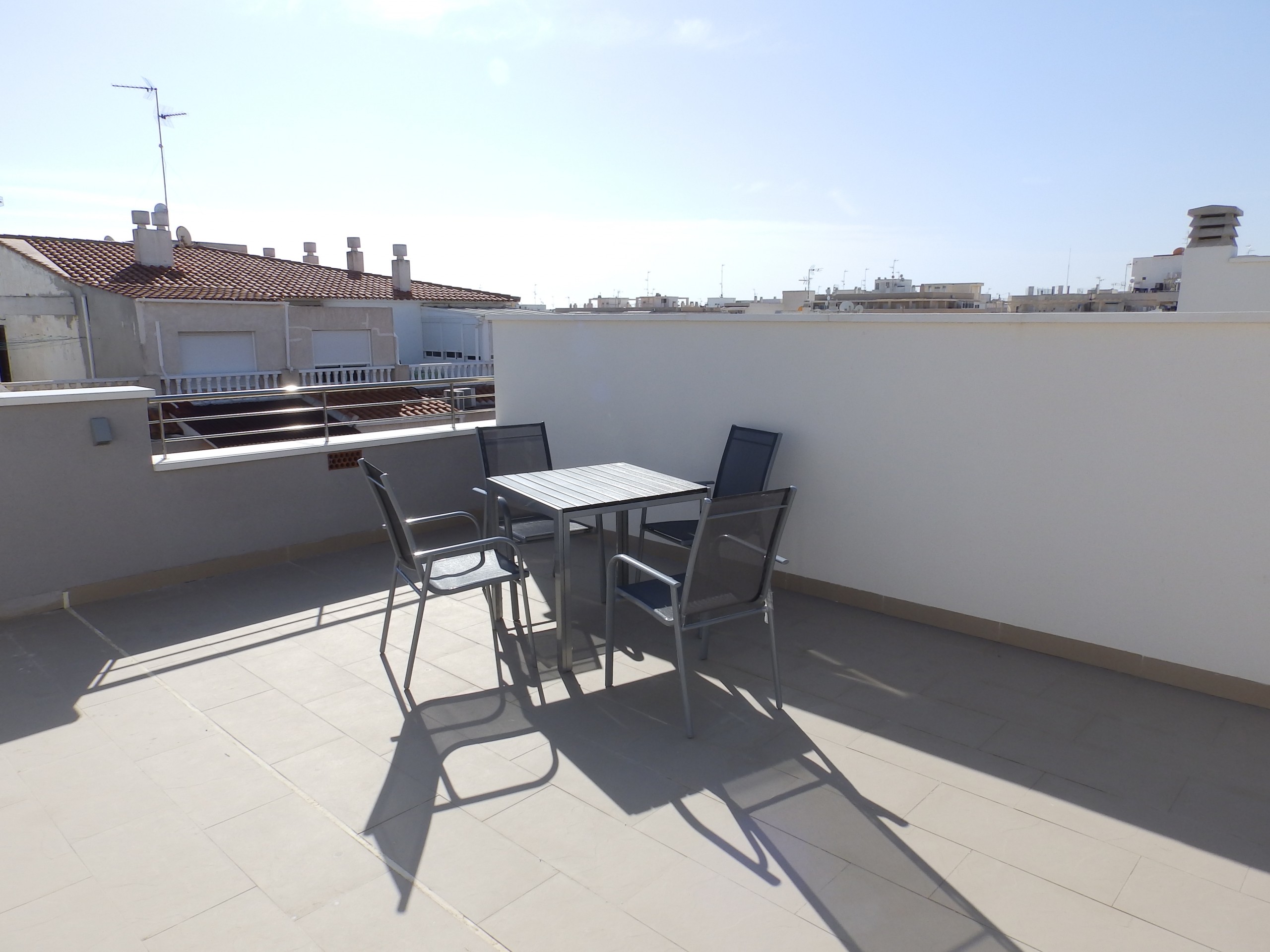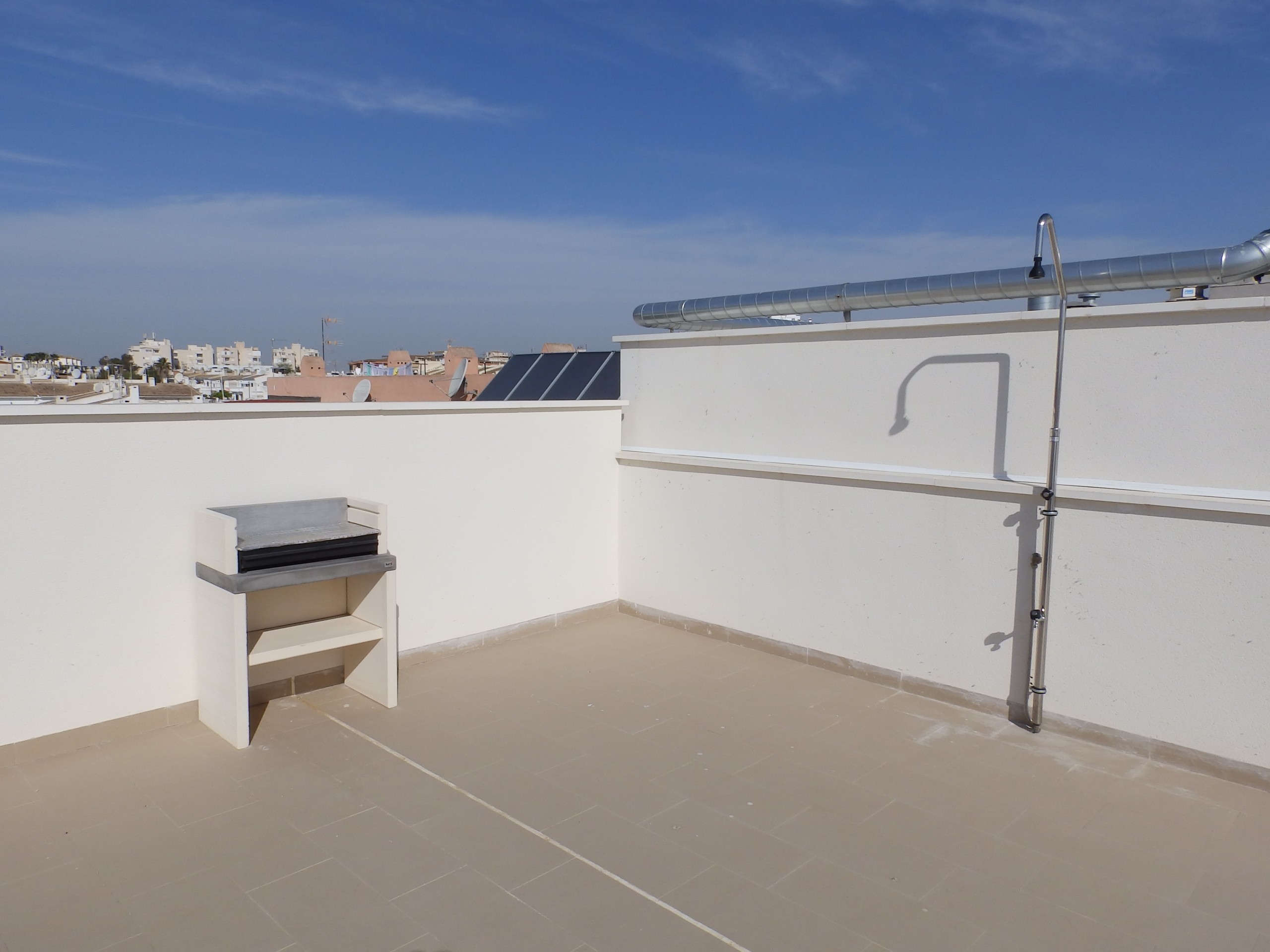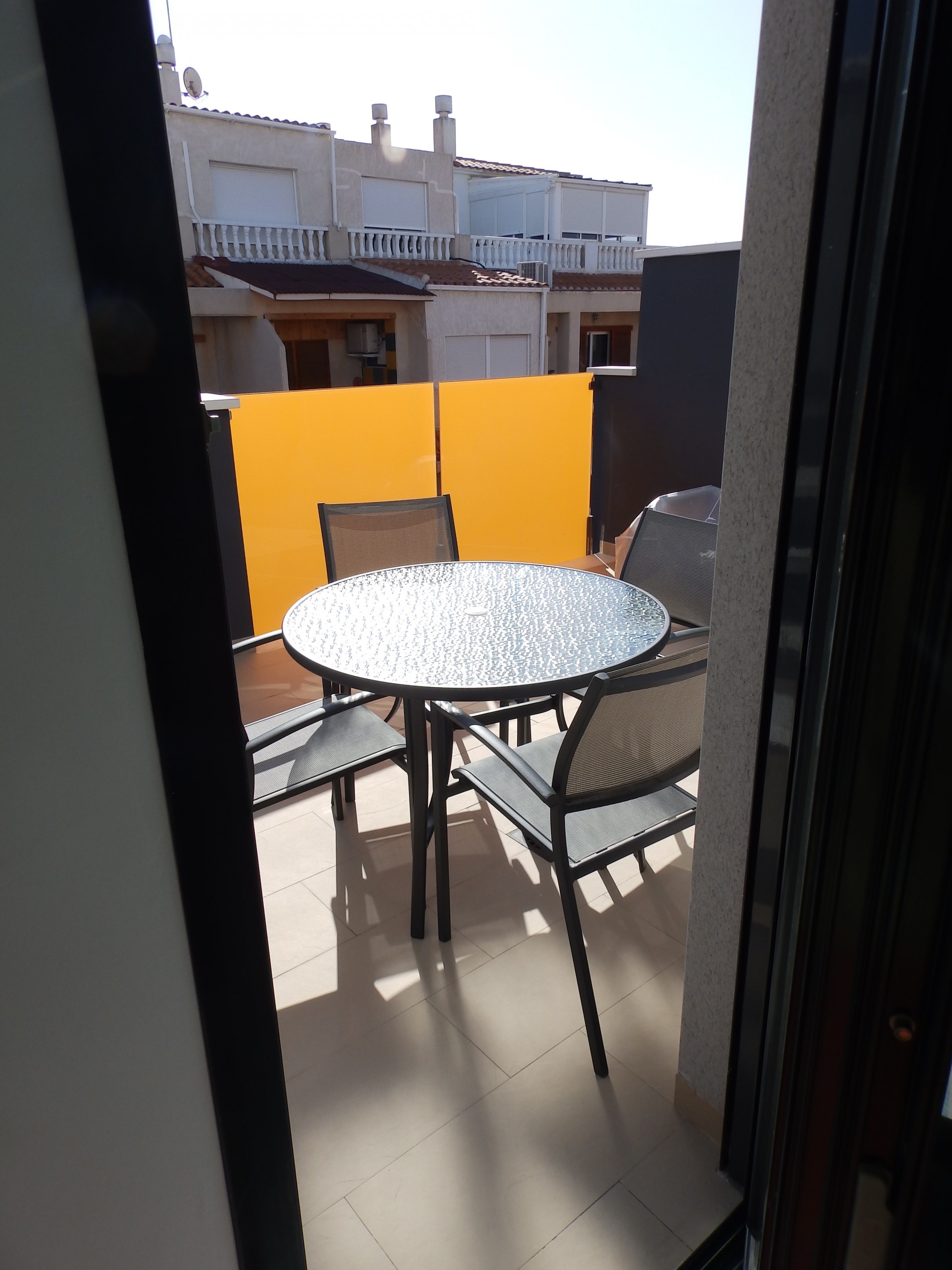 For rent a two bedroom apartment in a modern complex built in 2015 called Residential Algeria 1. It has a terrace and a private solarium of 121sqm. It consists of two bedrooms that are spacious and bright. American-style kitchen, two bathrooms, terrace and private solarium. The terrace has outdoor furniture and sun loungers. Upstairs in the solarium there is also outdoor furniture, barbecue and shower. The apartment is equipped with furniture, household appliances (including dishwasher), central air conditioning, kitchen utensils, linens and towels. Spanish and Russian Television is also available. The complex is gated and features a saltwater pool and Jacuzzi, sauna, sports and children's playground. There is a private parking space in the underground garage included in the rental.