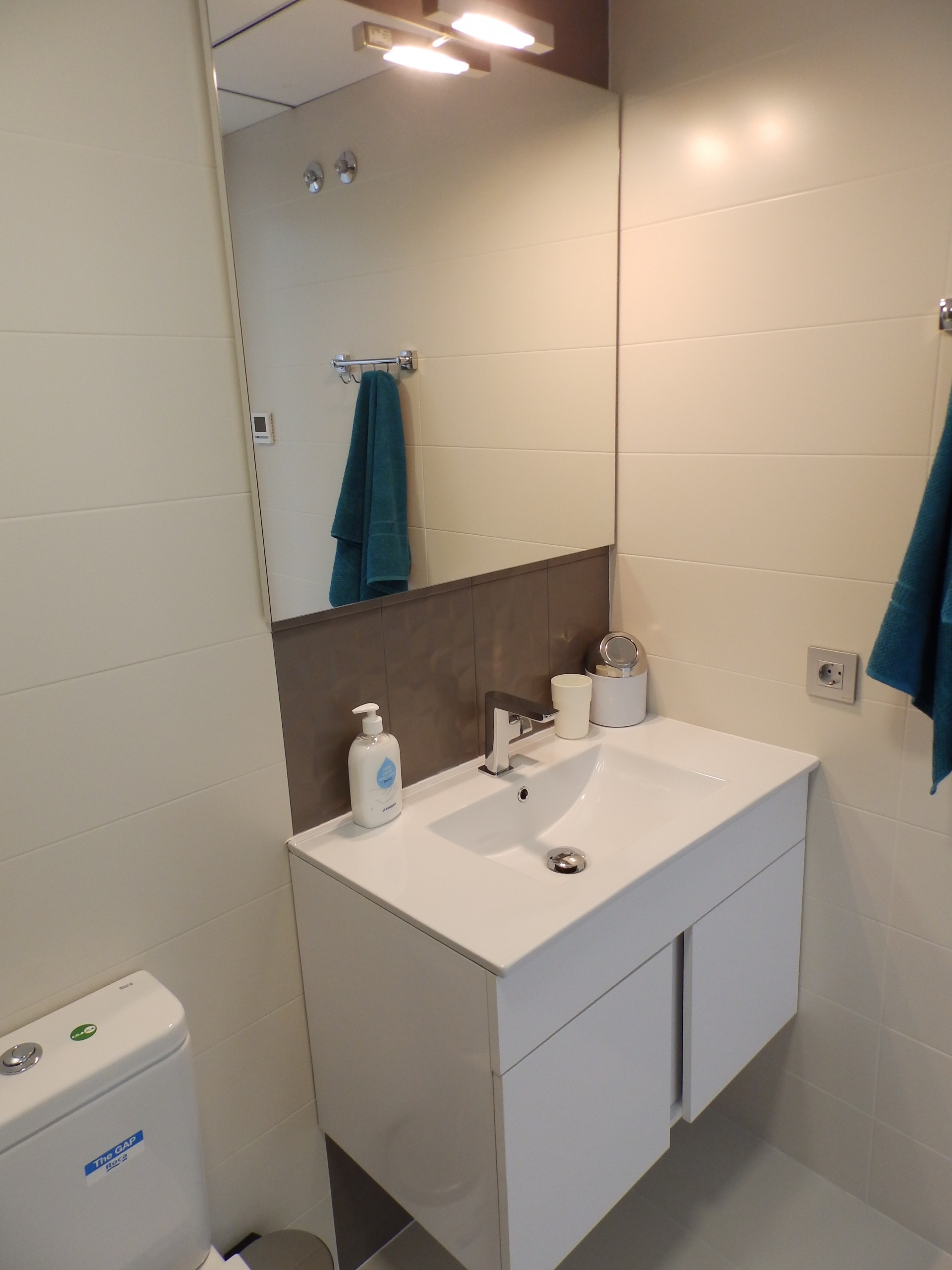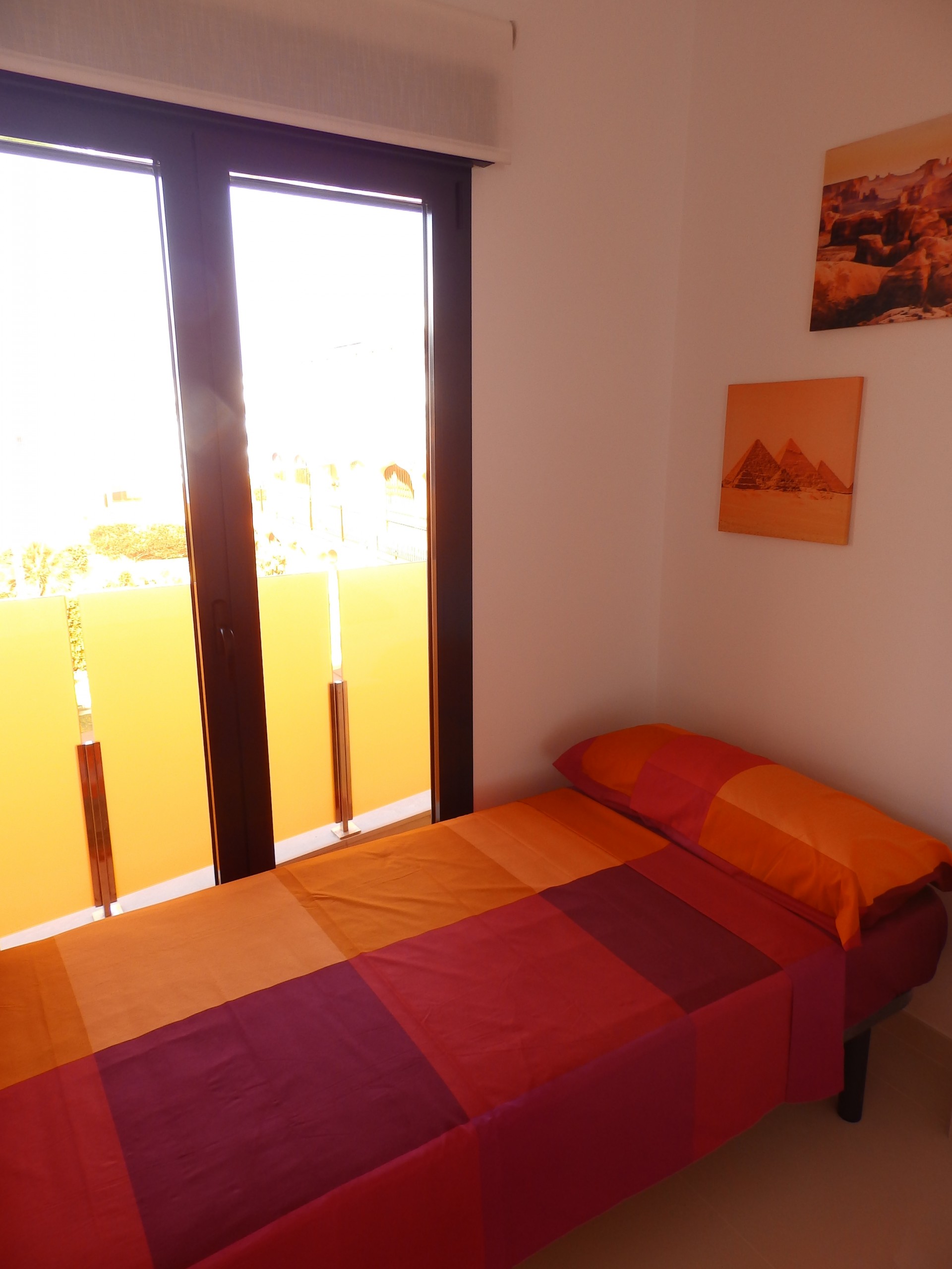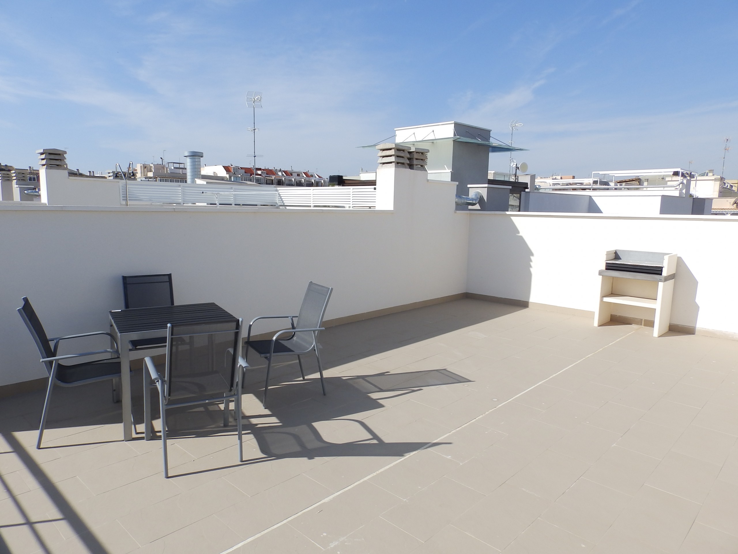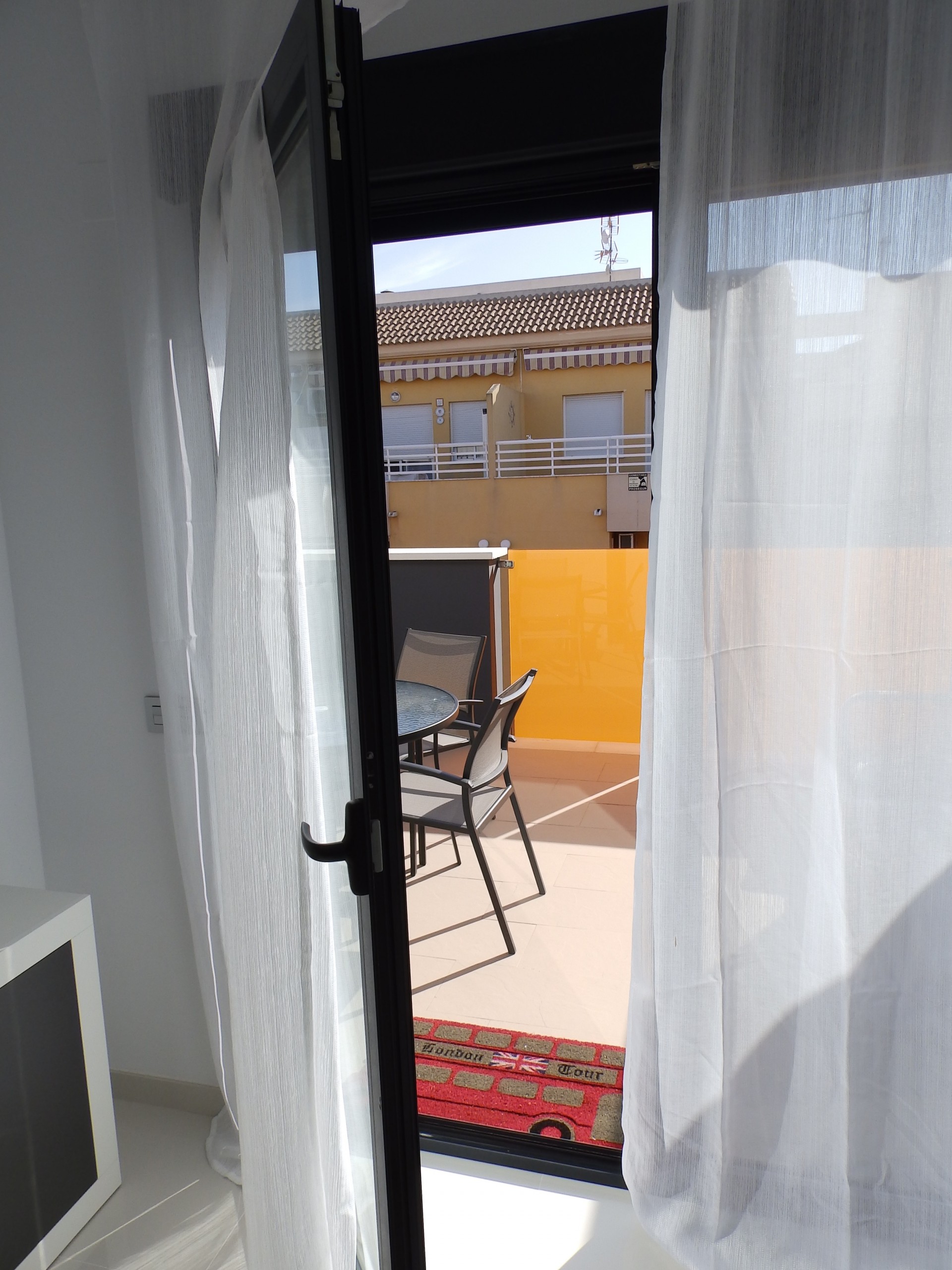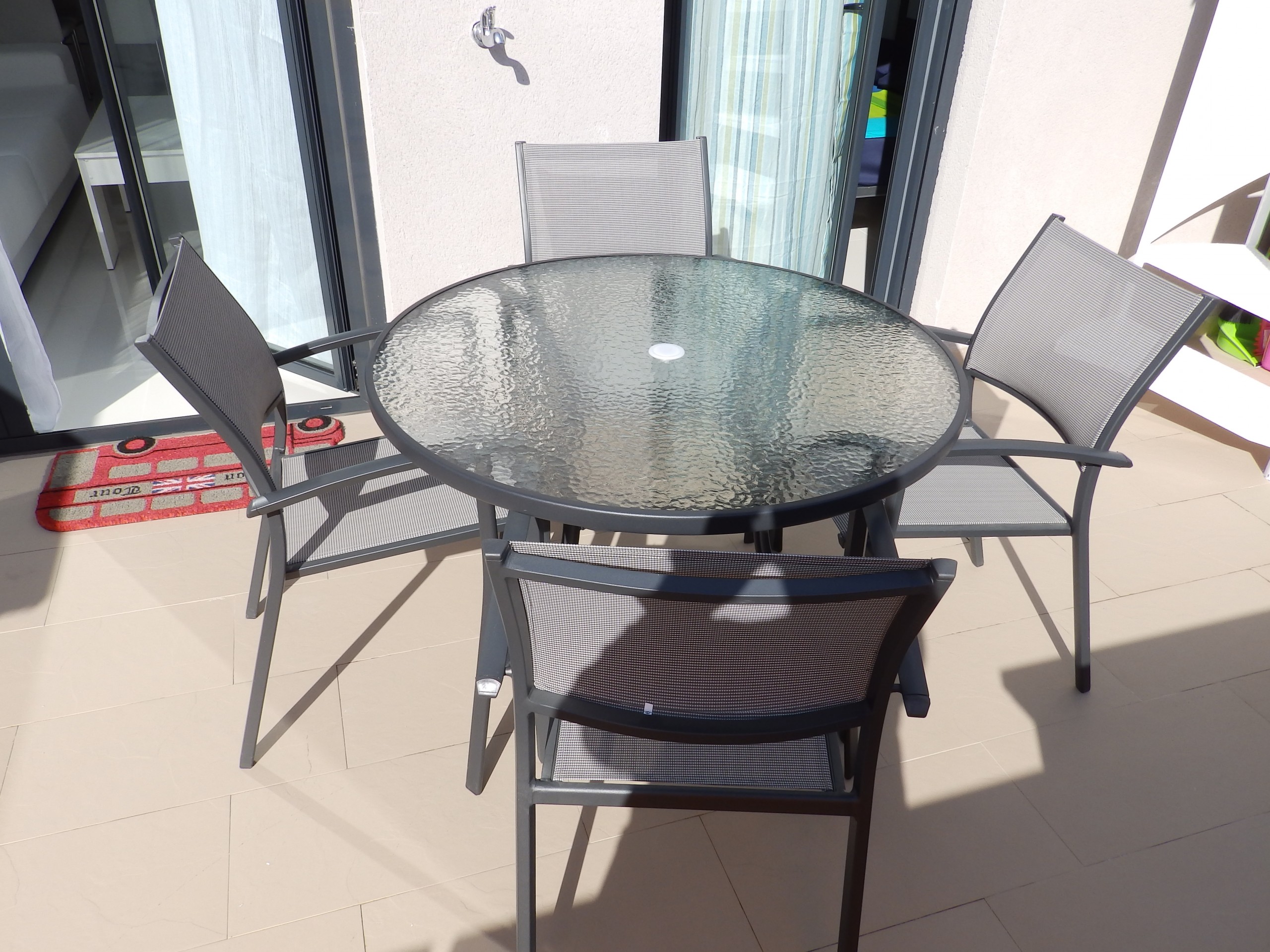 For rent a two bedroom apartment in a modern complex built in 2015 called Residential Algeria 1. It has a terrace and a private solarium of 121sqm. It consists of two bedrooms that are spacious and bright. American-style kitchen, two bathrooms, terrace and private solarium. The terrace has outdoor furniture and sun loungers. Upstairs in the solarium there is also outdoor furniture, barbecue and shower. The apartment is equipped with furniture, household appliances (including dishwasher), central air conditioning, kitchen utensils, linens and towels. Spanish and Russian Television is also available. The complex is gated and features a saltwater pool and Jacuzzi, sauna, sports and children's playground. There is a private parking space in the underground garage included in the rental.