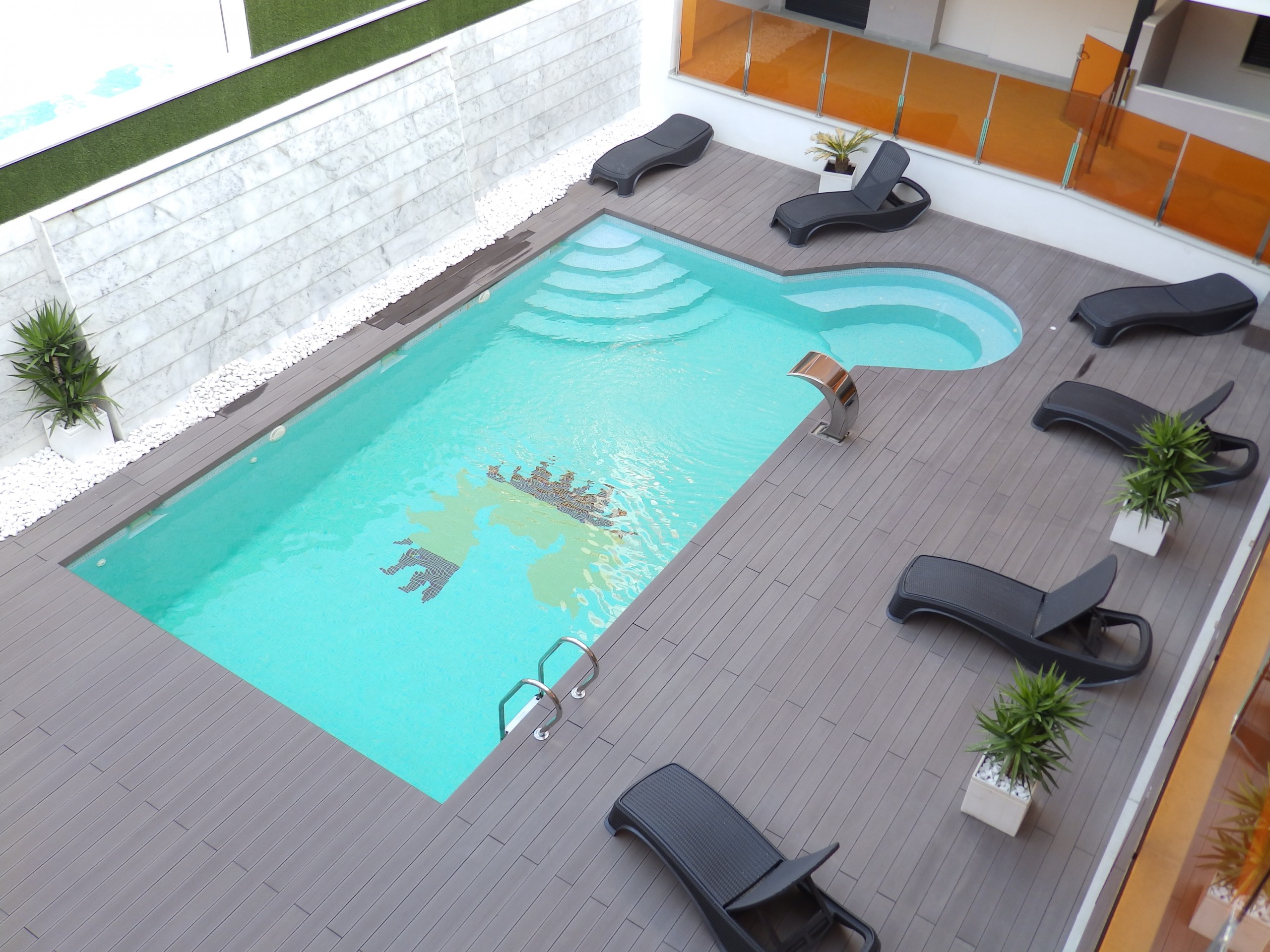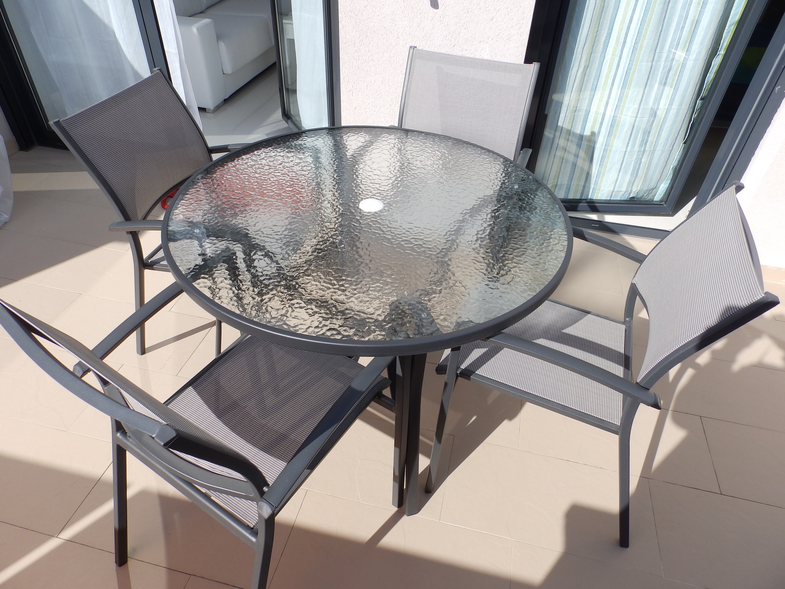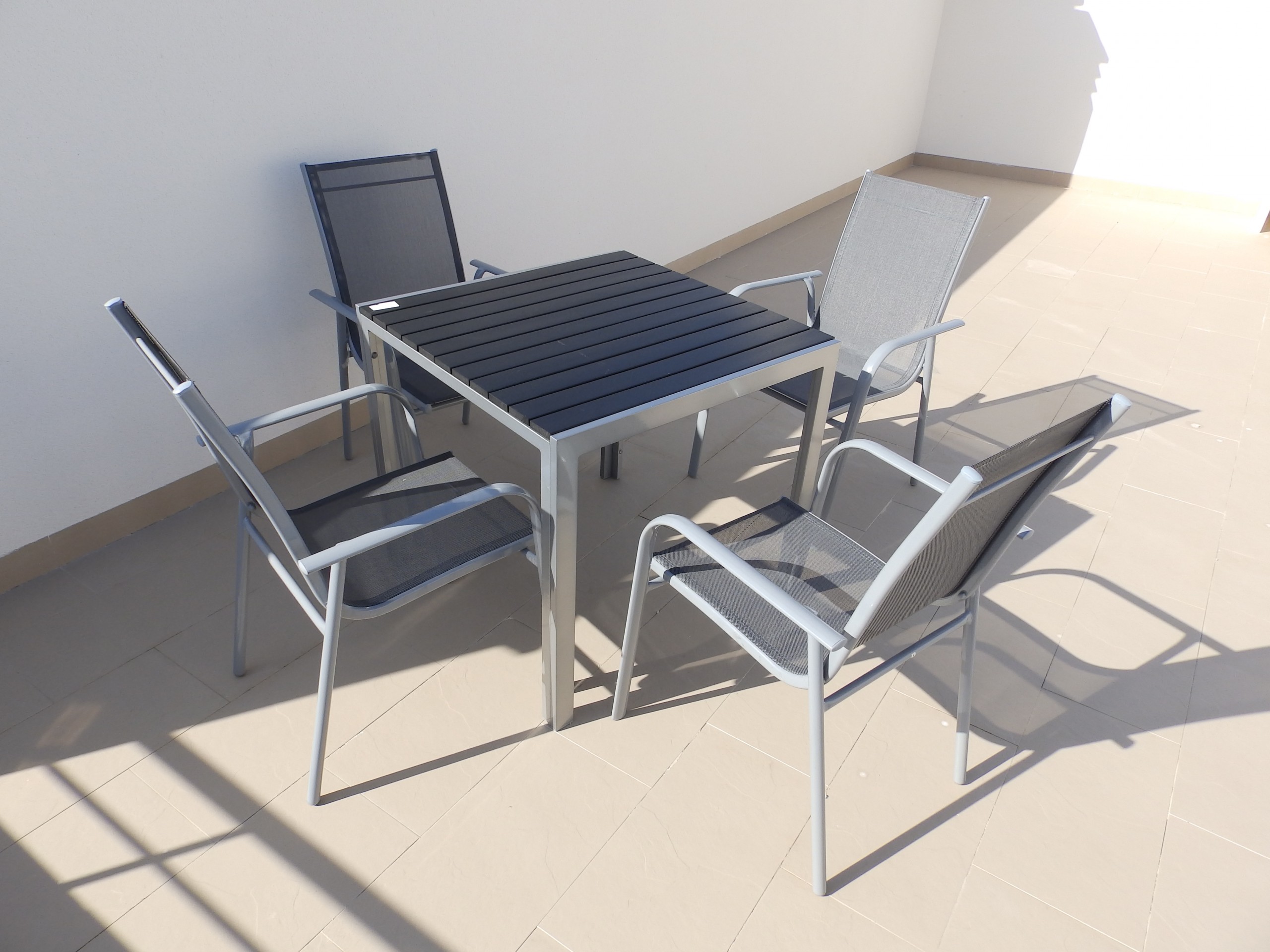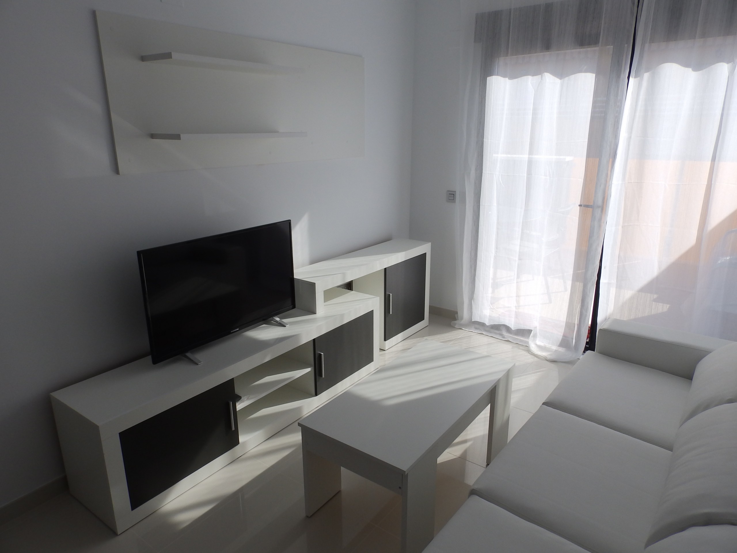 For rent a two bedroom apartment in a modern complex built in 2015 called Residential Algeria 1. It has a terrace and a private solarium of 121sqm. It consists of two bedrooms that are spacious and bright. American-style kitchen, two bathrooms, terrace and private solarium. The terrace has outdoor furniture and sun loungers. Upstairs in the solarium there is also outdoor furniture, barbecue and shower. The apartment is equipped with furniture, household appliances (including dishwasher), central air conditioning, kitchen utensils, linens and towels. Spanish and Russian Television is also available. The complex is gated and features a saltwater pool and Jacuzzi, sauna, sports and children's playground. There is a private parking space in the underground garage included in the rental.