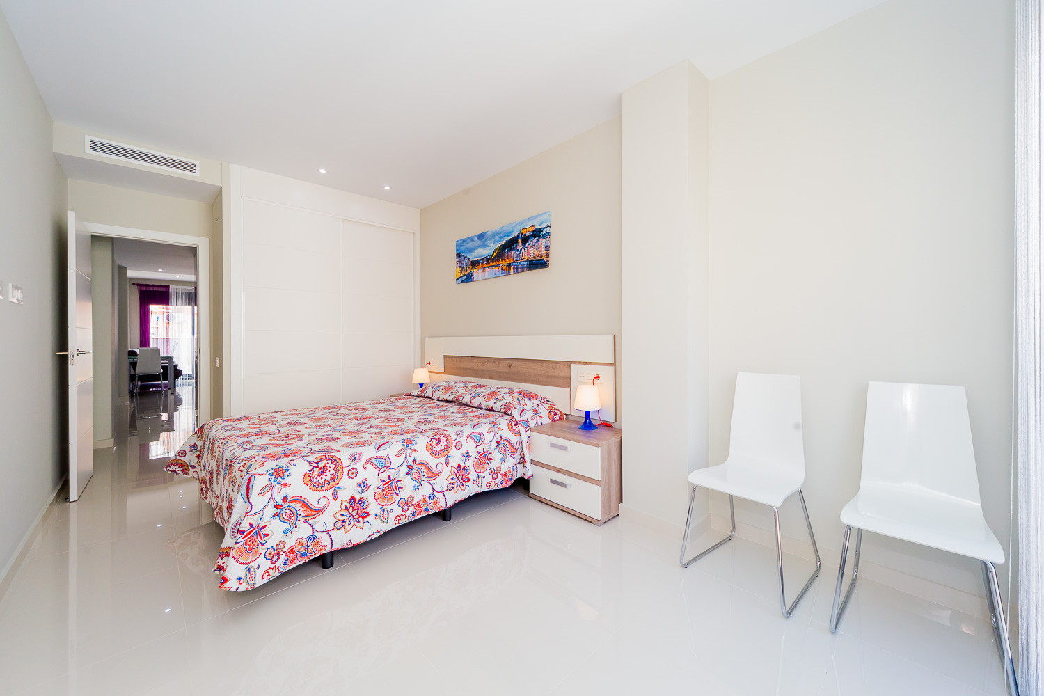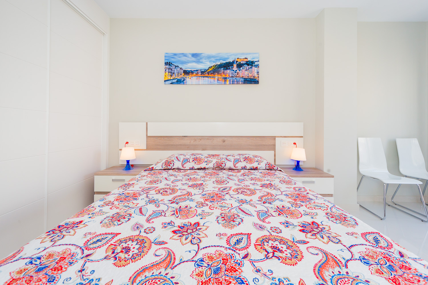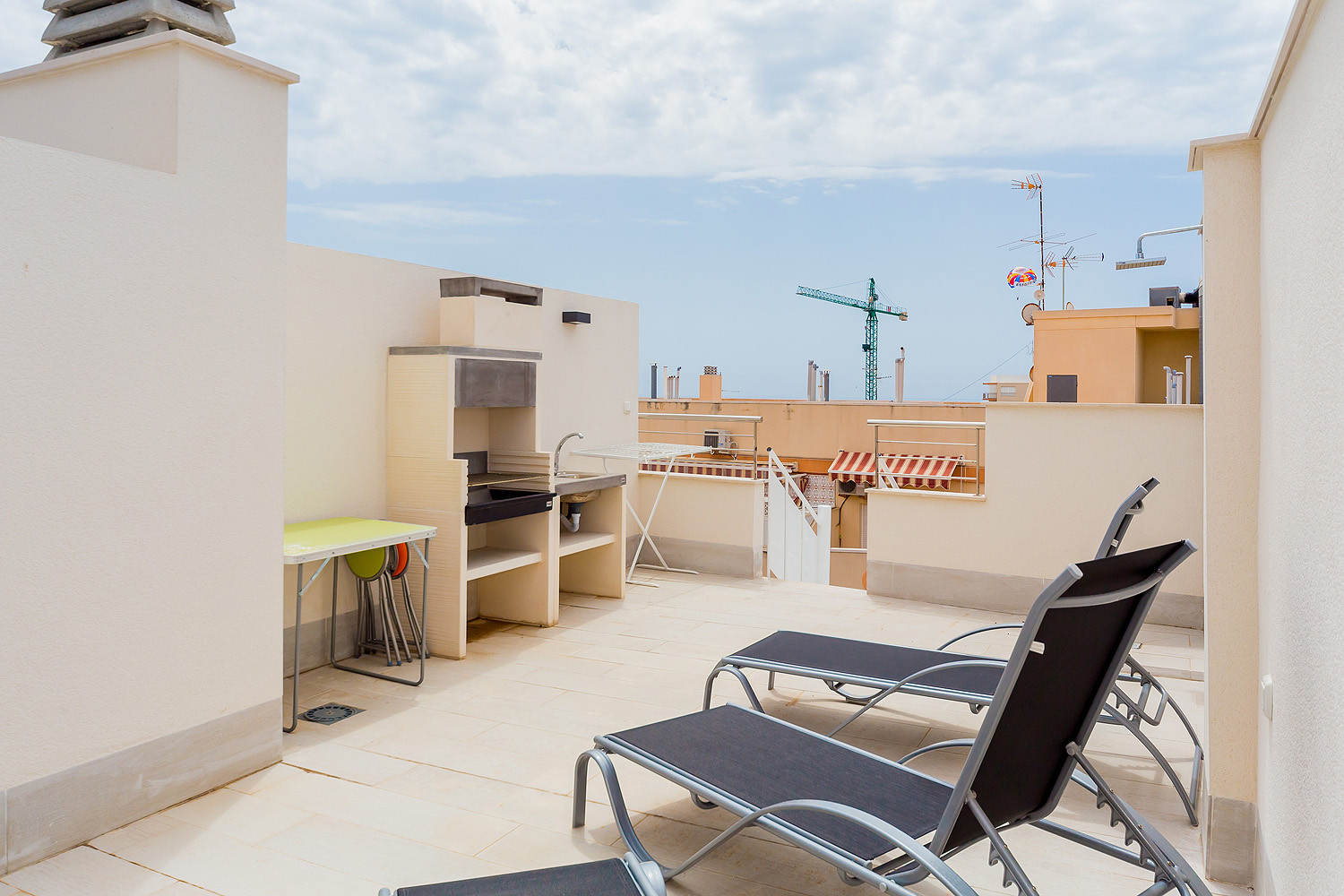 The apartment is fully equipped with furniture, appliances (including dishwasher), dishes, linens and towels. On the terrace there are summer furniture, in the solarium there are sun loungers and barbecue. The air conditioning is centrally controlled. It only has Spanish television. The building has its own communal swimming pool and Finnish sauna. It is centrally located and there are many traditional tapas bars, restaurants, supermarkets all in walking distance. The popular Del Cura beach is located about 200 meters away. It can accommodate a maximum of 4 people. No animals are permitted and smoking is only allowed on the balcony.