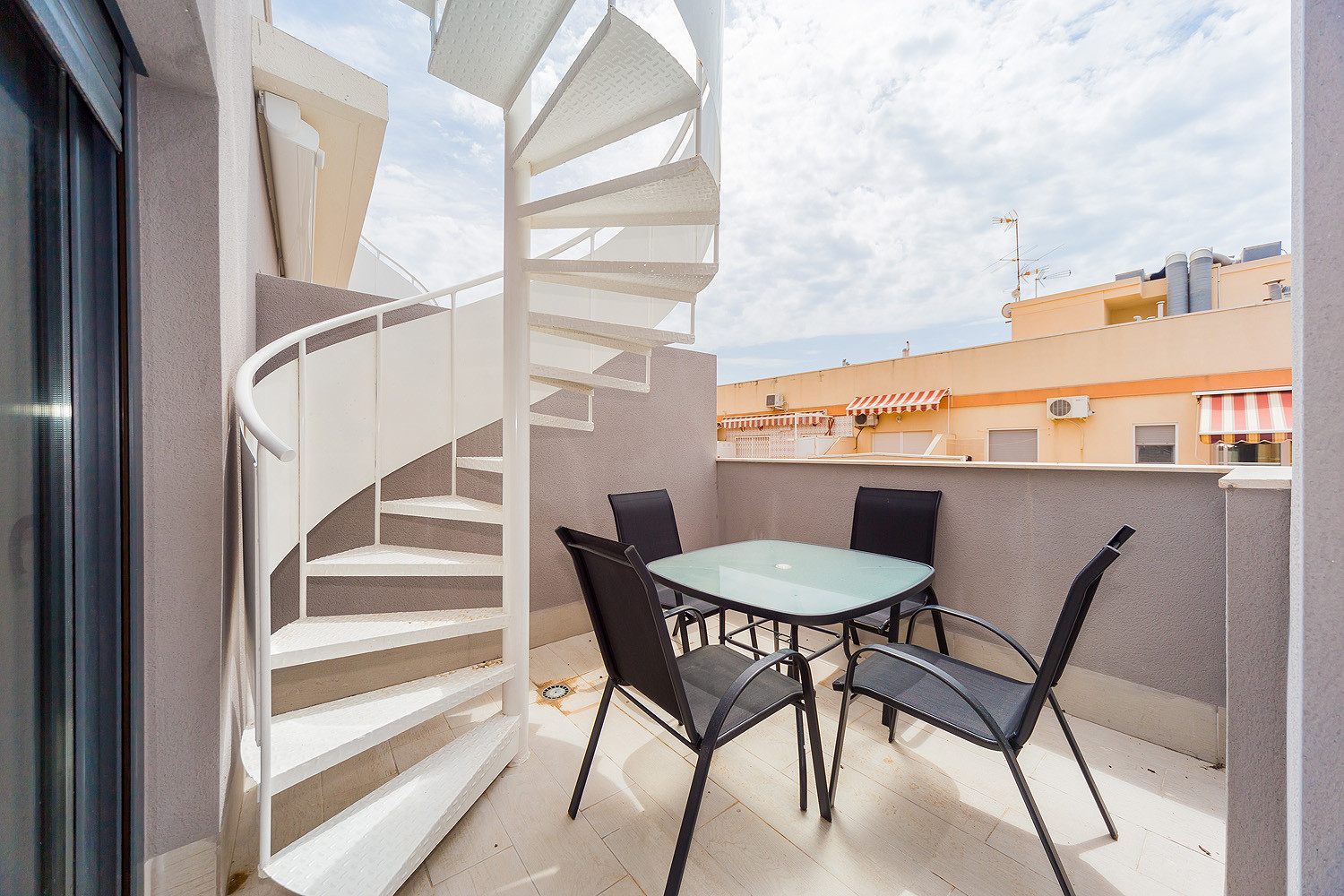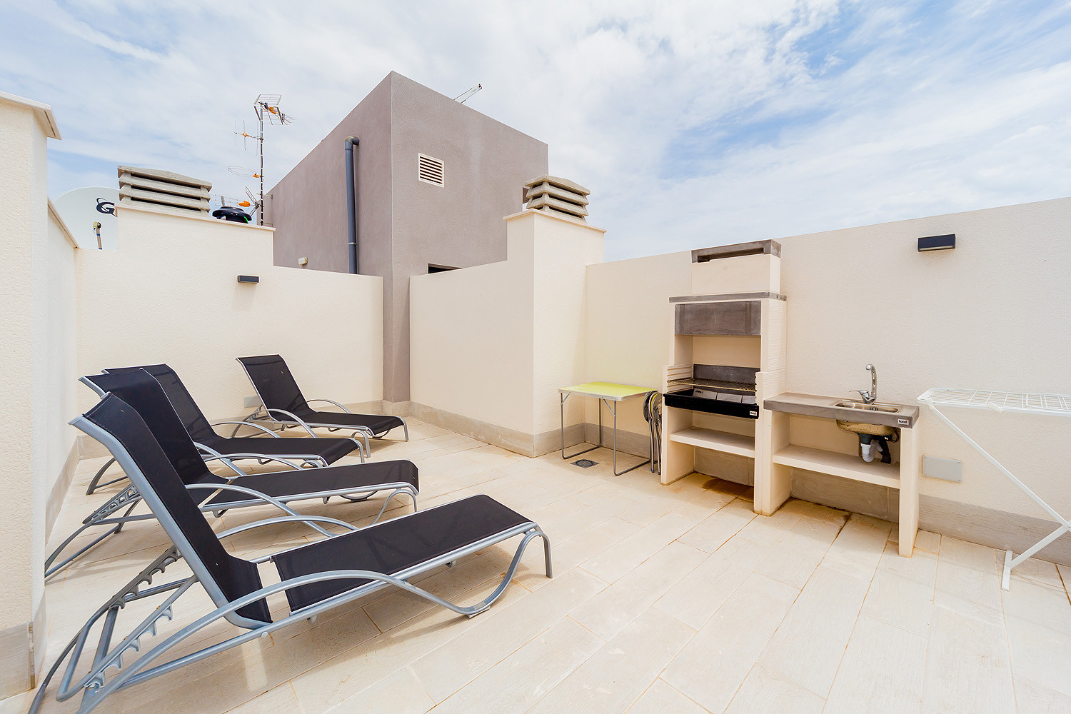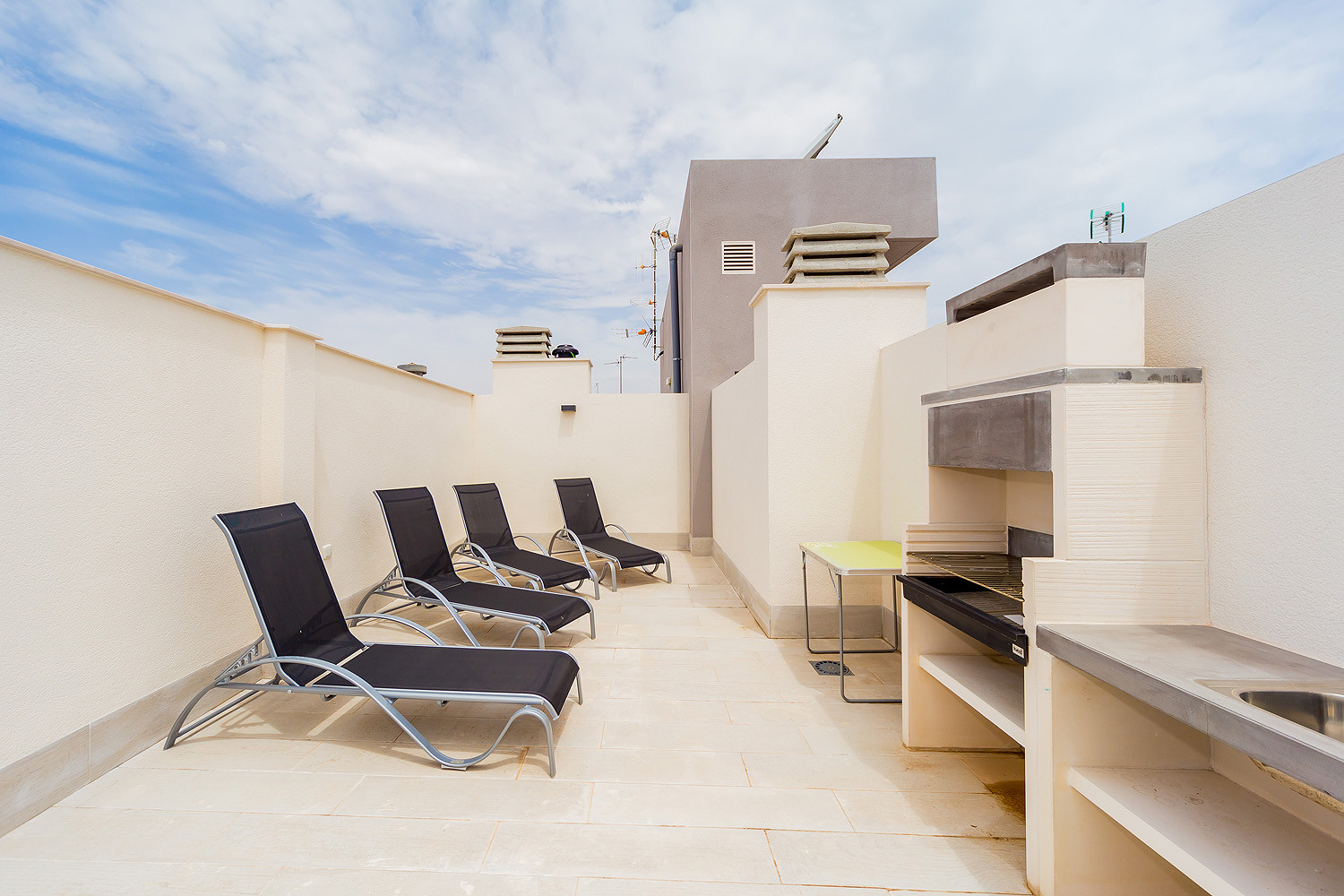 A cozy one bedroom apartment for rent in a new complex "Residential Alegria III" three minutes walk from the beach of El Cura! Swimming pool, solarium, barbecue The lodging option - up to 4 people. For rent this new Penthouse apartment with one bedroom in a modern complex built in 2017 "Residential Alegría III". The property is spread out over 77 m2 (45 m2 of living space and 32 m2 - terrace). It consists of a living room, bedroom, bathroom, kitchen, terrace 9 m2 and a large solarium of 23 m2.