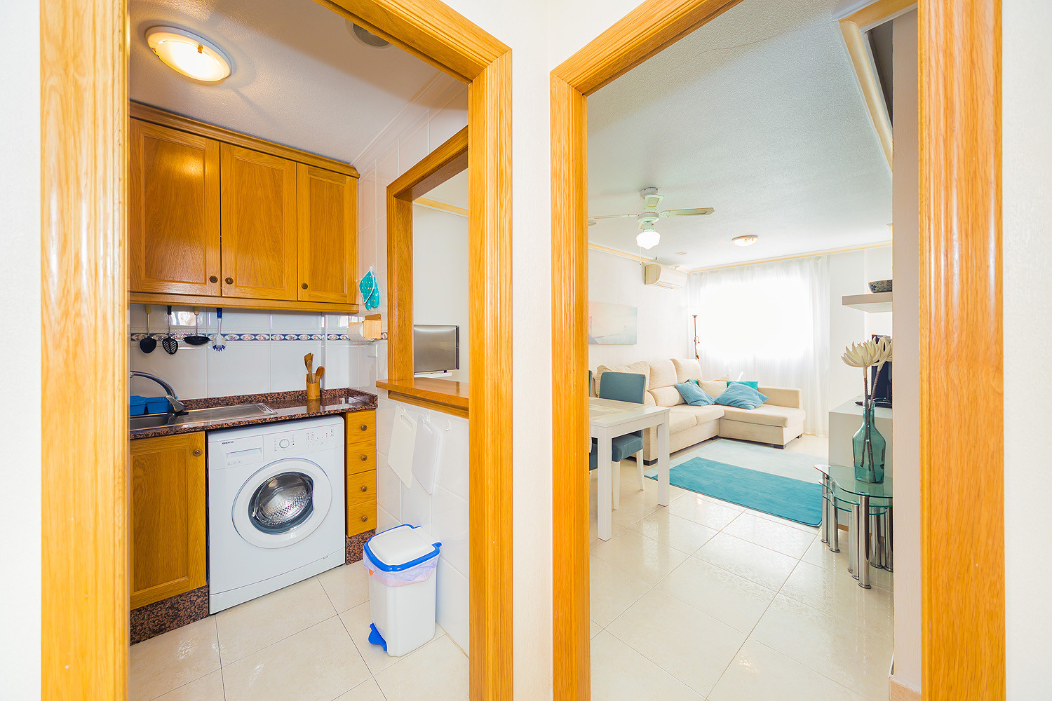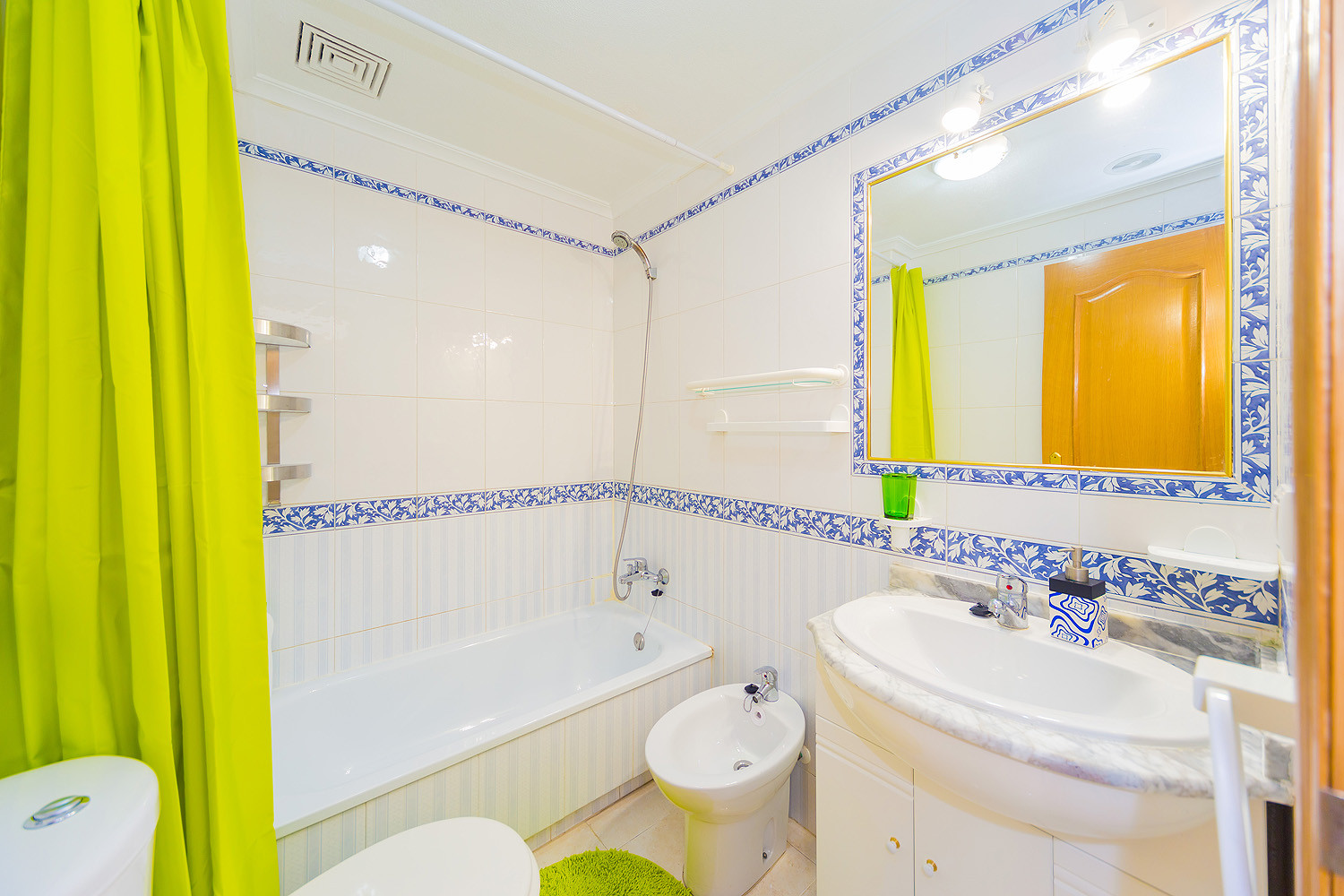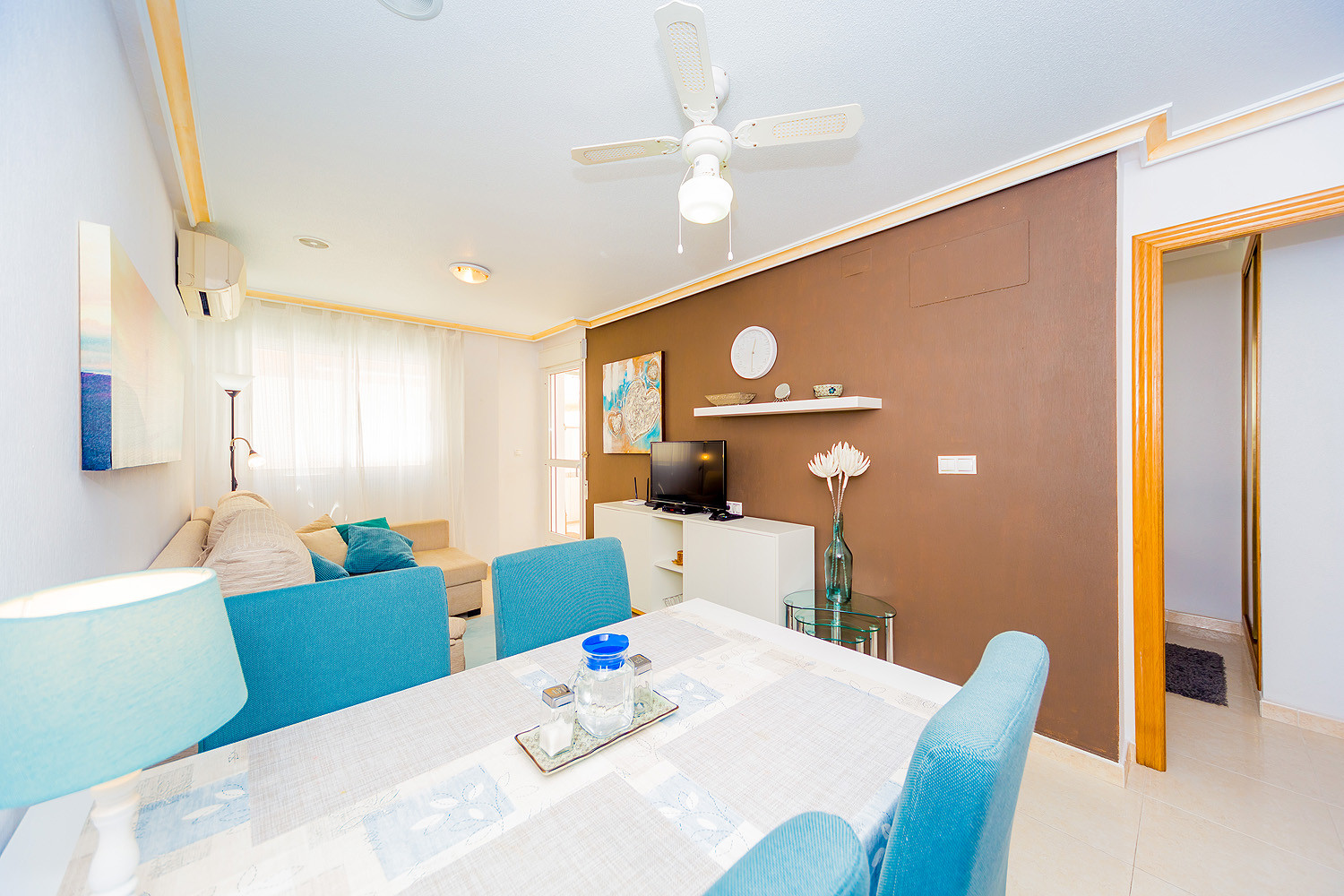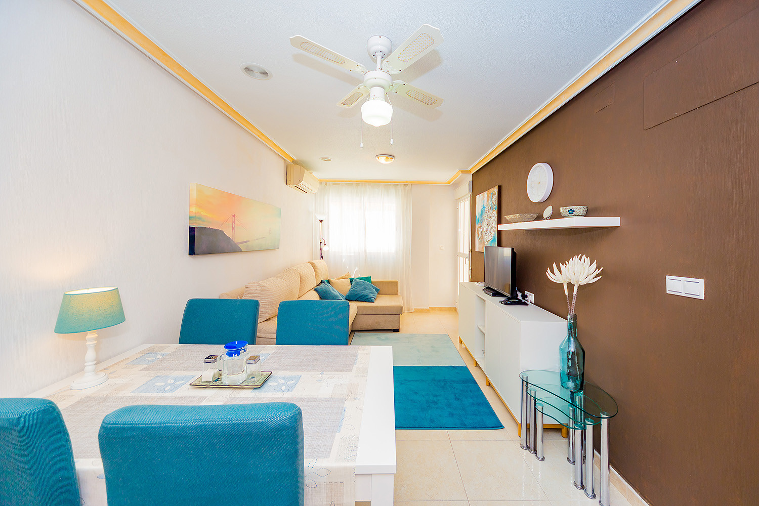 This one bedroom apartment is complete with a private courtyard and is in walking distance to the sea and the beach. It is 53 m2 and consists of a salon, one bedroom, a family bathroom. There is a french-style kitchen and a private courtyard with summer outside furniture. It is equipped with furniture, household electrical appliances, dishes, bed linen and towels. There is also an underground parking space included in the rental duration. The apartment is equipped with two air-conditioners. Television Russian and Spanish. In the same building there is a network supermarket "Consum". Nearby there are many bars and restaurants, a pharmacy and a bus stop. To the sea and the beach of Del Cura it is a 5-7 minutes’ walk. Accommodation options are two people (or two adults with a child up to two years old also there is the possibility of renting a baby cot. Pets are prohibited. Smoking is allowed only in the courtyard.