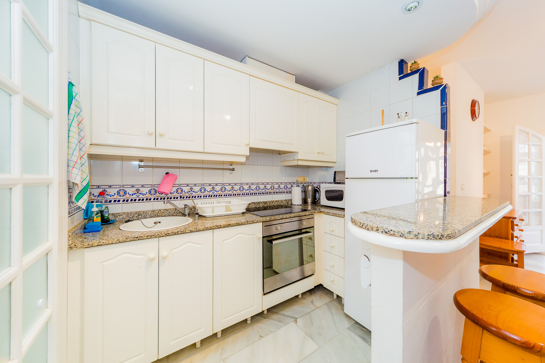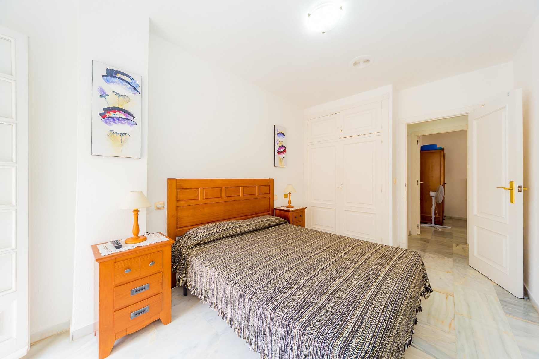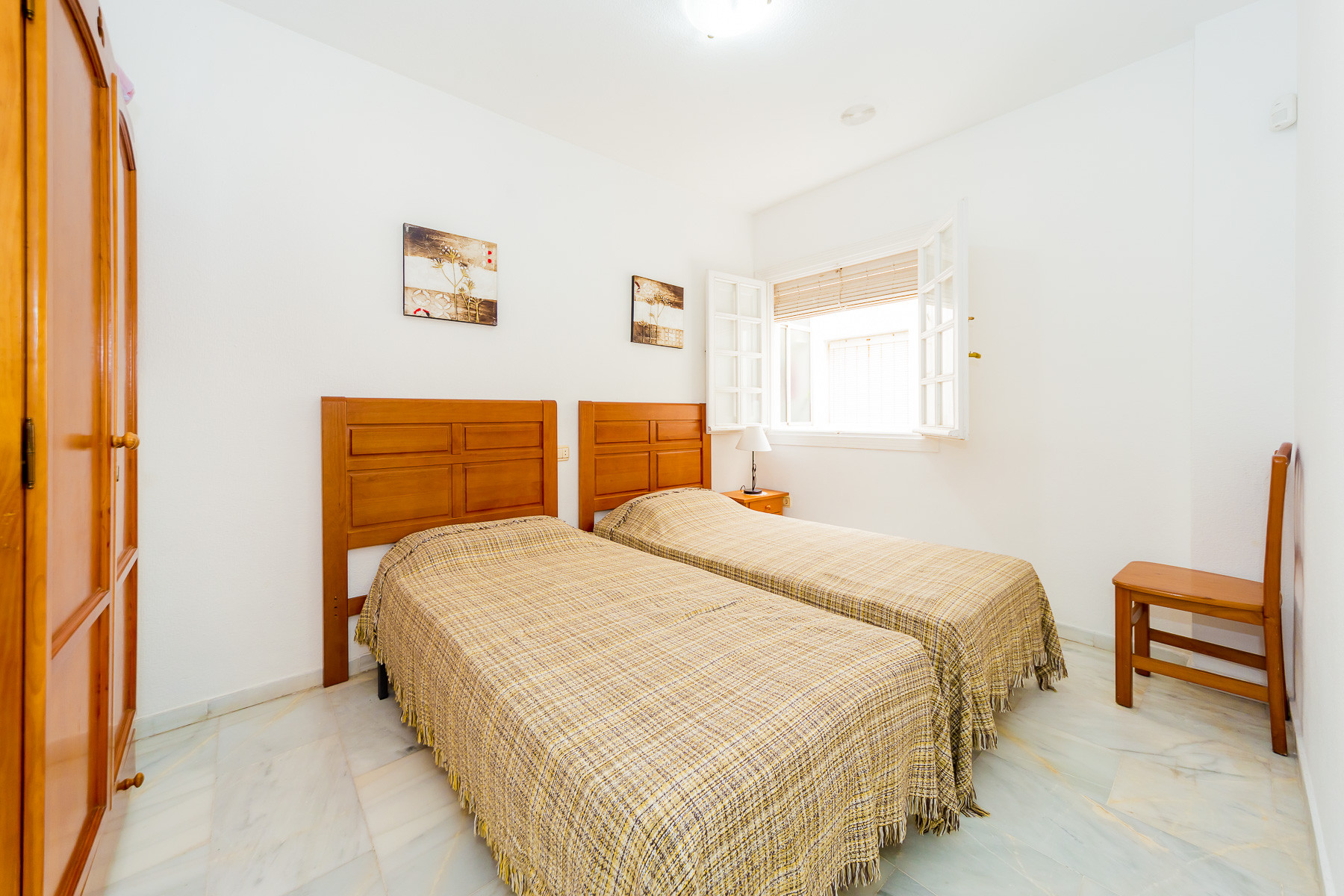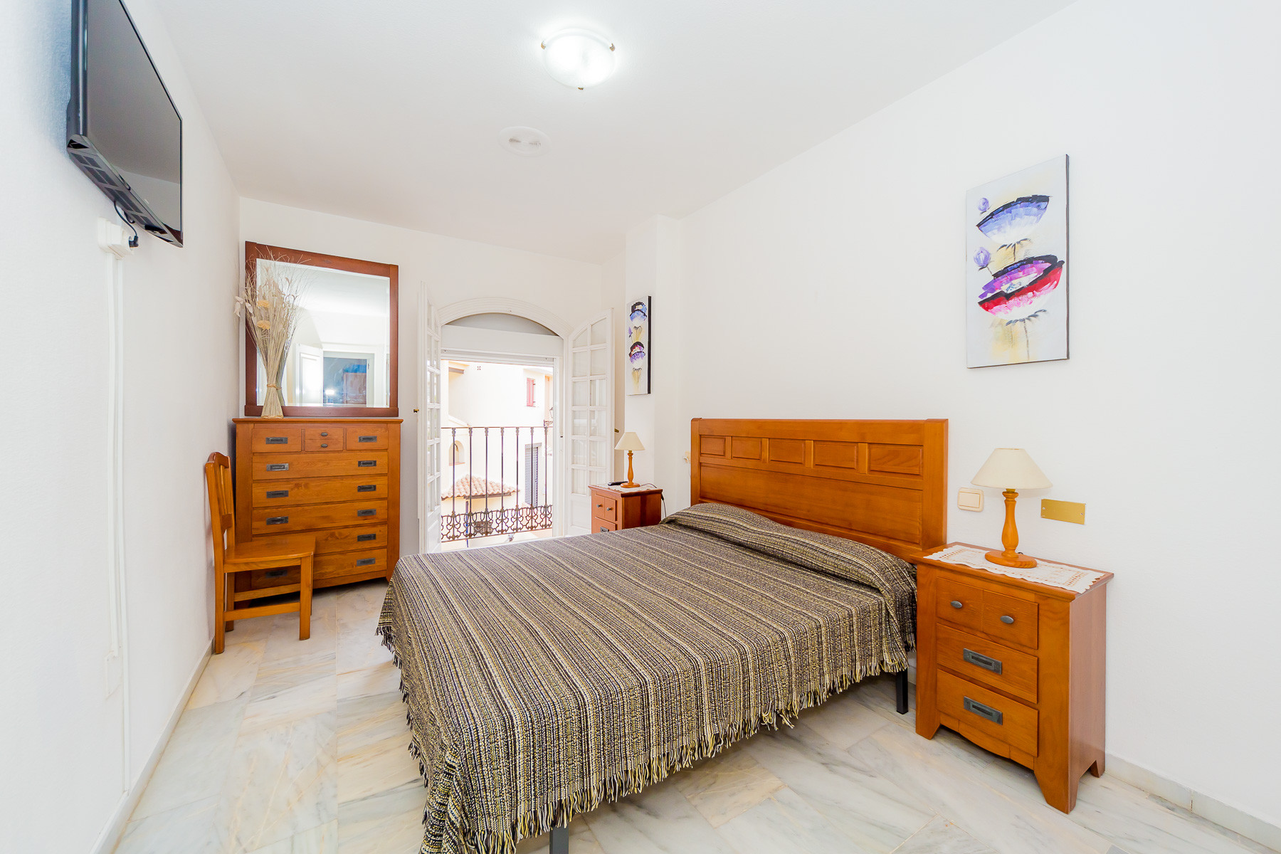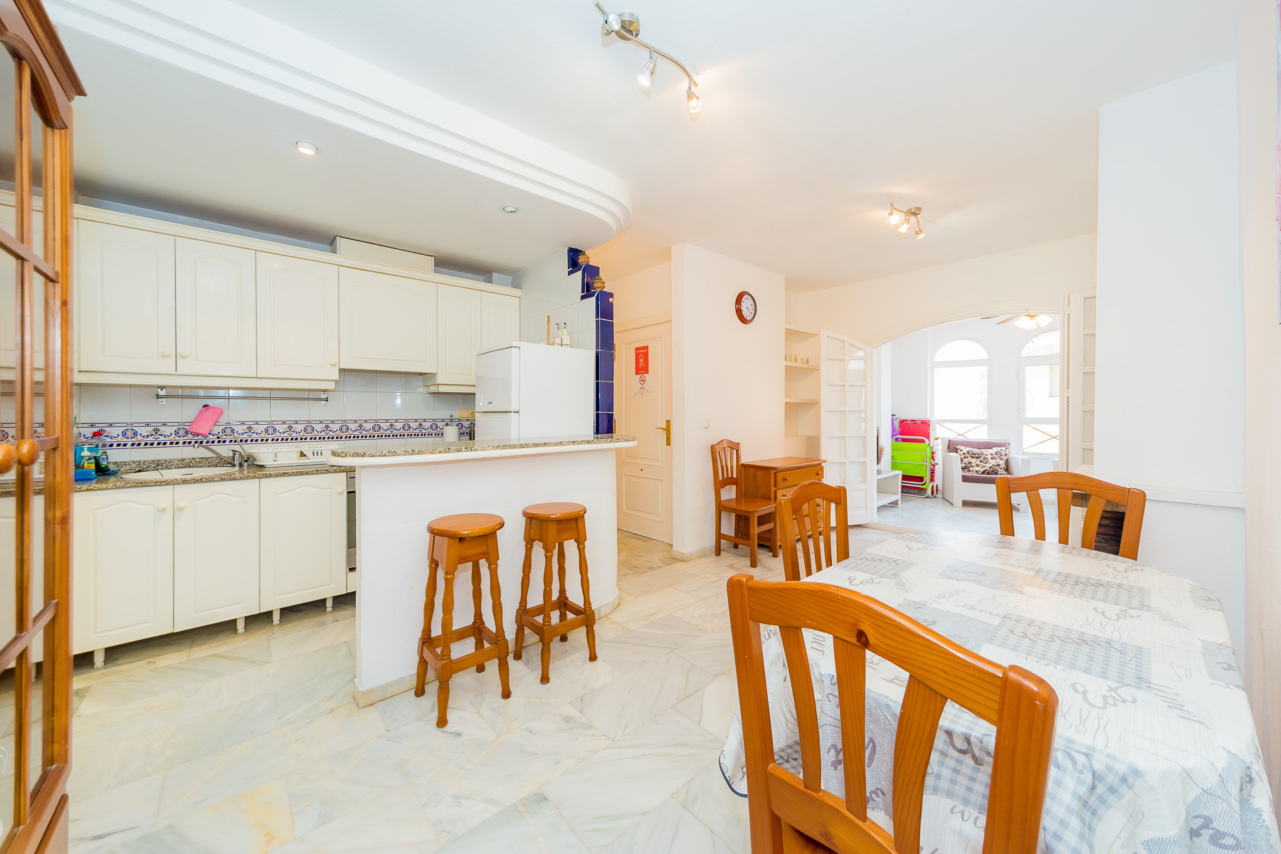 For rent, a lovely beachside apartment with a communal swimming pool. The apartment is fully furnished, equipped for a maximum of four people. It consists of 2 bedrooms, living room, kitchen, bathroom and spacious terrace. The apartment is complete with new furniture and is just 50 meters from the beautiful blue flag beach of Los Locos beach. It is very bright, light and airy furnished in a traditional Spanish style. Spanish TV is available.The air conditioning is only in the living room, but it's enough for all the apartments.