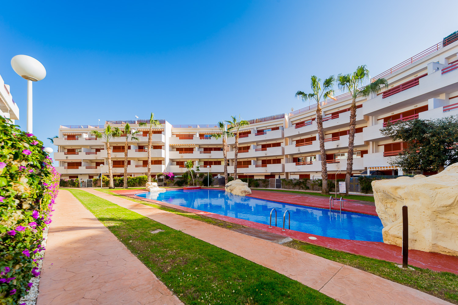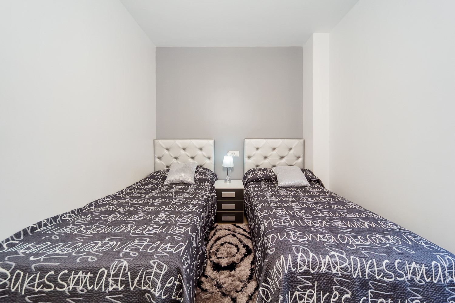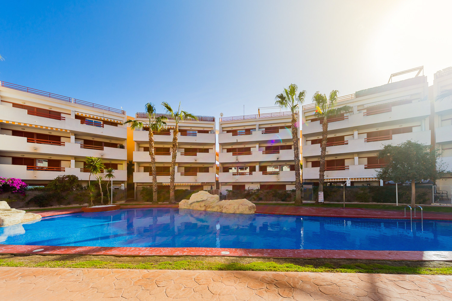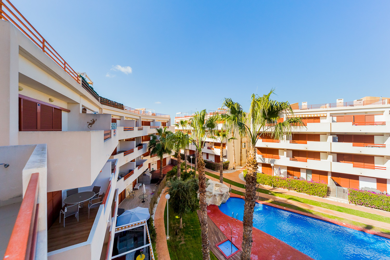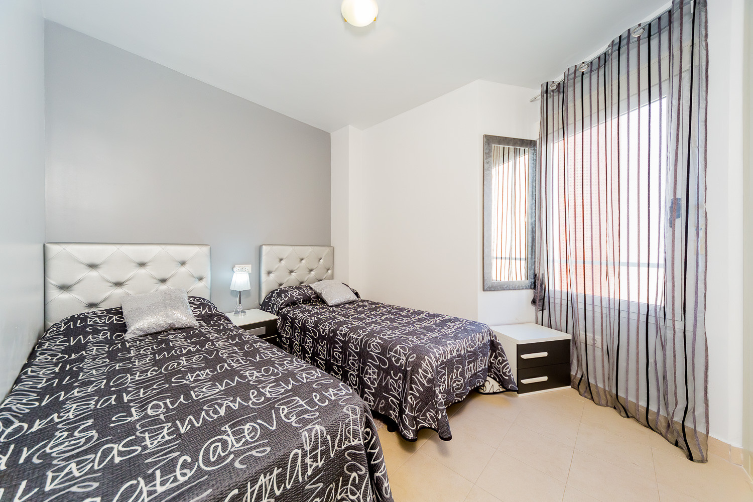 A modern apartment located in a popular area with a lovely green area and two communal swimming pools in Playa Flamenca. It is spread out over 82 m2 and consists of two bedrooms with their own bathrooms, salon, kitchen, utility room and terrace with views of the pool, area and urbanization. Upstairs there is a private solarium complete with a BBQ, which overlooks the sea and the pool also. The apartment is equipped with new furniture (beds with orthopaedic mattresses), electrical appliances (including dishwasher and washing machine, coffee maker, juicer and toaster), bed linen and towels. The terrace and the solarium have outdoor furniture, beds and folding chairs. There is central air conditioning and a TV with Smart-TV. There is also a parking place on the complex. It sleeps up to 4 people No pets are allowed and smoking is prohibited in the apartment. Nearby there are many bars and restaurants also in walking distance is a large supermarket LIDL, Super COR and Carrefour. The Zenia Boulevard shopping complex with its array of over 150 shops, bars, eateries, casino and much more is about 20 minutes on foot. The sea is about 500 meters away.