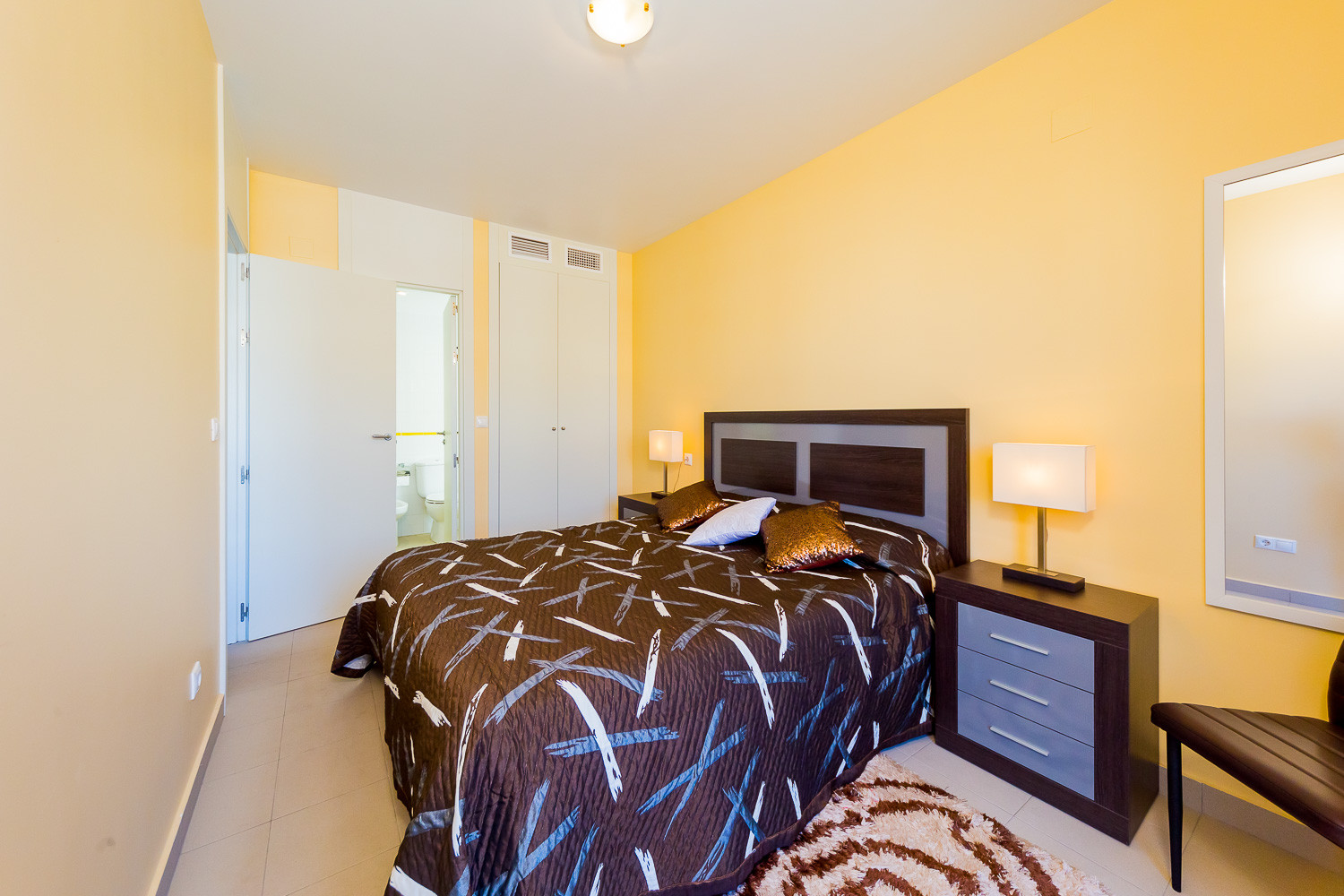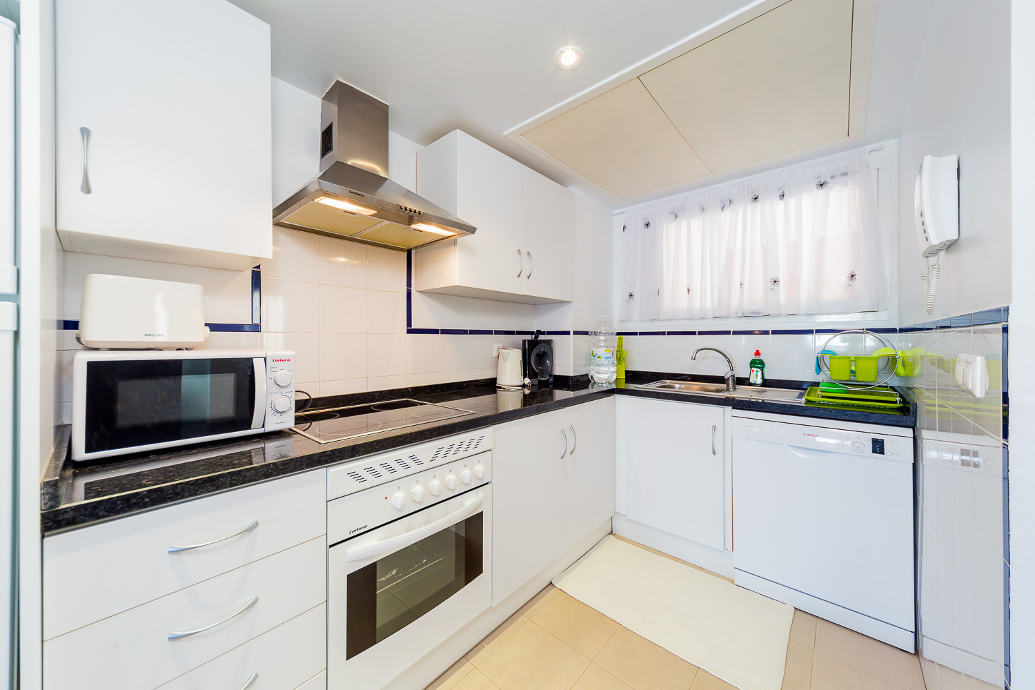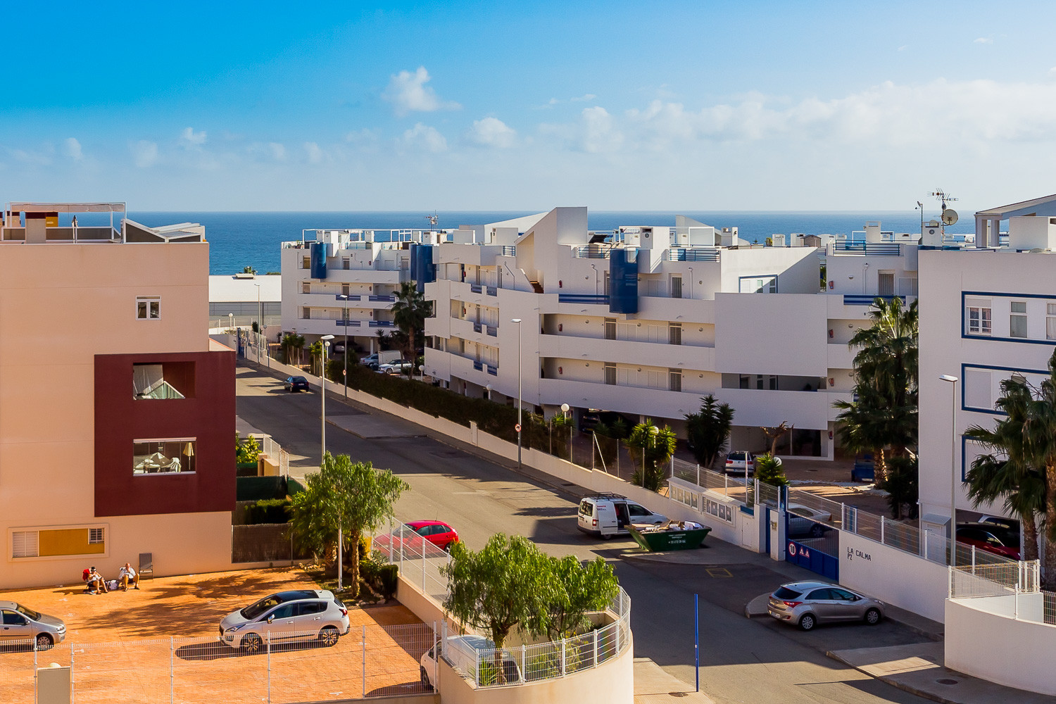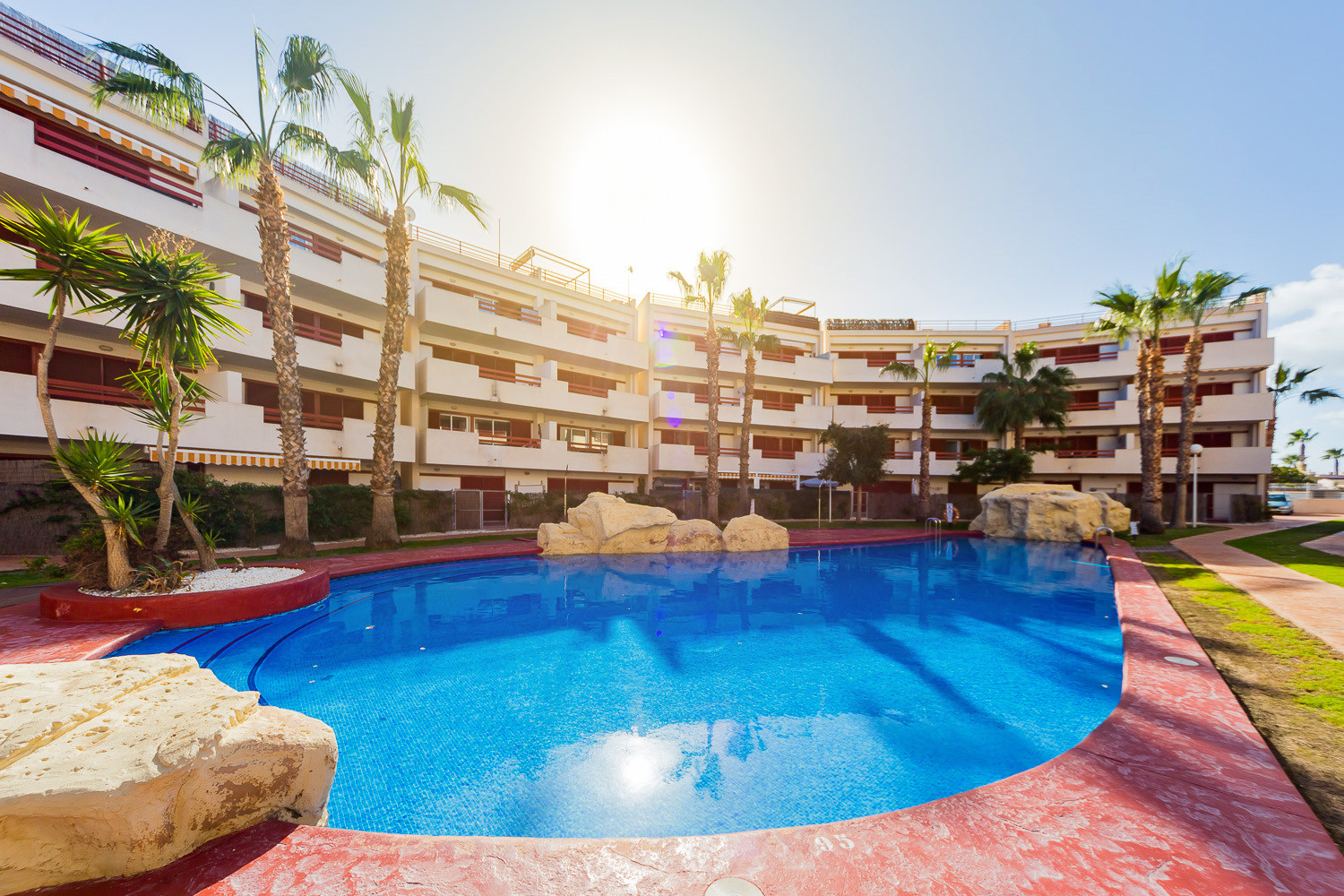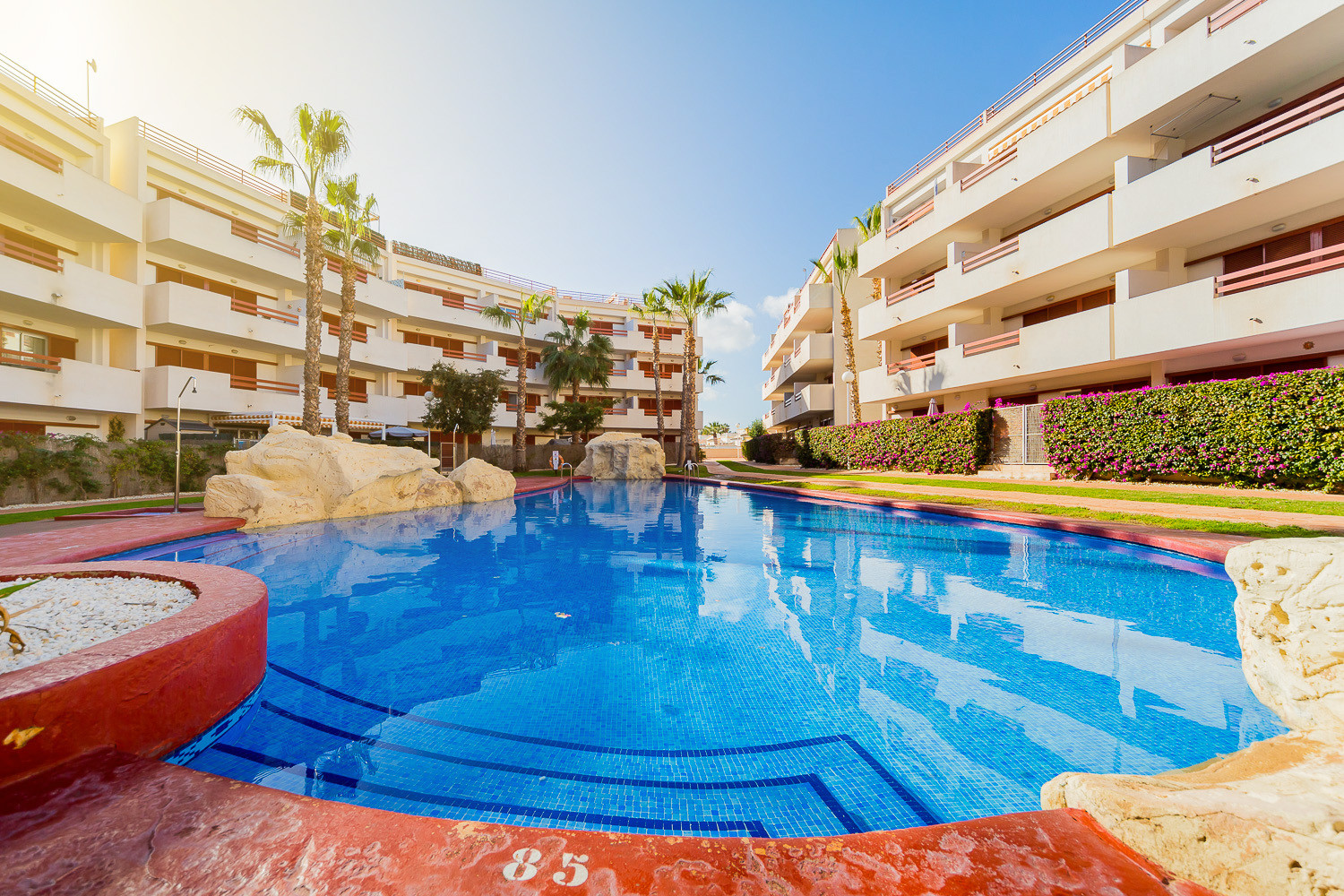 A modern apartment located in a popular area with a lovely green area and two communal swimming pools in Playa Flamenca. It is spread out over 82 m2 and consists of two bedrooms with their own bathrooms, salon, kitchen, utility room and terrace with views of the pool, area and urbanization. Upstairs there is a private solarium complete with a BBQ, which overlooks the sea and the pool also. The apartment is equipped with new furniture (beds with orthopaedic mattresses), electrical appliances (including dishwasher and washing machine, coffee maker, juicer and toaster), bed linen and towels. The terrace and the solarium have outdoor furniture, beds and folding chairs. There is central air conditioning and a TV with Smart-TV. There is also a parking place on the complex. It sleeps up to 4 people No pets are allowed and smoking is prohibited in the apartment. Nearby there are many bars and restaurants also in walking distance is a large supermarket LIDL, Super COR and Carrefour. The Zenia Boulevard shopping complex with its array of over 150 shops, bars, eateries, casino and much more is about 20 minutes on foot. The sea is about 500 meters away.