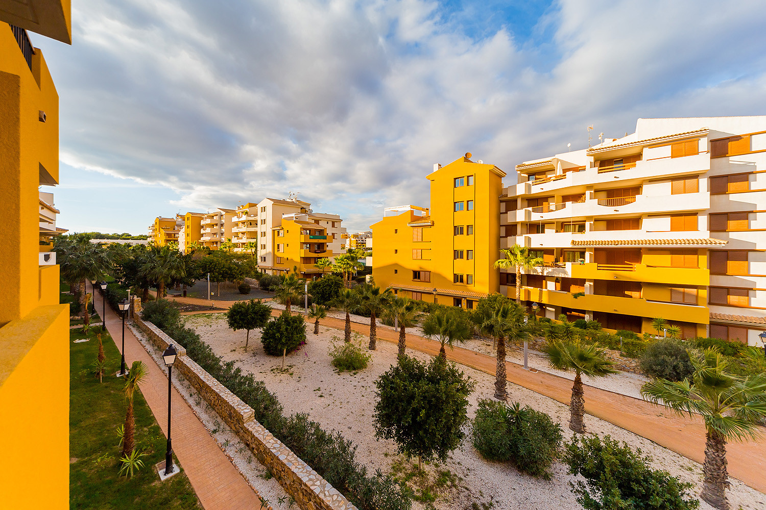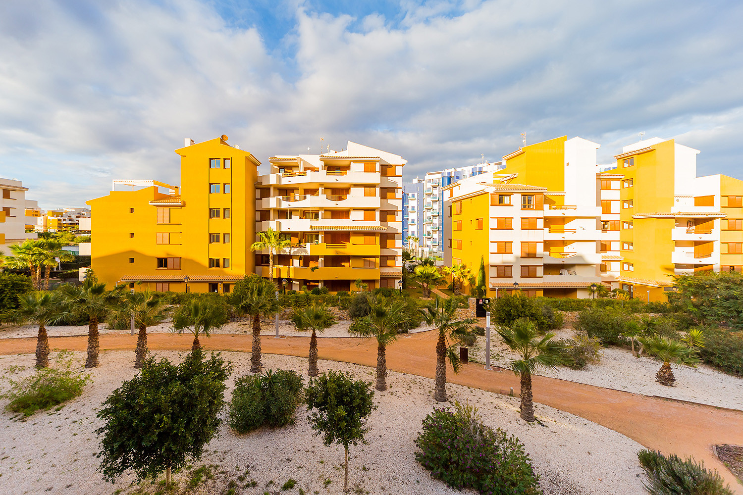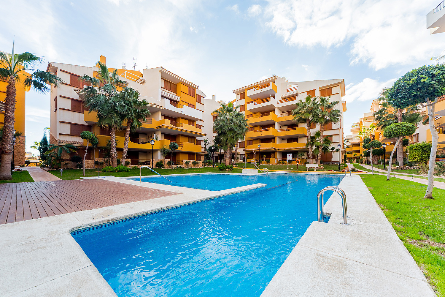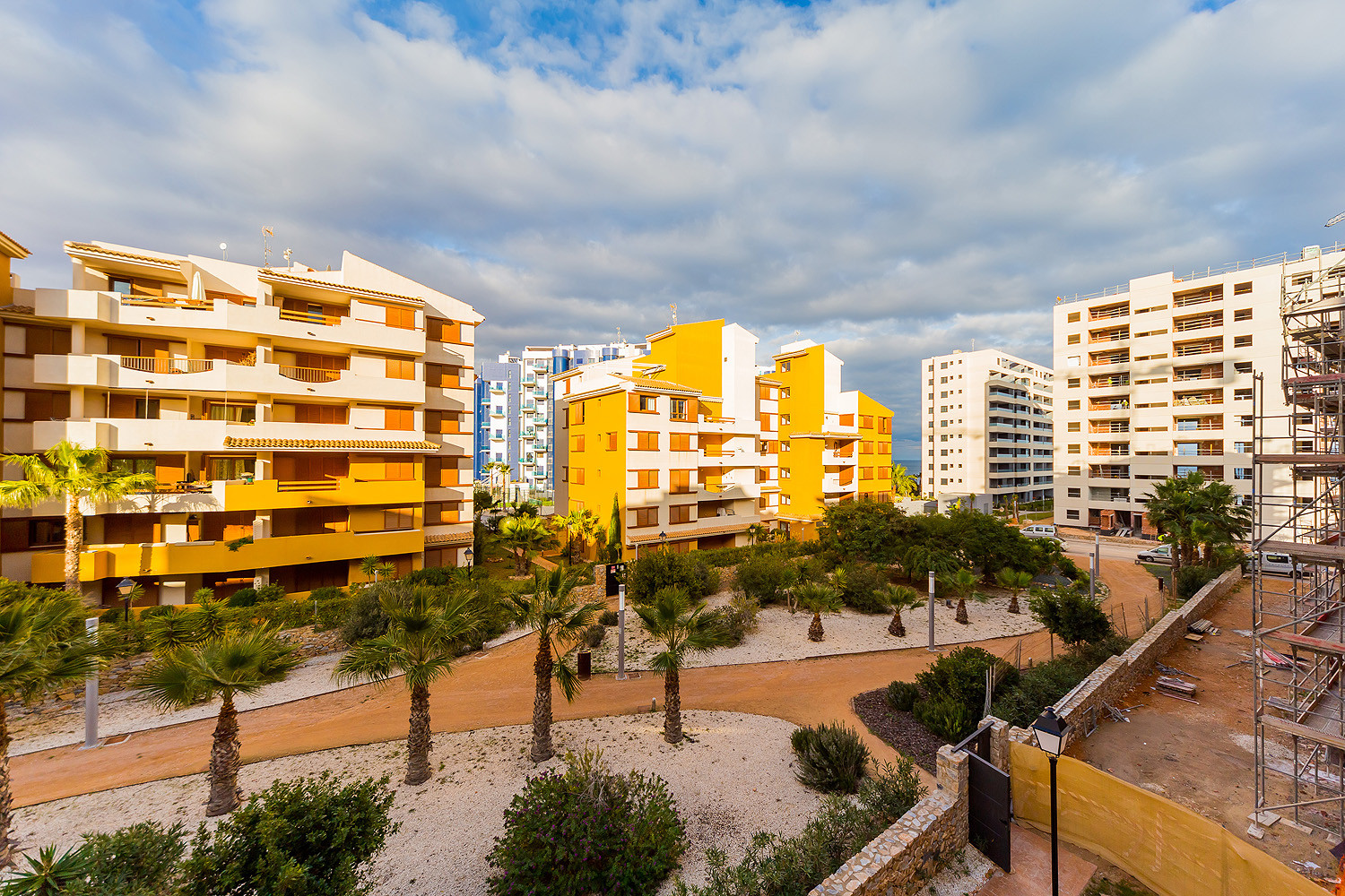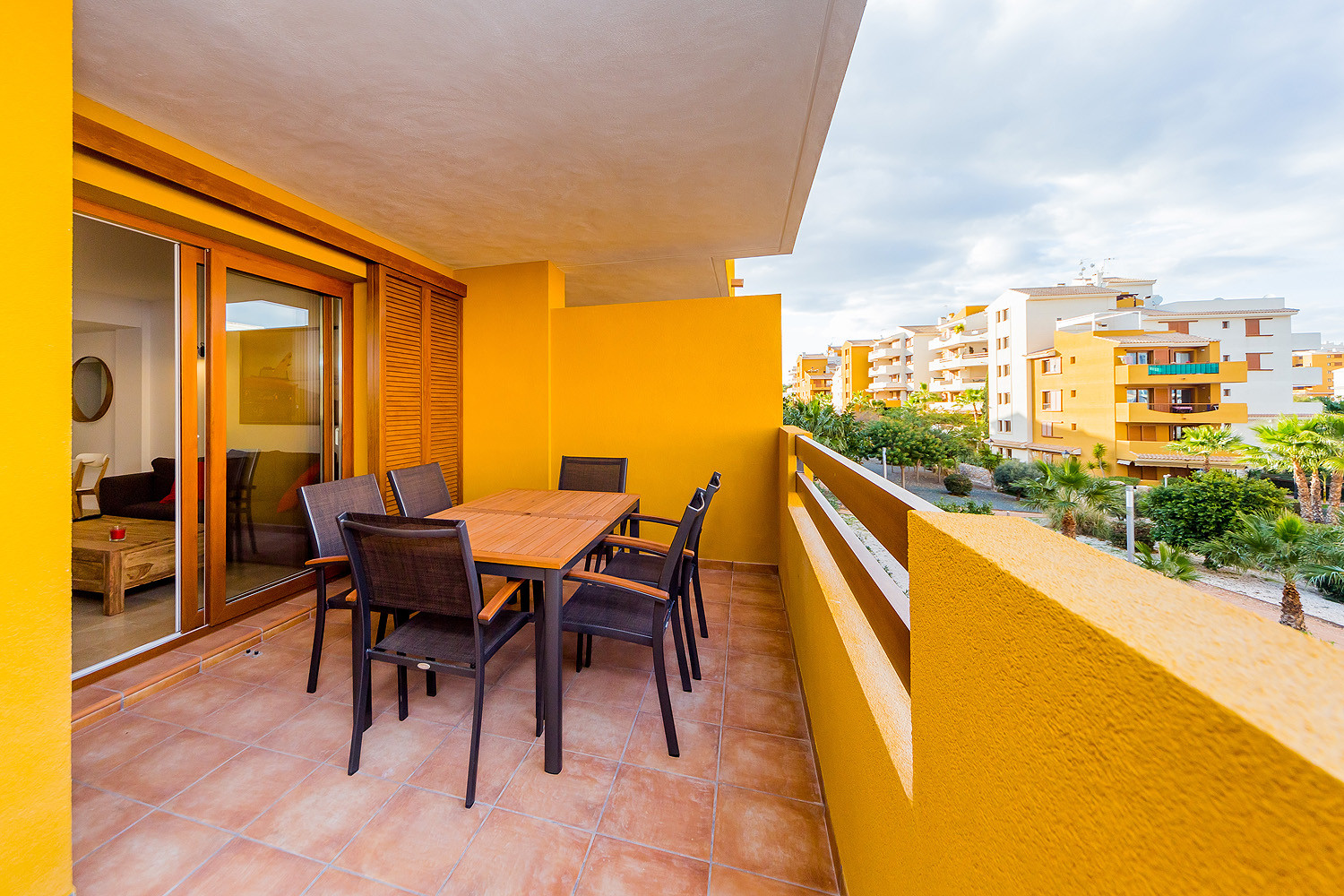 A spacious apartment the "Recoleta" cpmplex in Punta Prima It is spread out over 84 m2 and consists of a living room, three double bedrooms, two bathrooms, a kitchen and a private terrace. The apartment is equipped with furniture, appliances (including a coffee maker), dishes, linens and towels. The air conditioning is centrally controlled. There is a Smart TV with various channels, including Spanish, English and German. There is a private underground parking space.