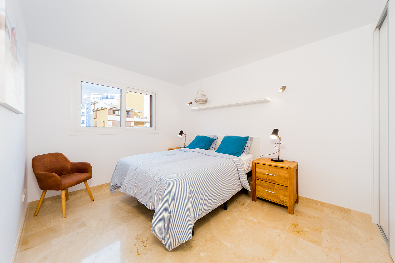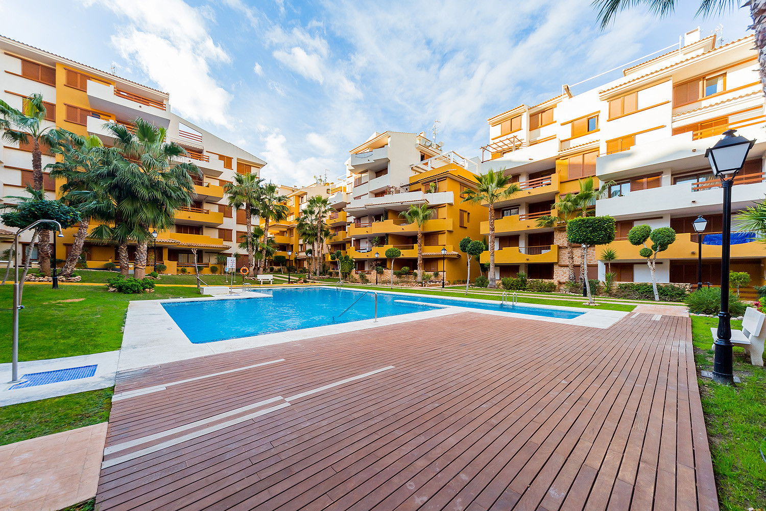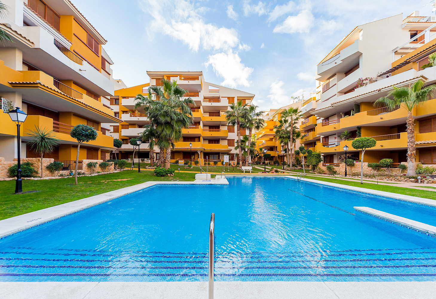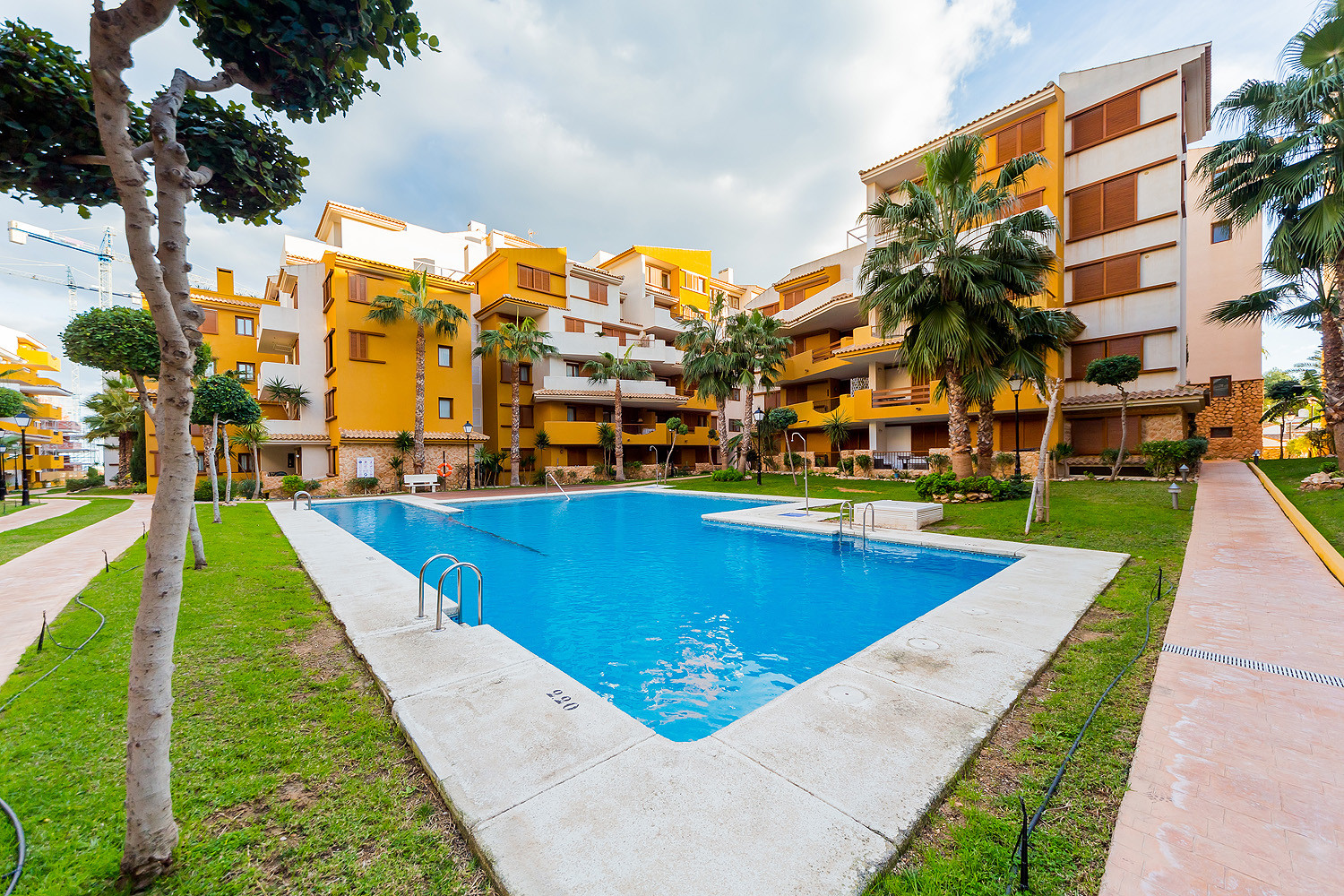 A spacious apartment the "Recoleta" cpmplex in Punta Prima It is spread out over 84 m2 and consists of a living room, three double bedrooms, two bathrooms, a kitchen and a private terrace. The apartment is equipped with furniture, appliances (including a coffee maker), dishes, linens and towels. The air conditioning is centrally controlled. There is a Smart TV with various channels, including Spanish, English and German. There is a private underground parking space.