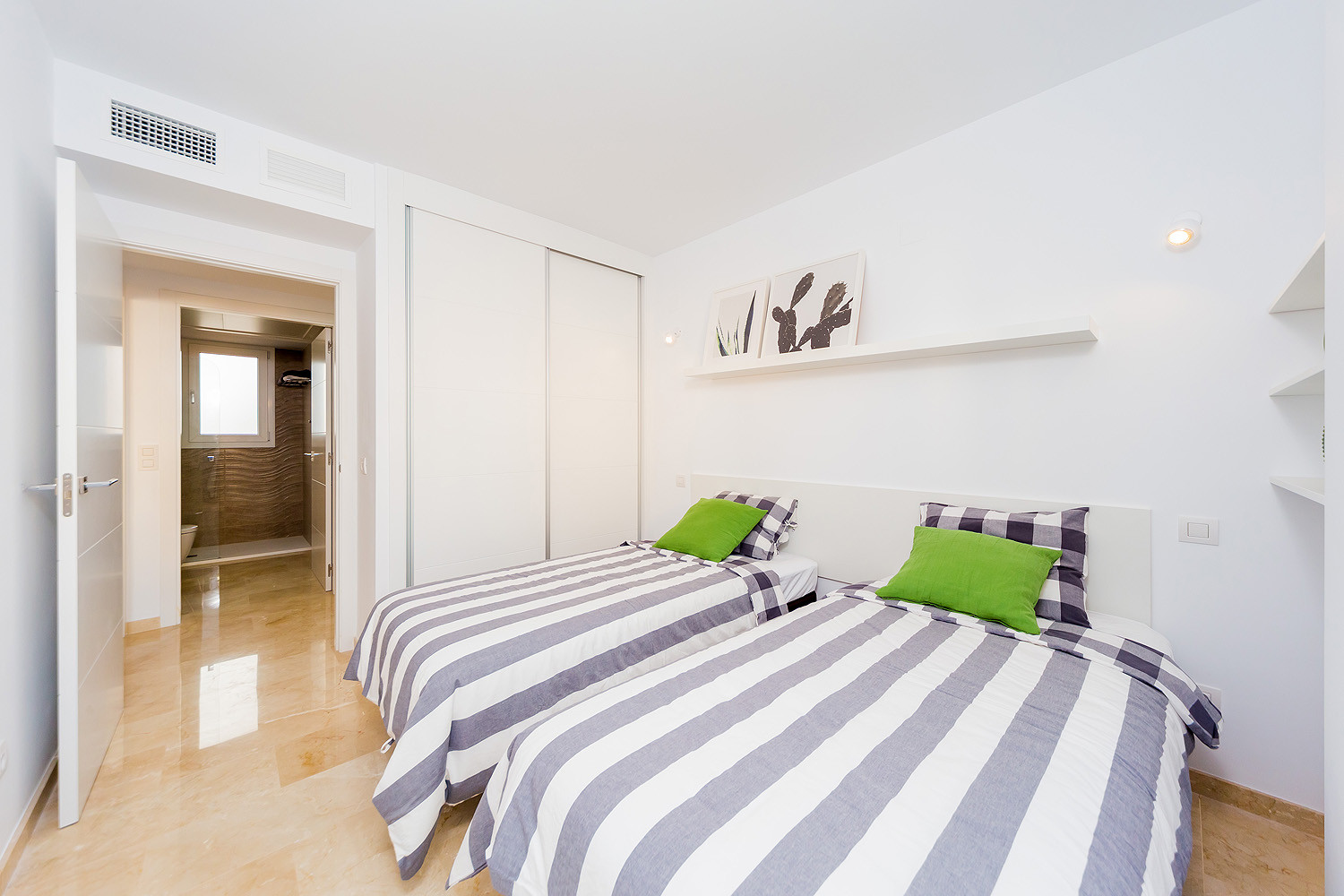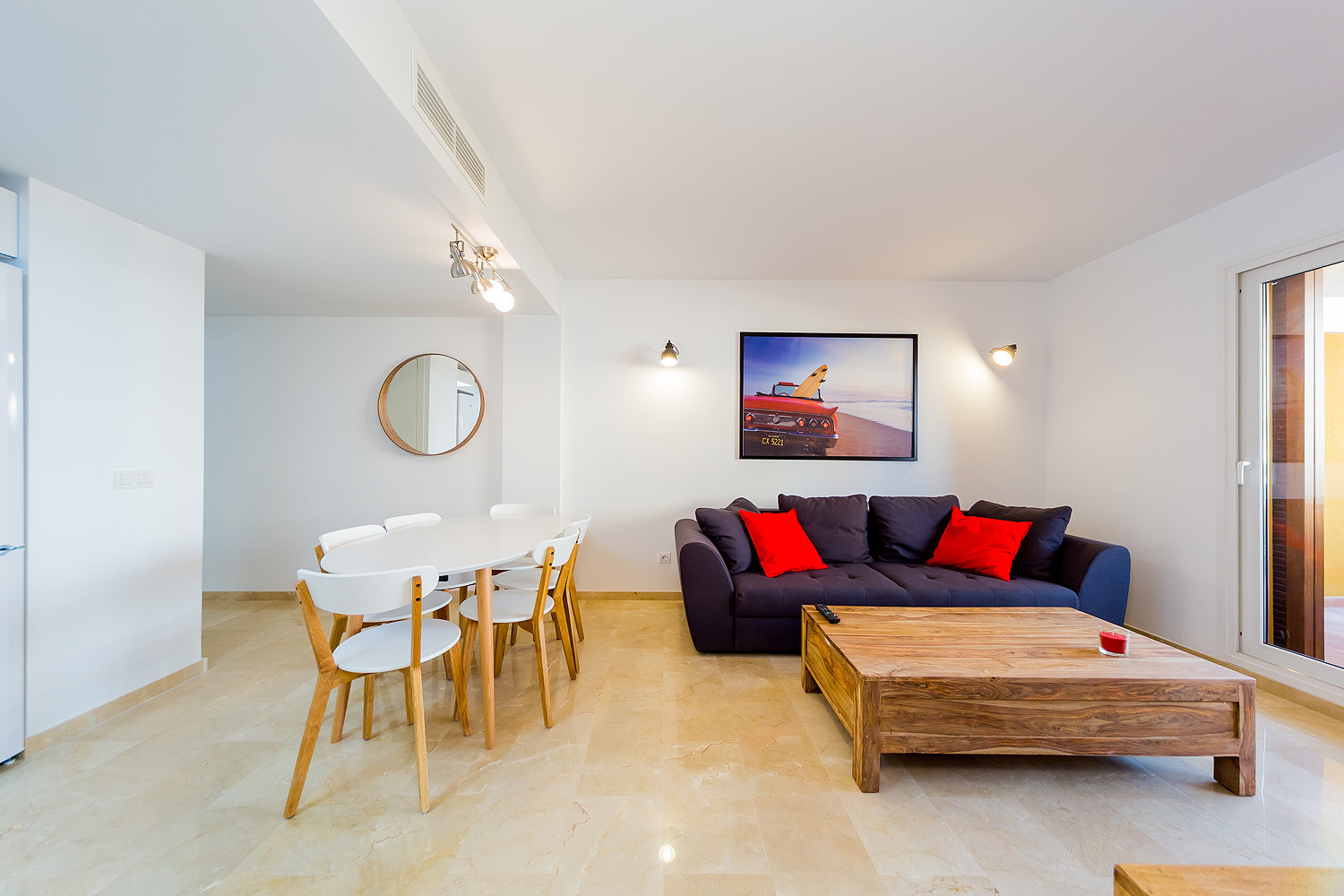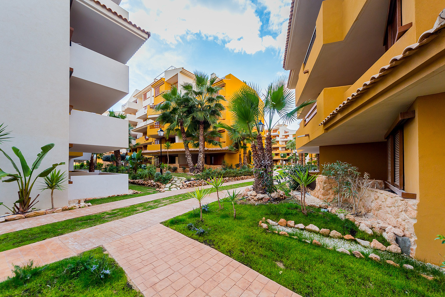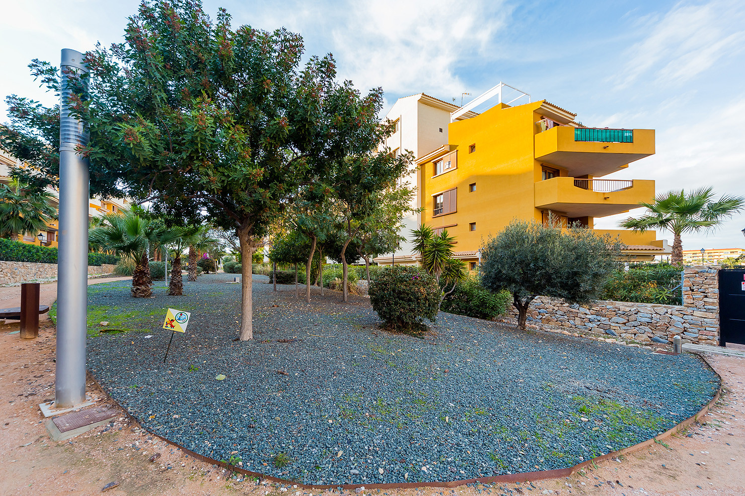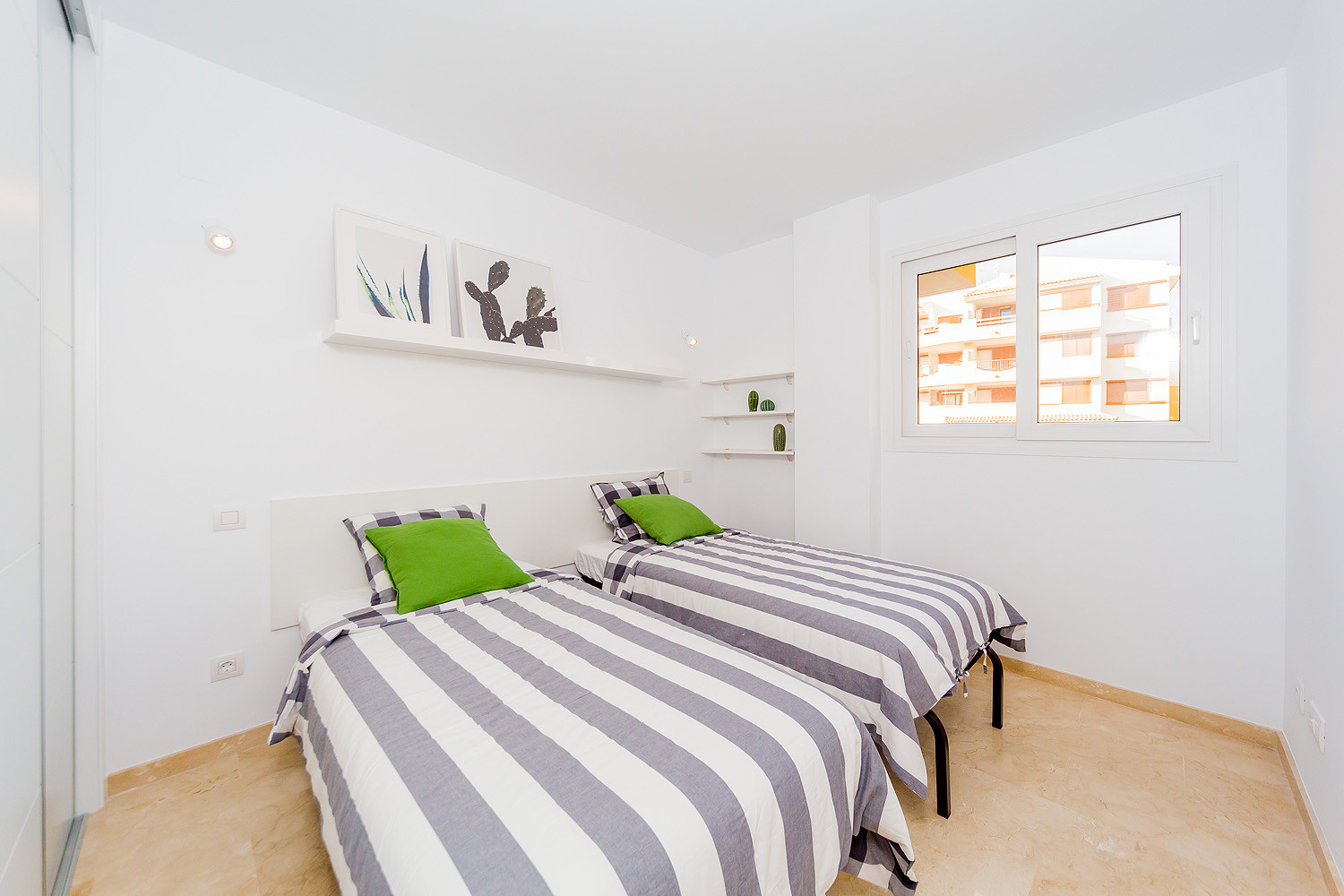 A spacious apartment the "Recoleta" cpmplex in Punta Prima It is spread out over 84 m2 and consists of a living room, three double bedrooms, two bathrooms, a kitchen and a private terrace. The apartment is equipped with furniture, appliances (including a coffee maker), dishes, linens and towels. The air conditioning is centrally controlled. There is a Smart TV with various channels, including Spanish, English and German. There is a private underground parking space.