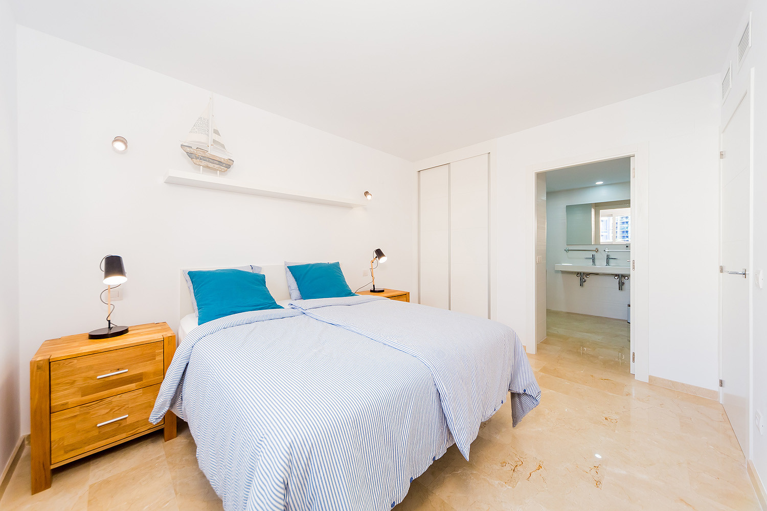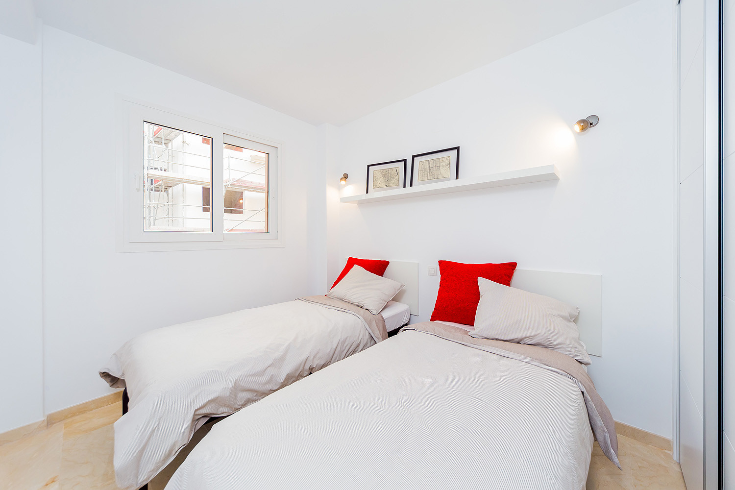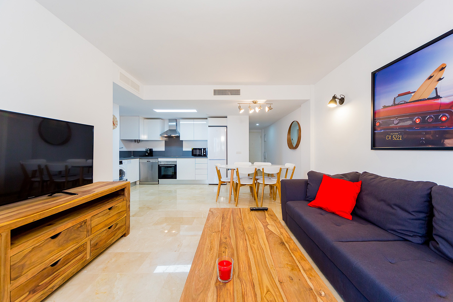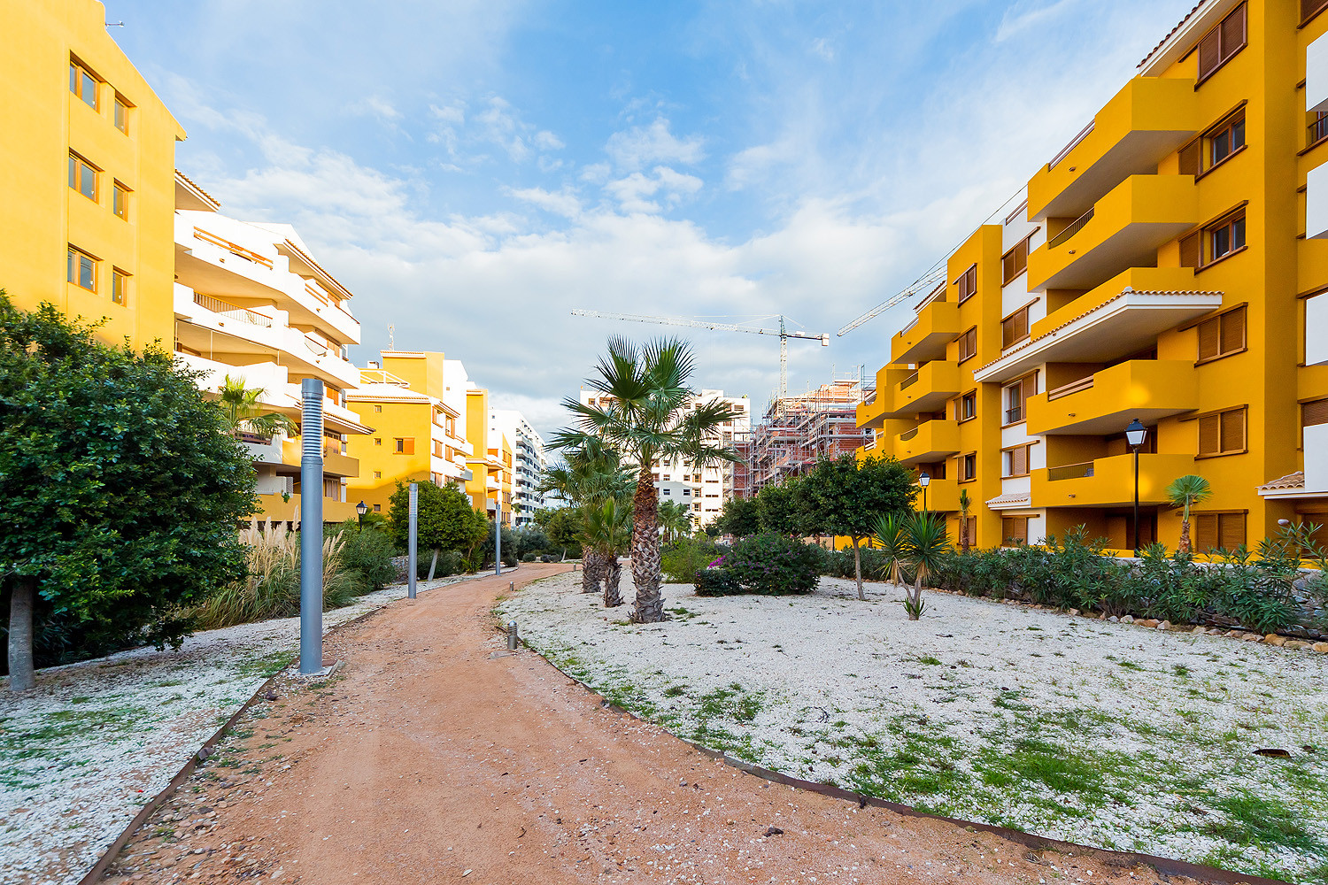 A spacious apartment the "Recoleta" cpmplex in Punta Prima It is spread out over 84 m2 and consists of a living room, three double bedrooms, two bathrooms, a kitchen and a private terrace. The apartment is equipped with furniture, appliances (including a coffee maker), dishes, linens and towels. The air conditioning is centrally controlled. There is a Smart TV with various channels, including Spanish, English and German. There is a private underground parking space.
