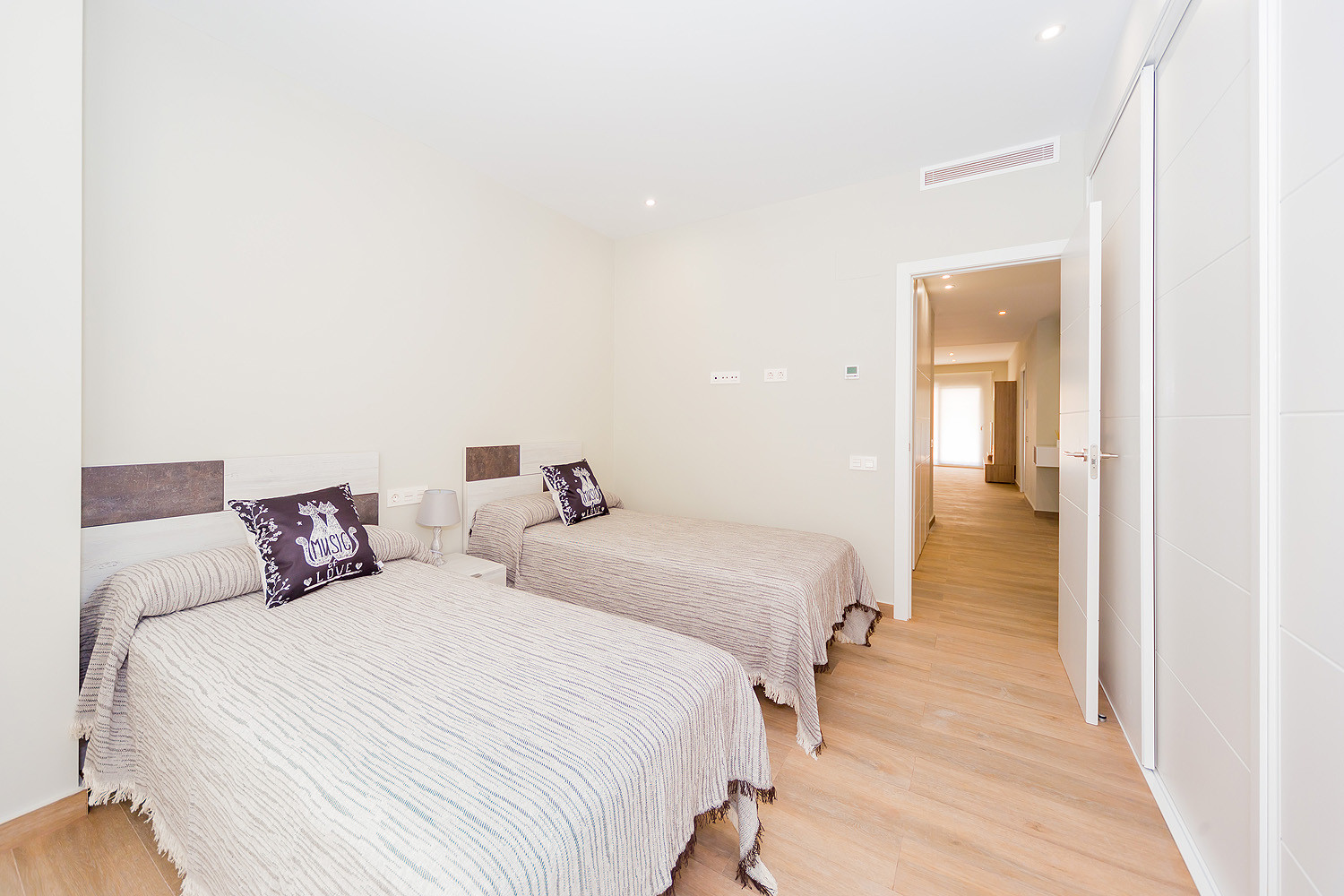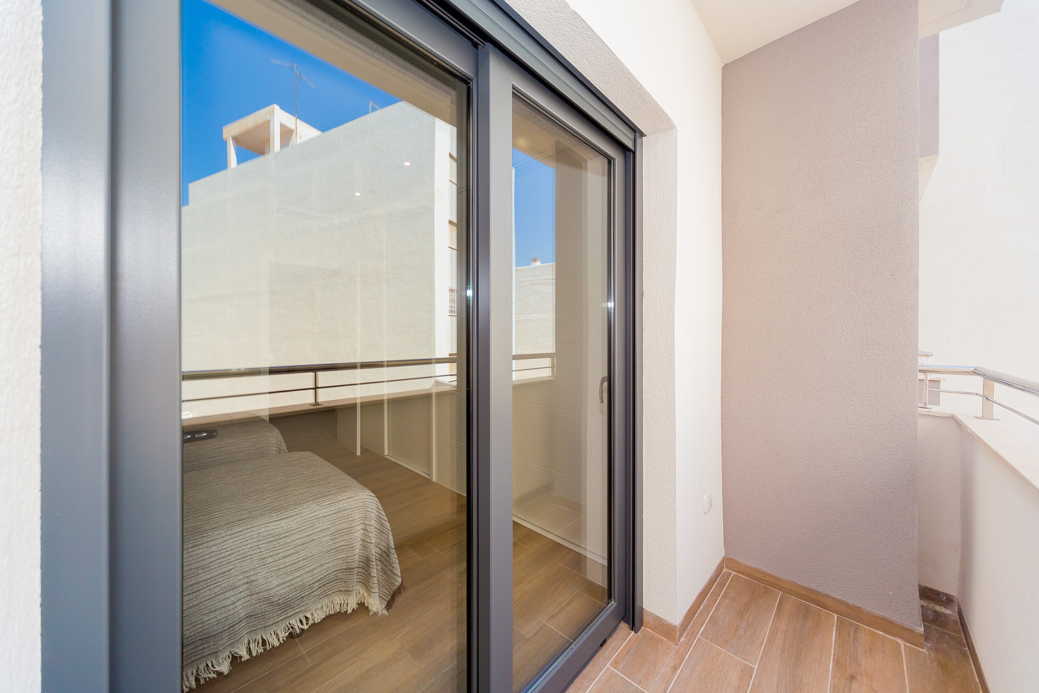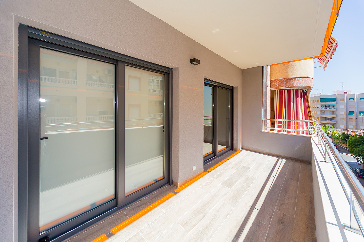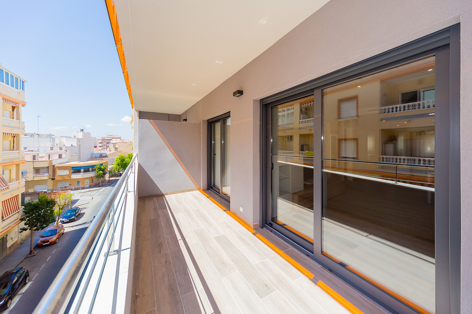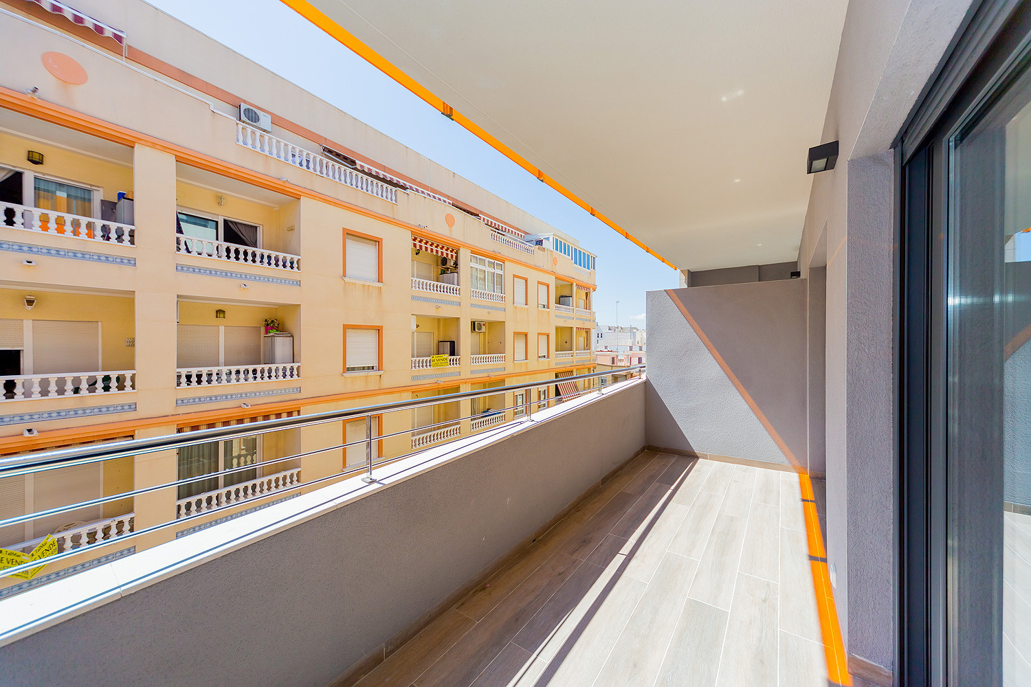 Excellent located two bedroom apartment for rent in a new complex in 2017 "Residencial Alegría III" with an area of 96 m2. The apartment consists of a bright and airy living room, two bedrooms, two bathrooms, a kitchenette and two balconies, one of which can be accessed from the living room and the other from the bedroom. It is fully equipped with new furniture and appliances (including dishwasher and coffee maker), dishes, bed linen and towels. Spanish television is also available. There is Central air conditioning. In the complex there is a salt water communal swimming pool with a Finnish sauna. Bars, restaurants, supermarkets, the central bus station of Torrevieja and much more local amenities are all within walking distance. To the sea, the promenade and the blue flag beach of Del Cura is only three minute’s walk away. It sleeps upto 6 people and smoking is only allowed on the balconies. There is no English television but almost all the shows and movies on Spanish channels can be seen in the original version (English).