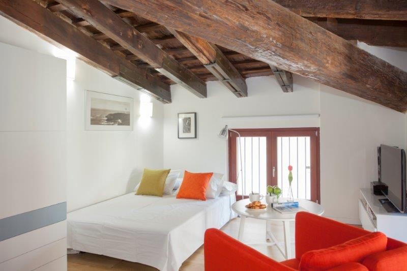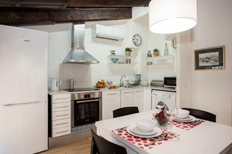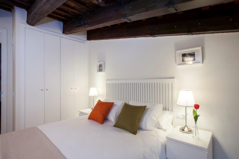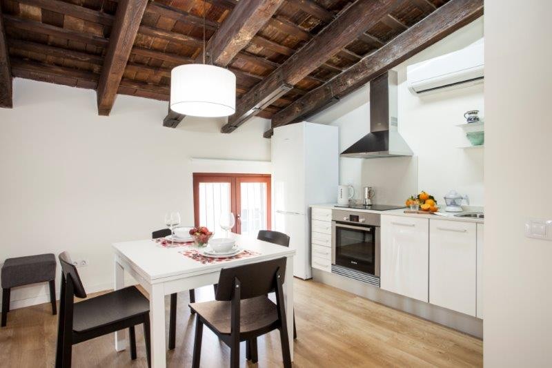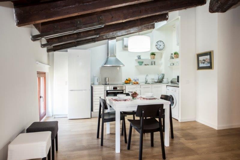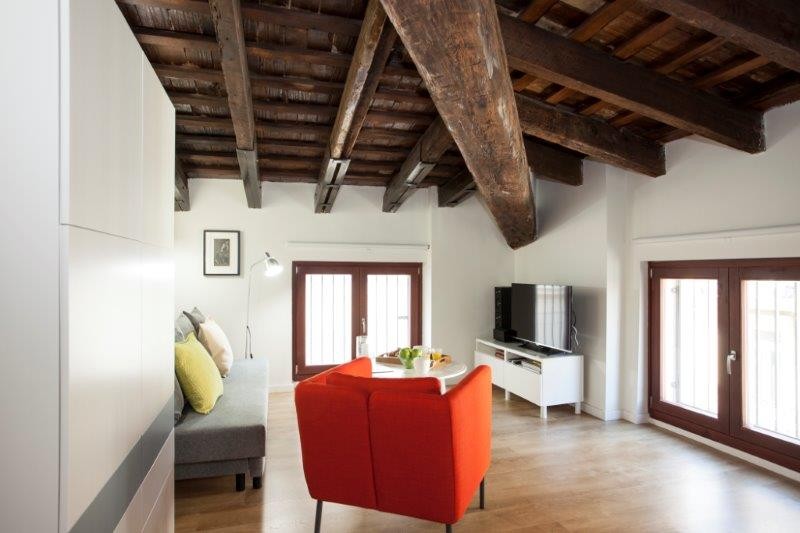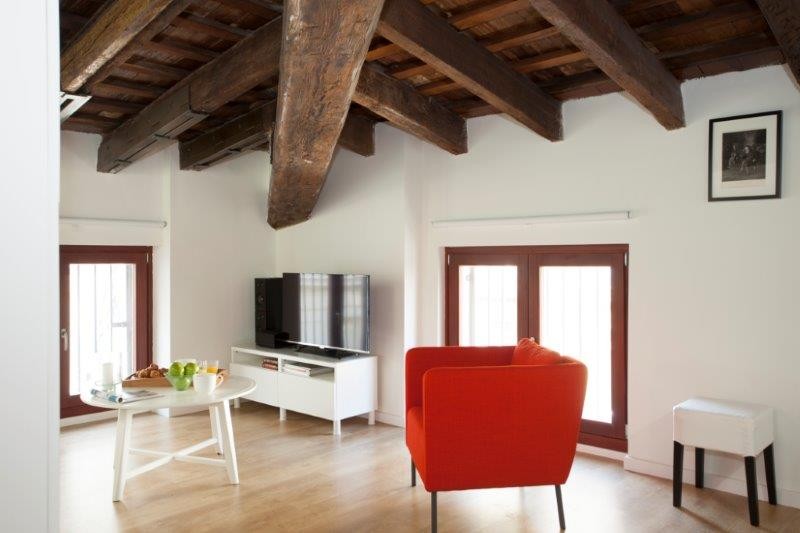 Cozy studio in the centre of Valencia with parquet flooring, wooden beams on the ceiling and white walls. Open kitchen to the comfortable living room of the house, fully equipped for your maximum comfort.