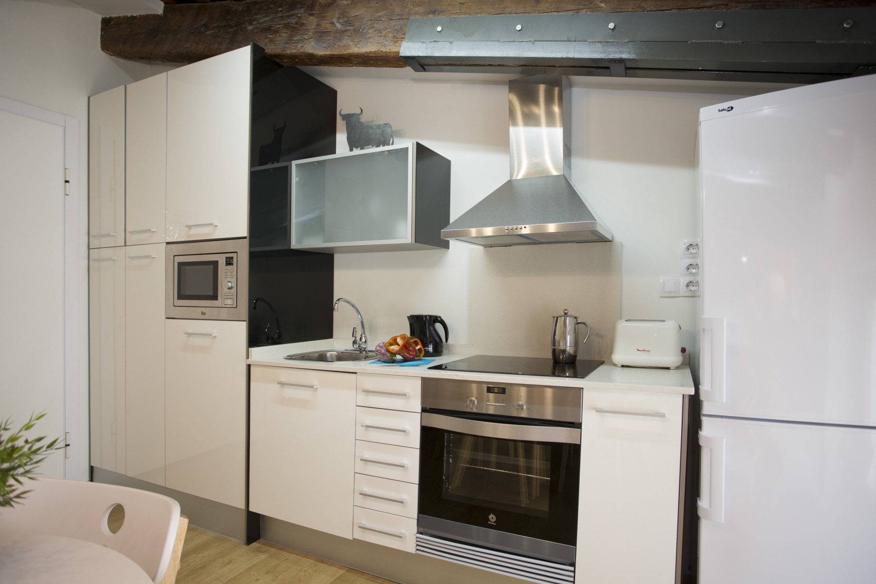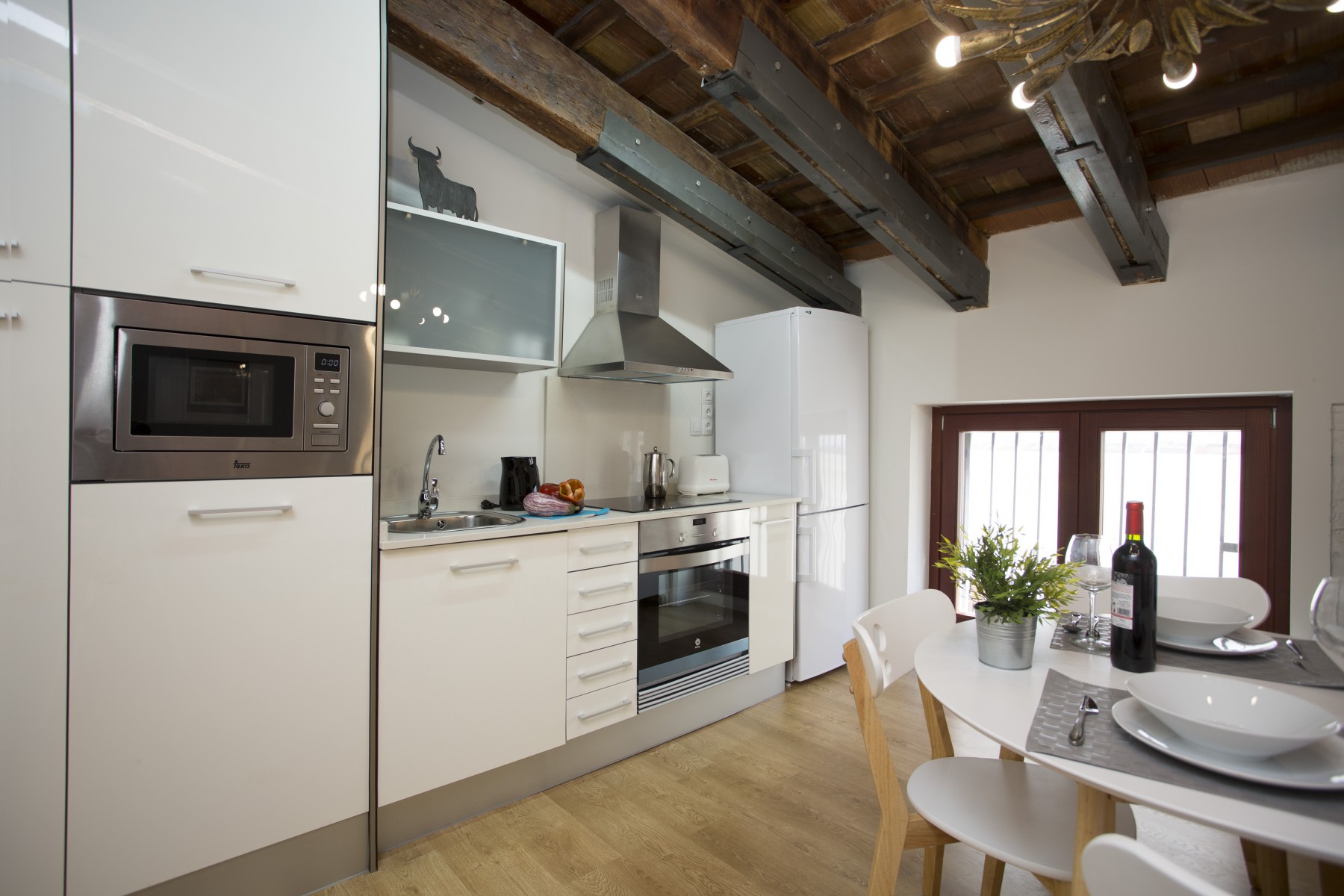 In the vitroceramic open plan kitchen, refrigerator, microwave, oven, freezer, washing machine, dishes/cutlery, kitchen utensils, coffee machine and toaster are provided.