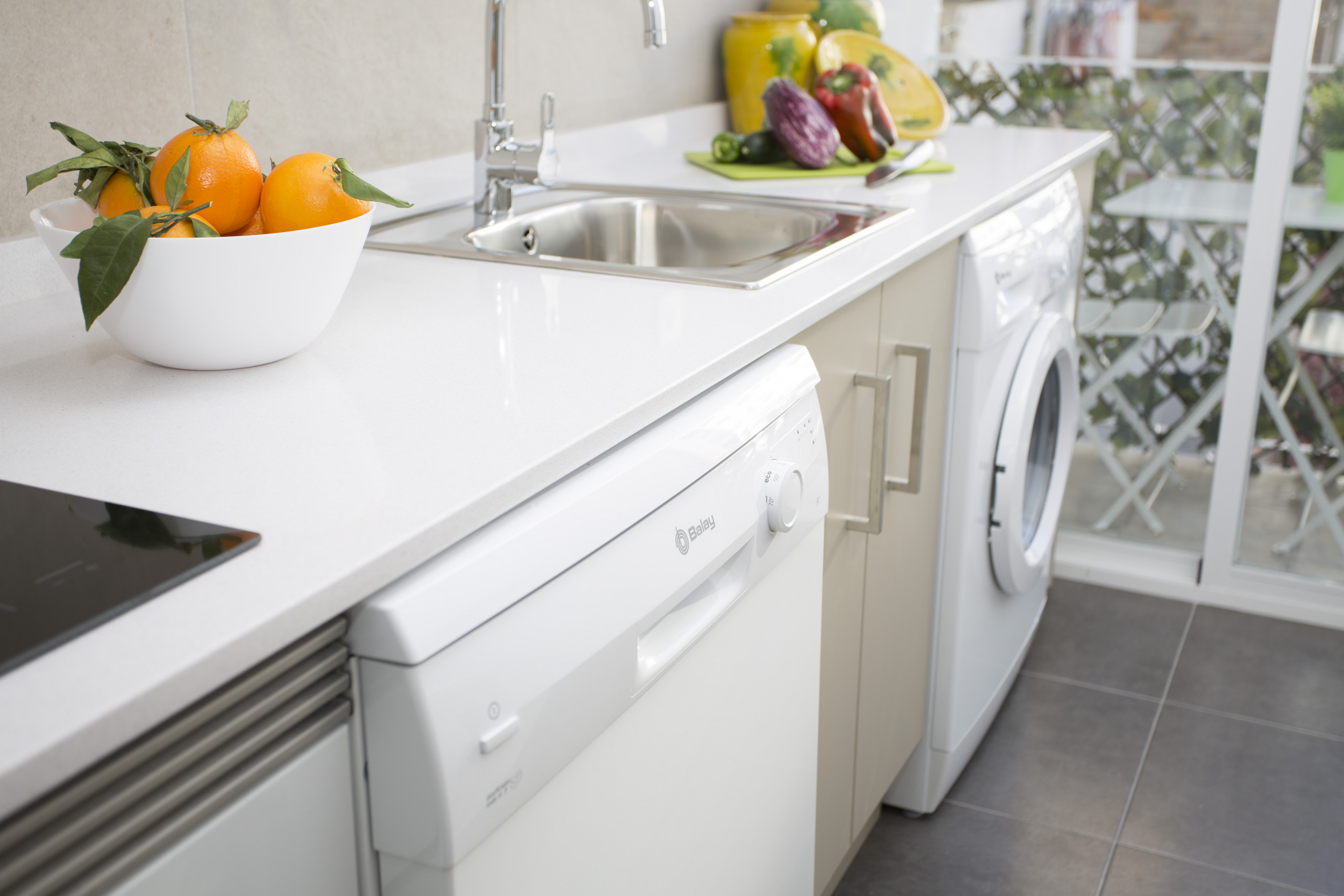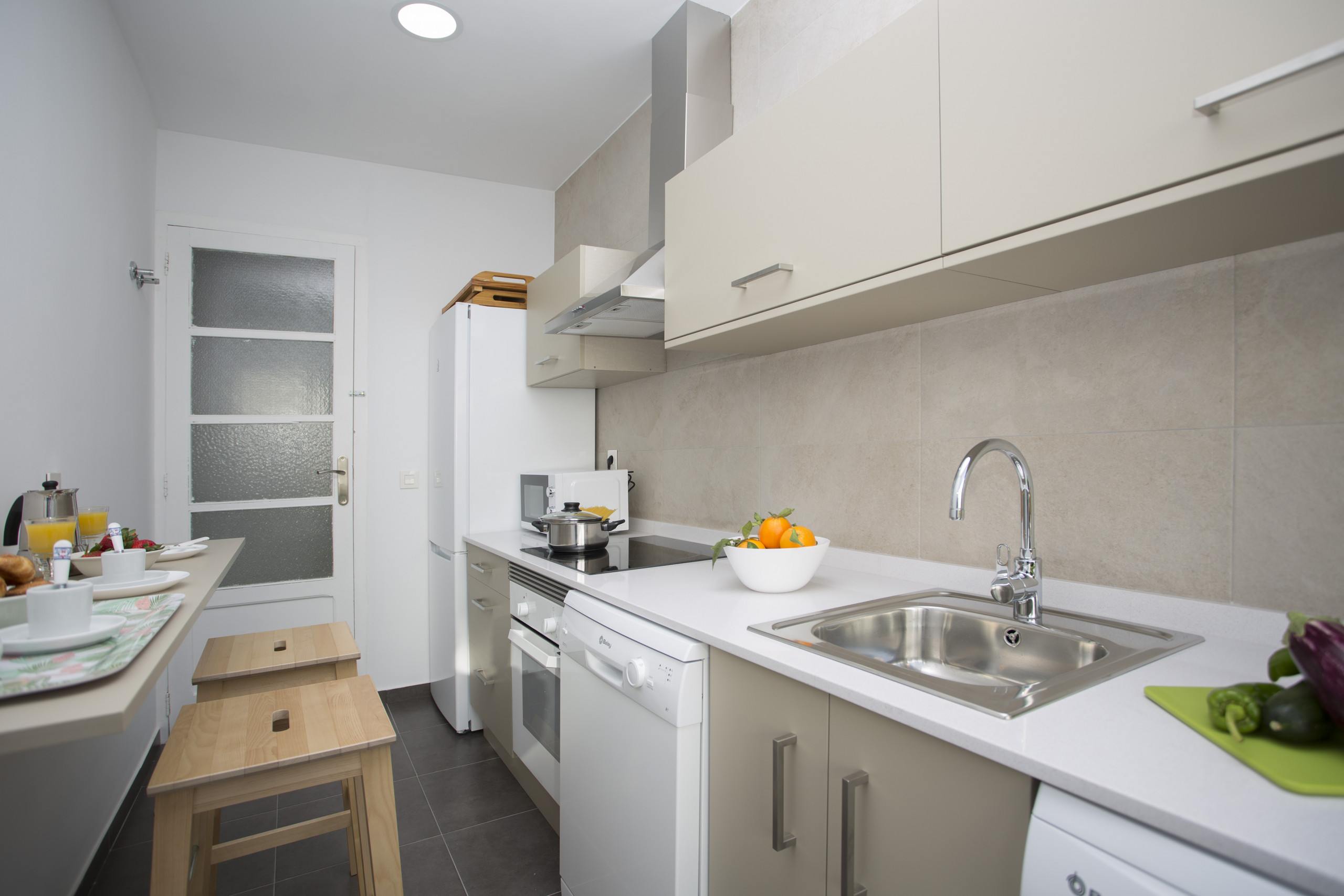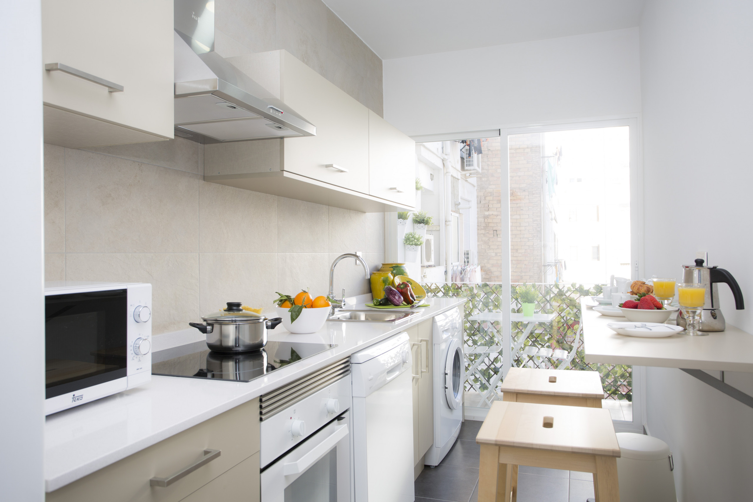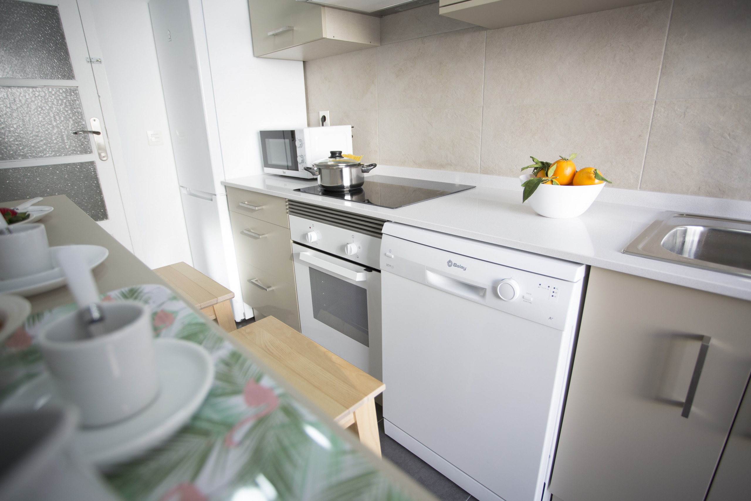 In the vitroceramic independent kitchen, refrigerator, microwave, oven, freezer, washing machine, dishwasher, dishes/cutlery, kitchen utensils, coffee machine, toaster, kettle and juicer are provided.
