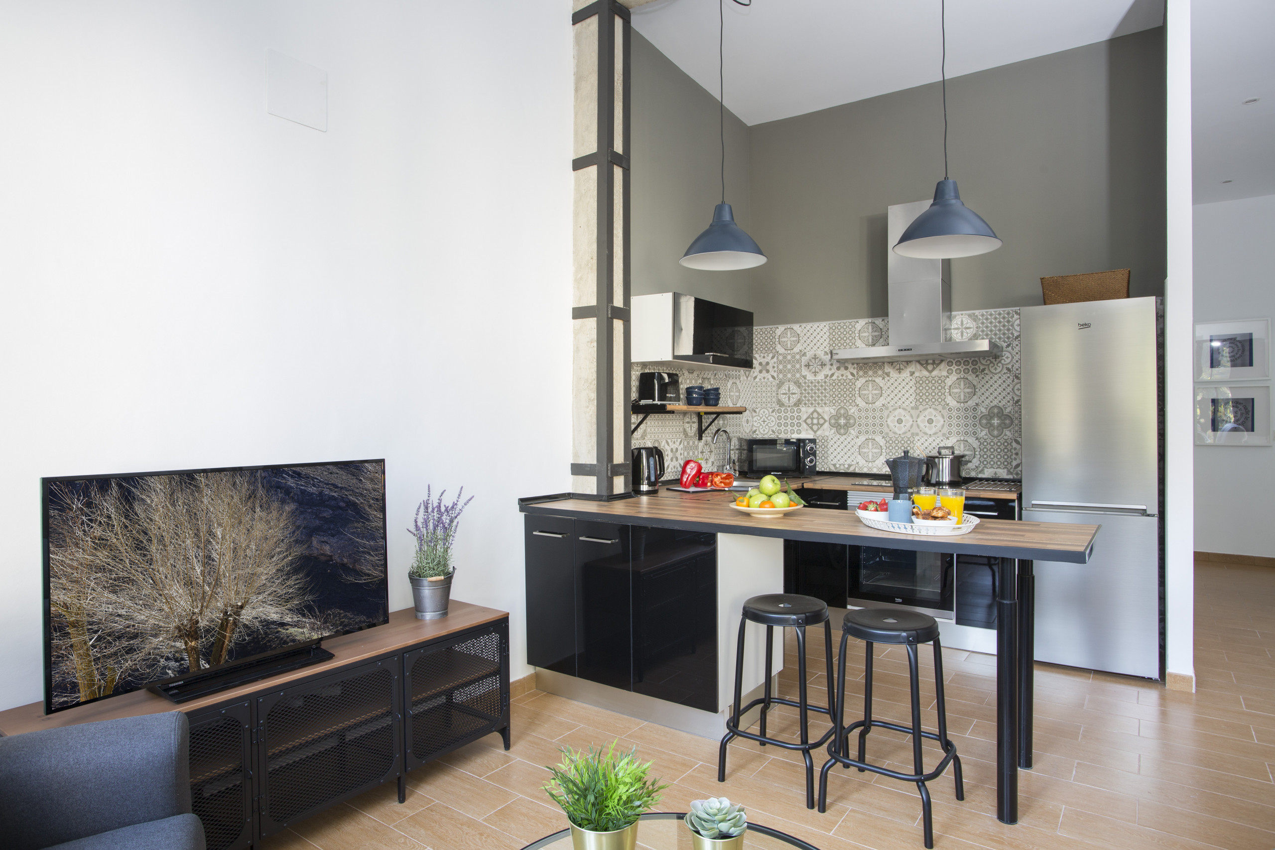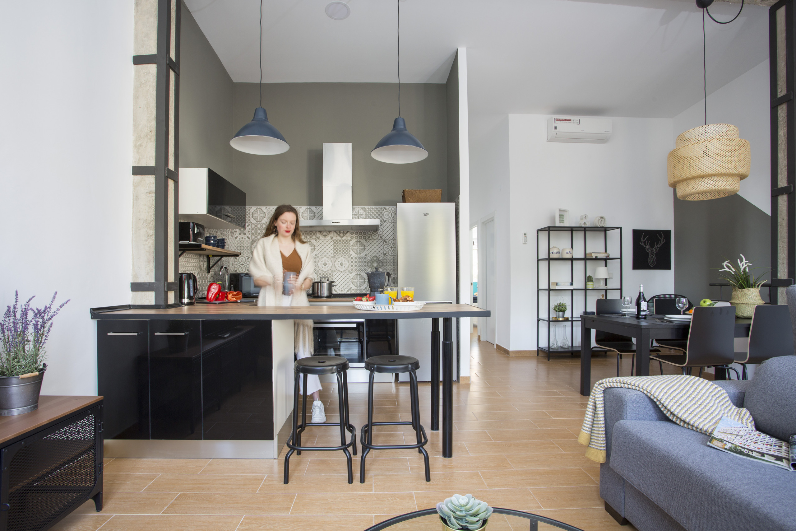 In the vitroceramic open plan kitchen, refrigerator, microwave, oven, freezer, washing machine, dishes/cutlery, kitchen utensils, coffee machine, toaster, kettle and juicer are provided.