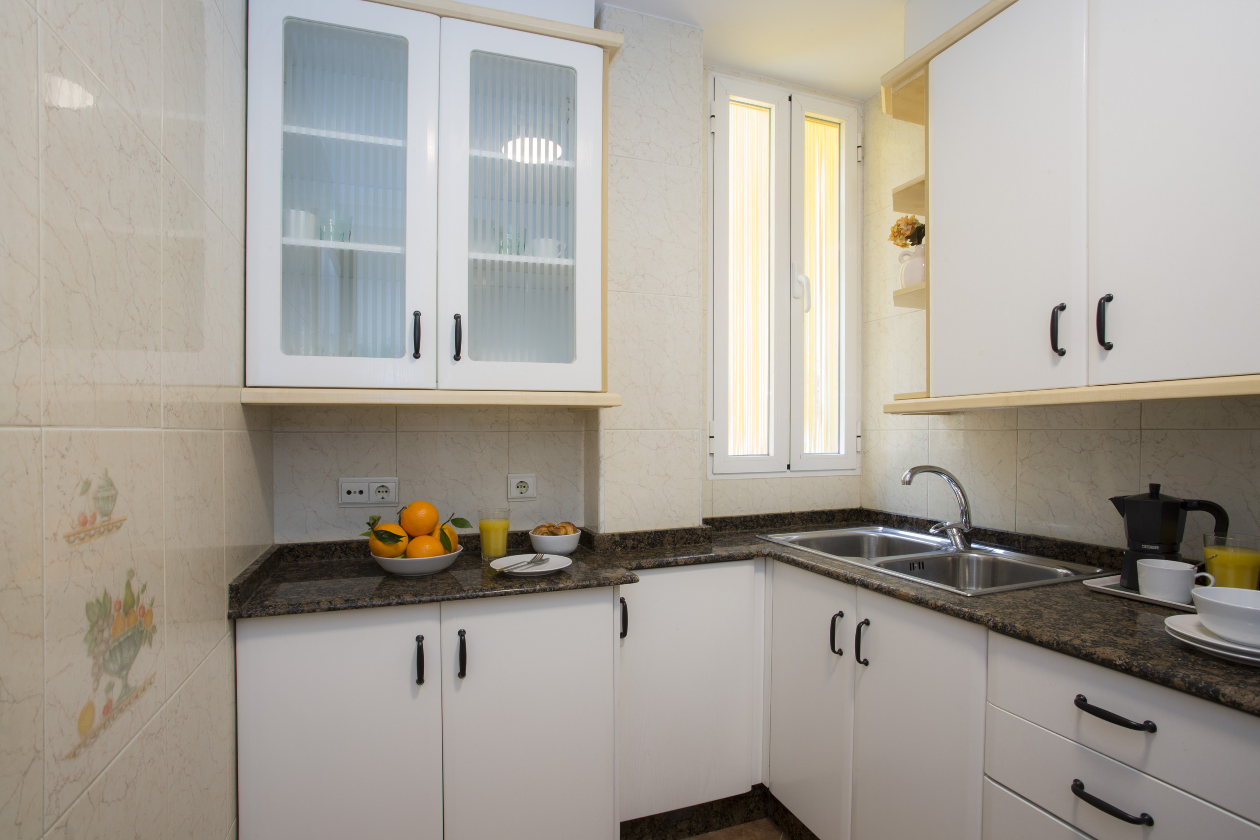 In the vitroceramic independent kitchen, refrigerator, microwave, oven, freezer, washing machine, dishes/cutlery and kitchen utensils are provided.