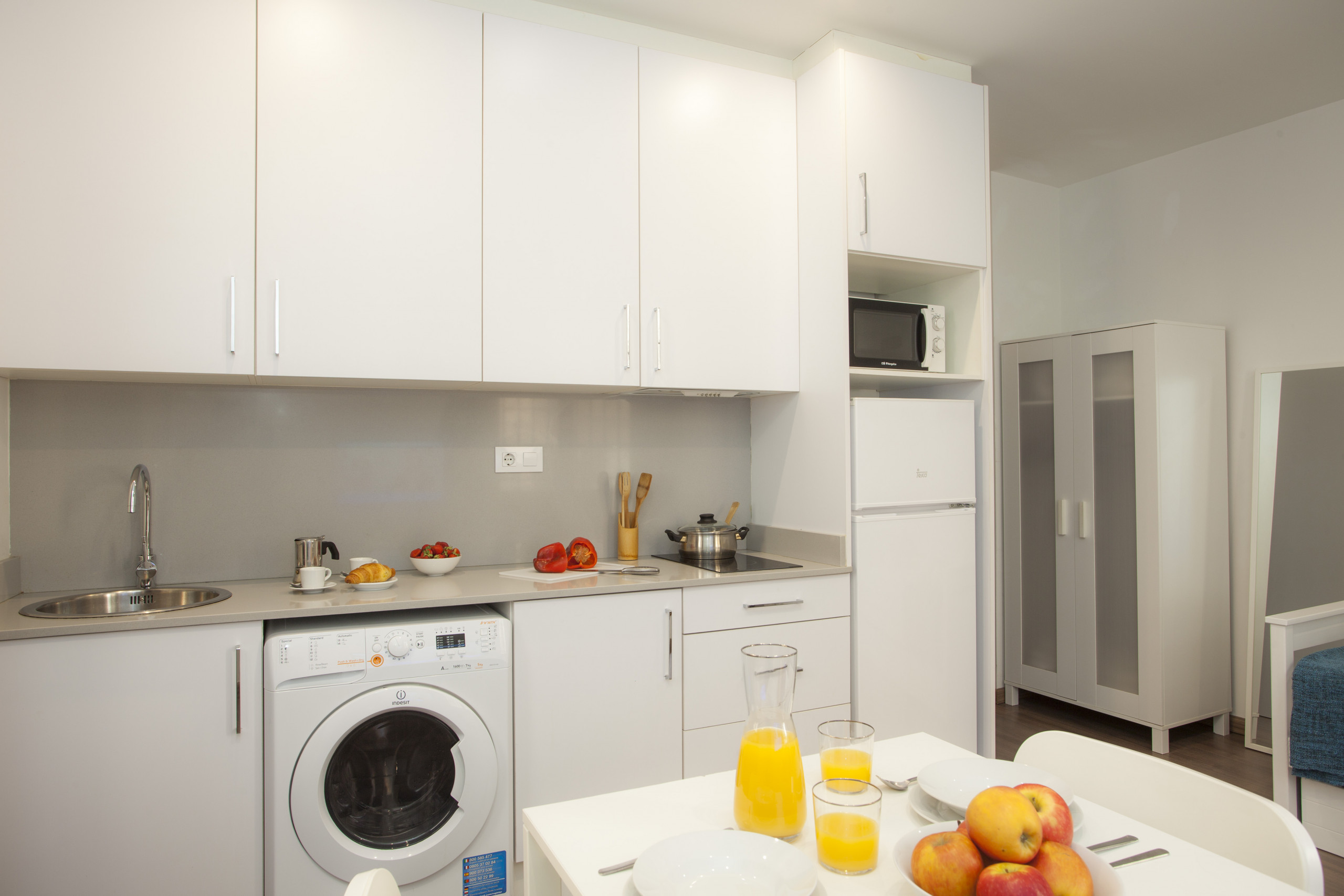 In the electric open plan kitchen, refrigerator, microwave, freezer, washing machine, dishes/cutlery, kitchen utensils and coffee machine are provided.