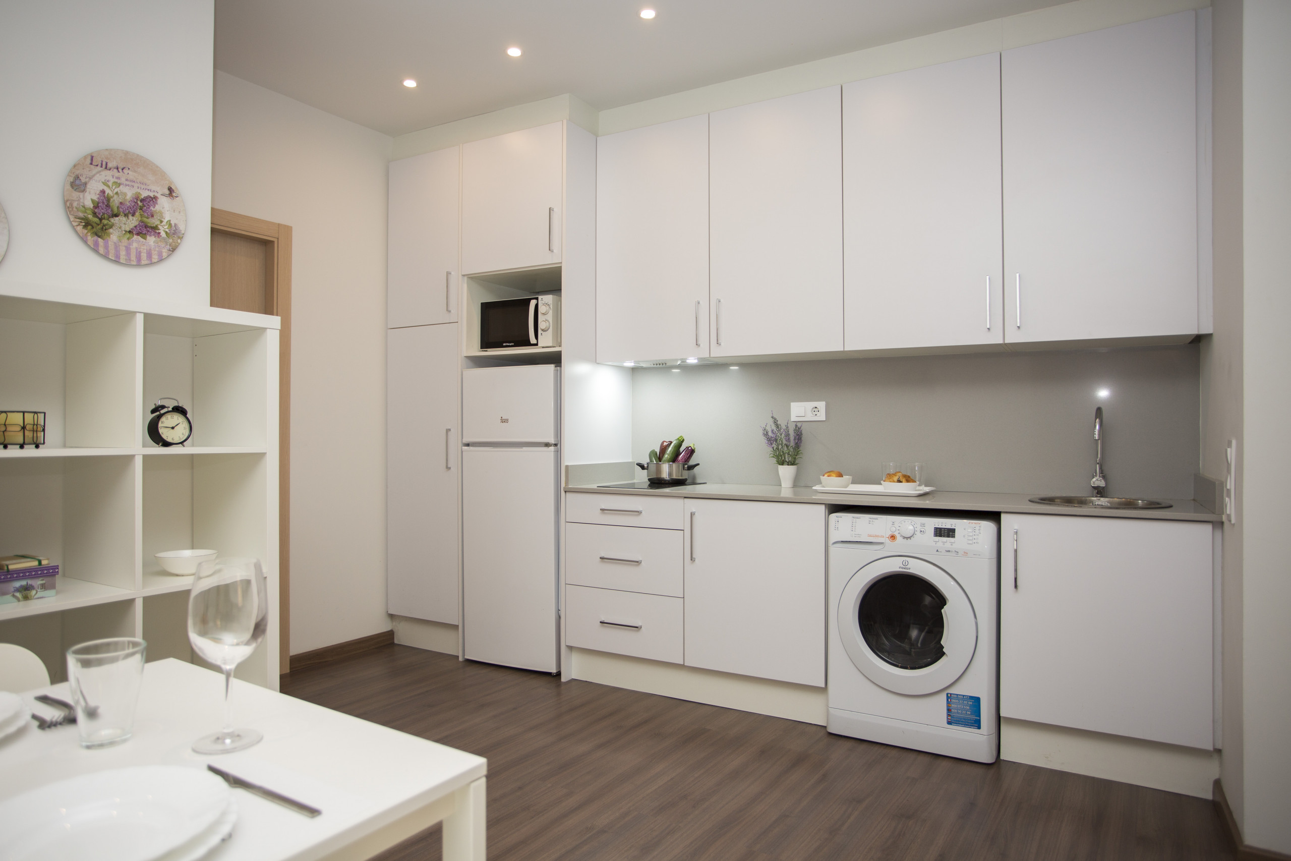 In the vitroceramic open plan kitchen, refrigerator, microwave, freezer, dishes/cutlery and kitchen utensils are provided.