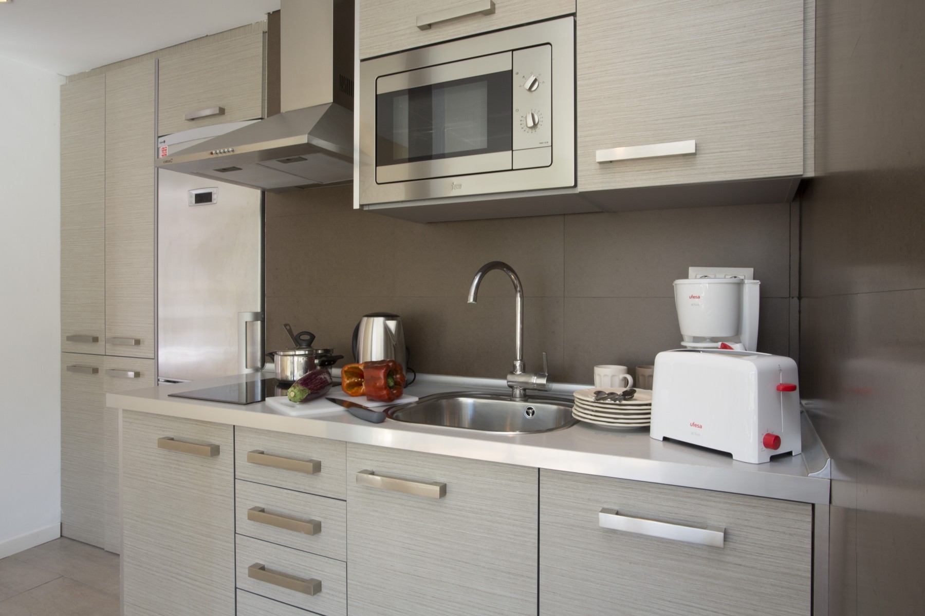 Es ist alles da: bequeme und moderne Möblierung, gut ausgestattete Küche, ein kleiner Balkon mit Tischchen und Stühlen.