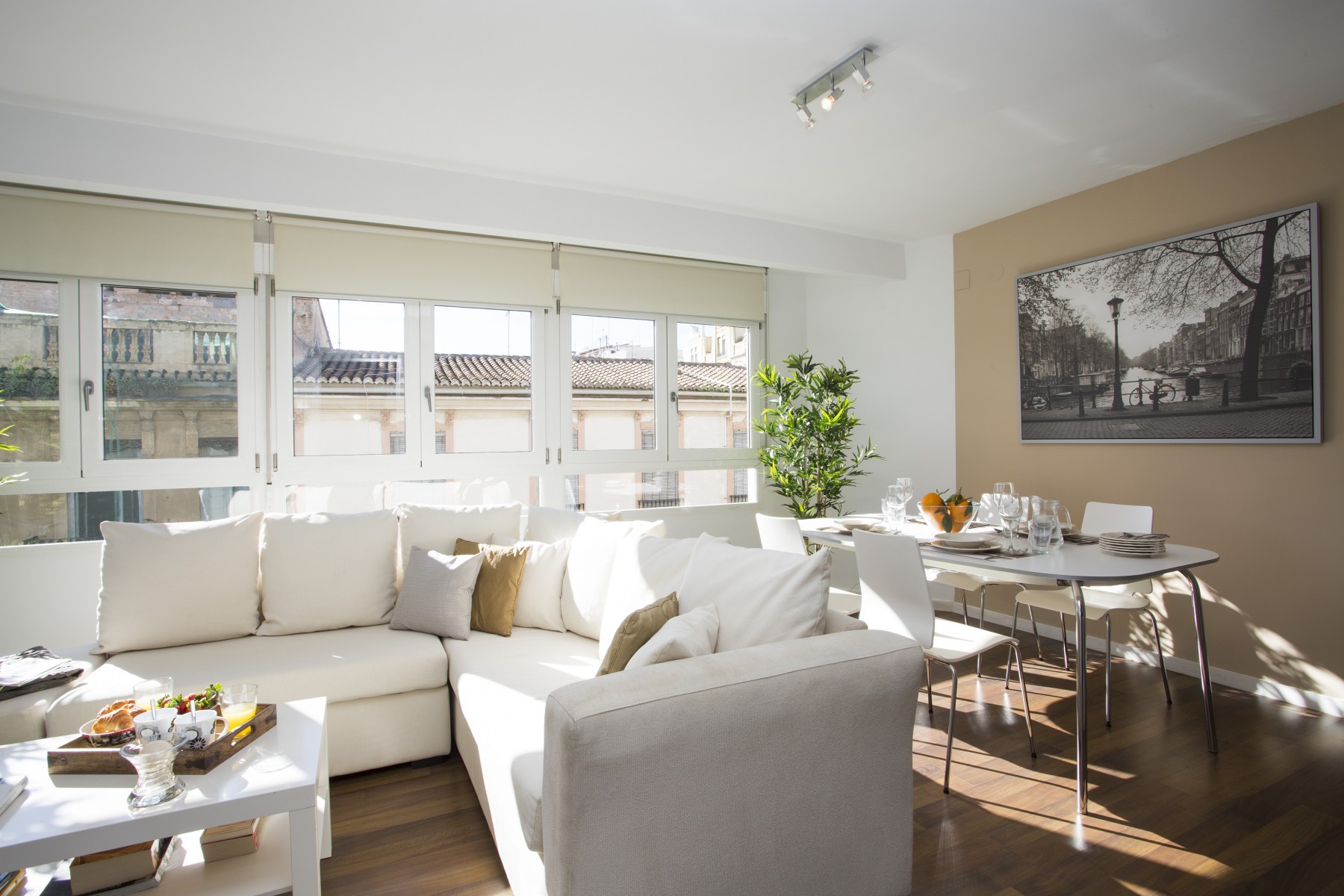 The large windows of the main bedroom of this apartment make this space a very bright and spacious place, since from there you can access to the cozy balcony that has the property, equipped with a table for two where you can enjoy some magnificent sunrises under the Sun of Valencia. The living / dining room consists of new and modern furniture, which overlooks the fully equipped American kitchen.