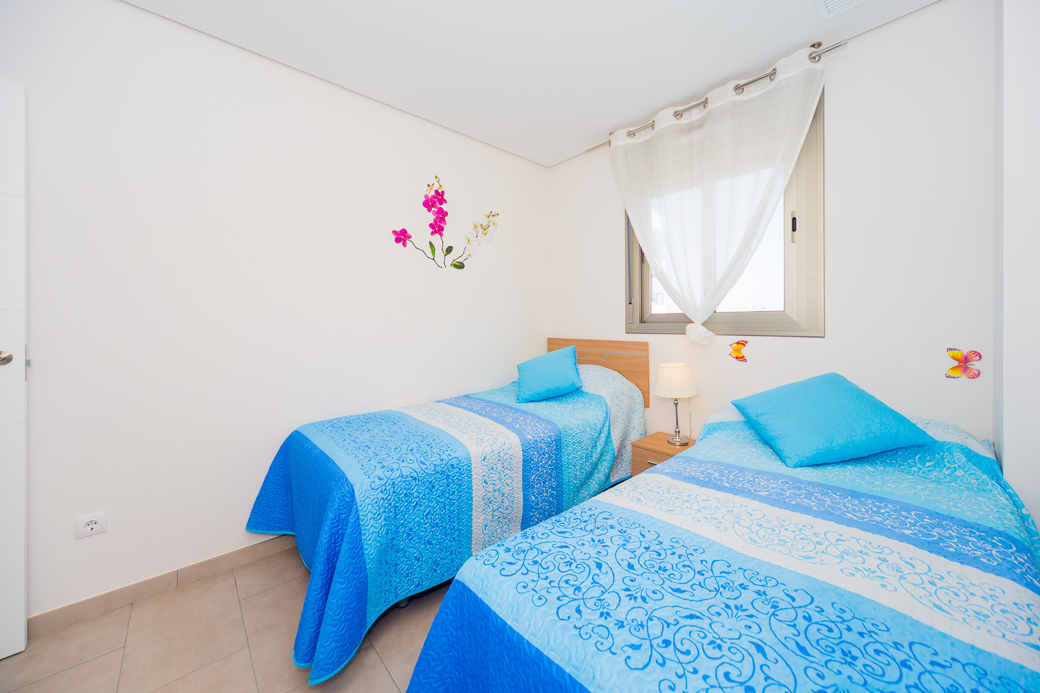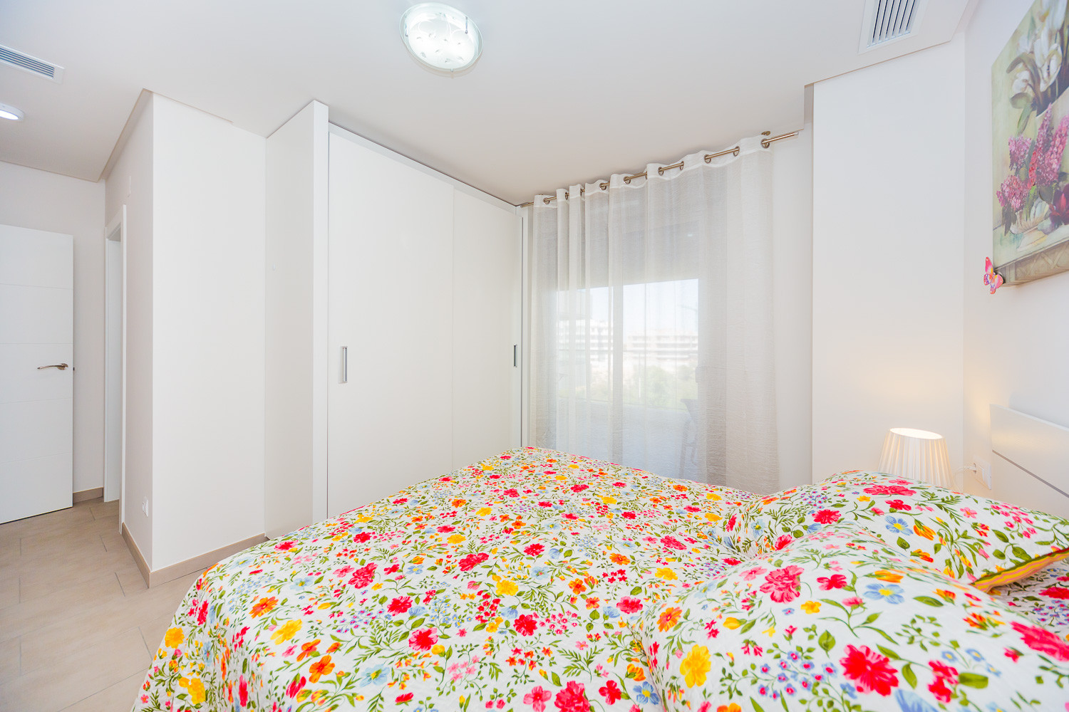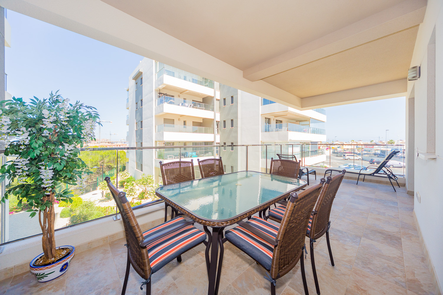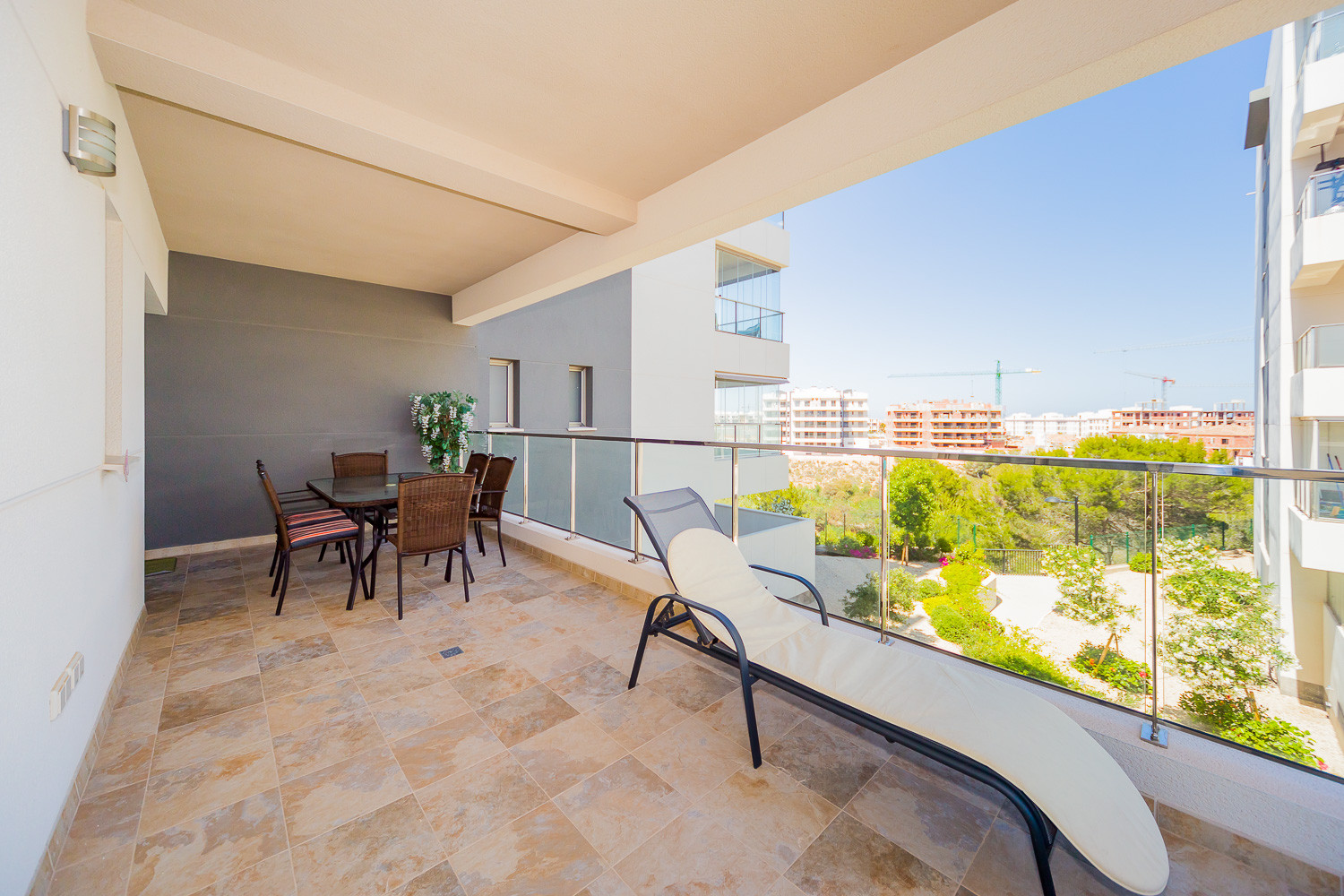 This apartment is located in Villamartin on the Orihuela Costa. It consists of two bedrooms, a large living room with kitchen, two bathrooms and a large balcony. Located in a closed urbanization with lovely maintained communal swimming pools, parking, sauna, sports hall and a green garden area. It is approximately 95 m2. The apartment is equipped with new furniture, appliances (including dishwasher), central air conditioning, kitchen utensils, bed linen and towels. Spanish television is also available. There are 2 communal swimming pools, jacuzzi, sauna, sports hall and children's games. There is a private parking space. It is walking distance to supermarkets, bars and restaurants and much more. The beach is a 7-10 minute drive away. The apartment sleeps up to 6 people (no pets allowed!). Smoking is only allowed on the balcony or terrace! There is no English television but almost all the shows and movies on Spanish channels can be seen in the original version (English).
