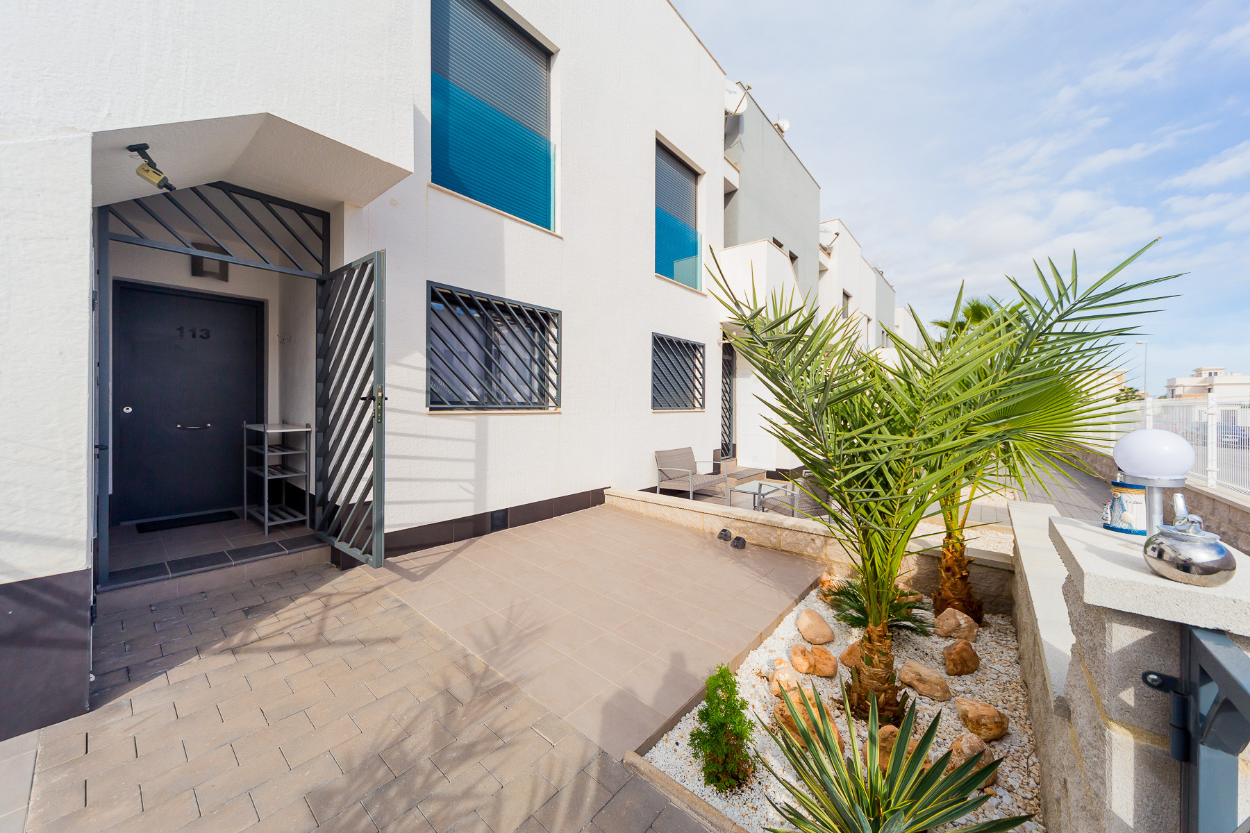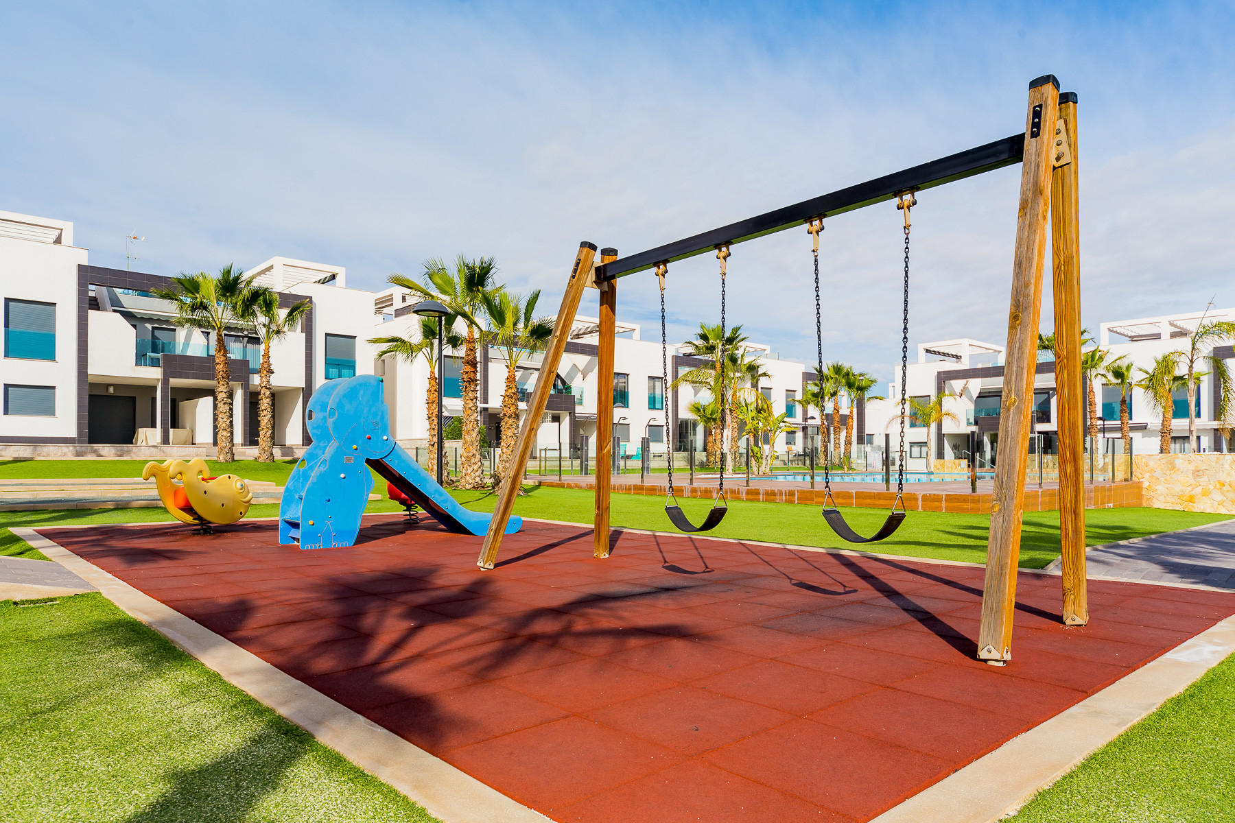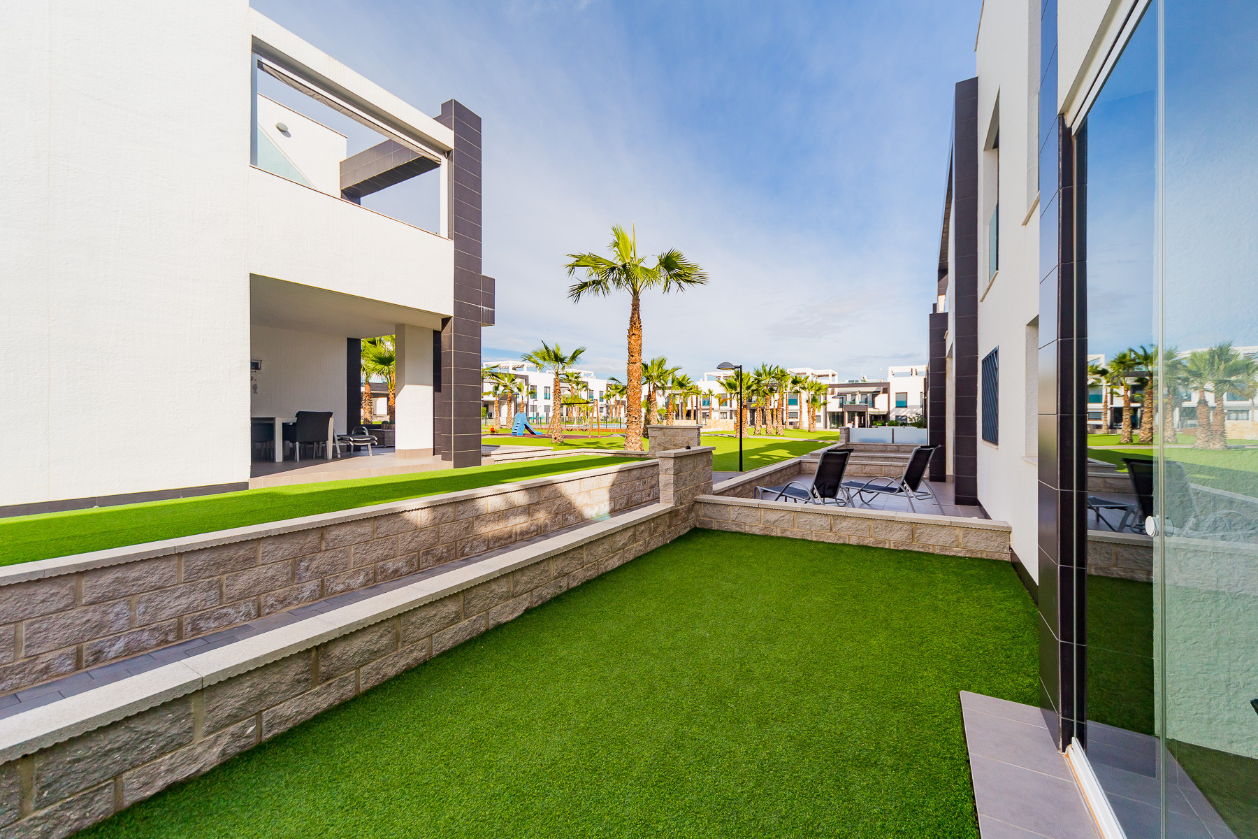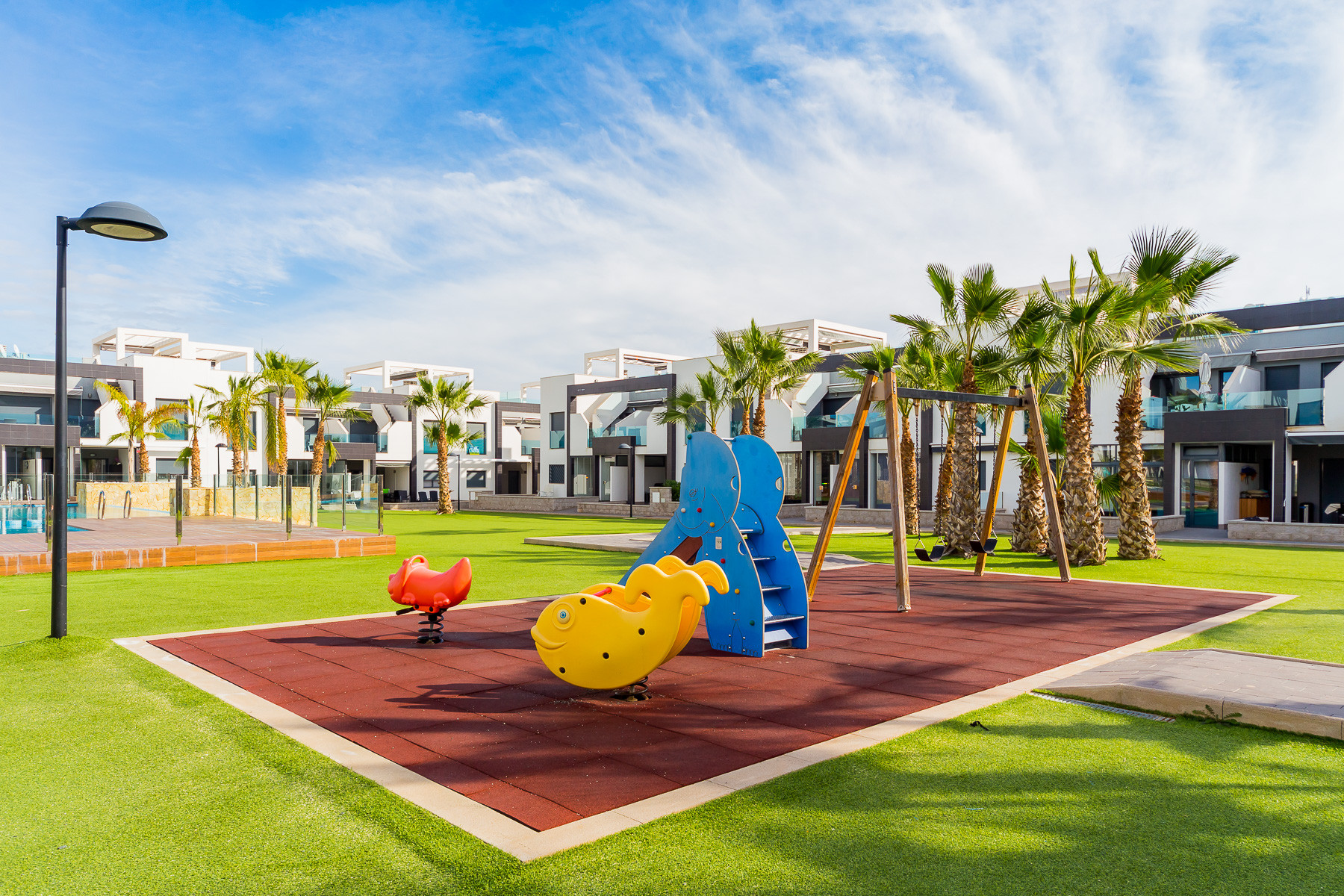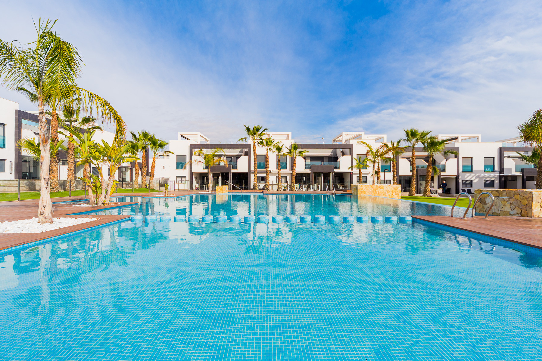 Modern bungalow for rent in a luxury complex "Oasis Beach" with style "High Tech" in La Zenia. It is spread out over 73 m2 and consists of two bedrooms, lounge, kitchen, two bathrooms, utility room and terrace. It is complete with comfortable modern furniture (including a summer garden furniture), household appliances, bedding and towels, kitchen utensils, air conditioning in the living room, barbeque. Russian TV is also available. The complex has a large inner green area with a playground and a communal swimming pool for adults and children. There is a private parking place. It is walking distance of a huge shopping complex of the Zenia Boulevard, where there are over 150 shops, including supermarket, bars, international restaurants, Casino, Cinema, Bowling and much more. It is 1 kilometre the blue flag beach of La Zenia. It can sleep up to six people. No pets are allowed and smoking is only allowed on the terrace.