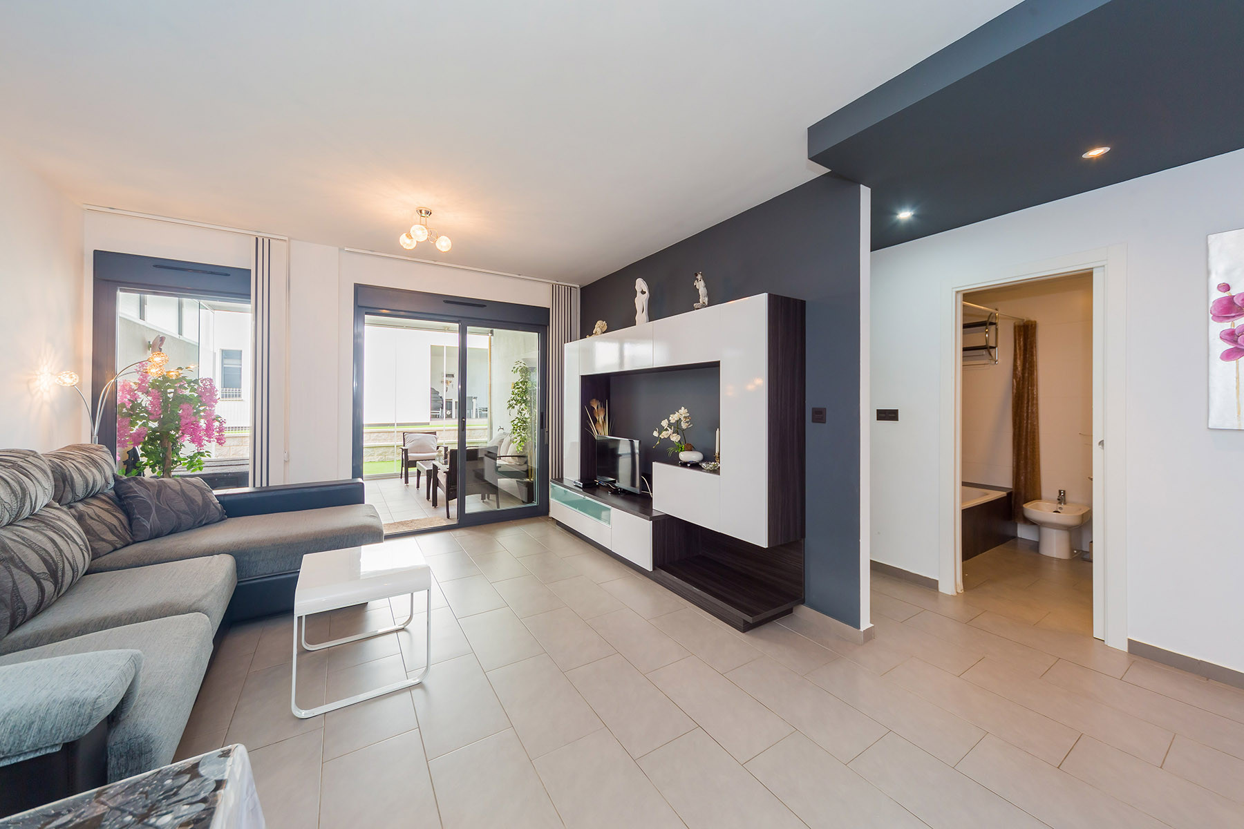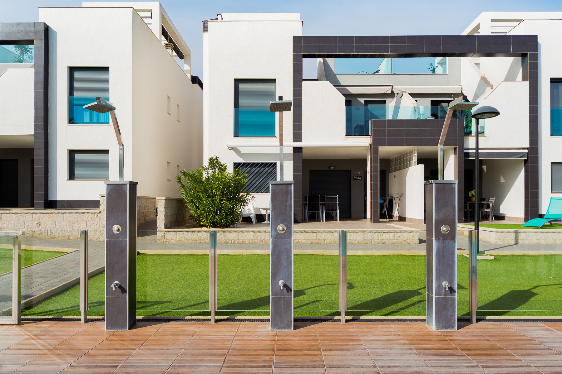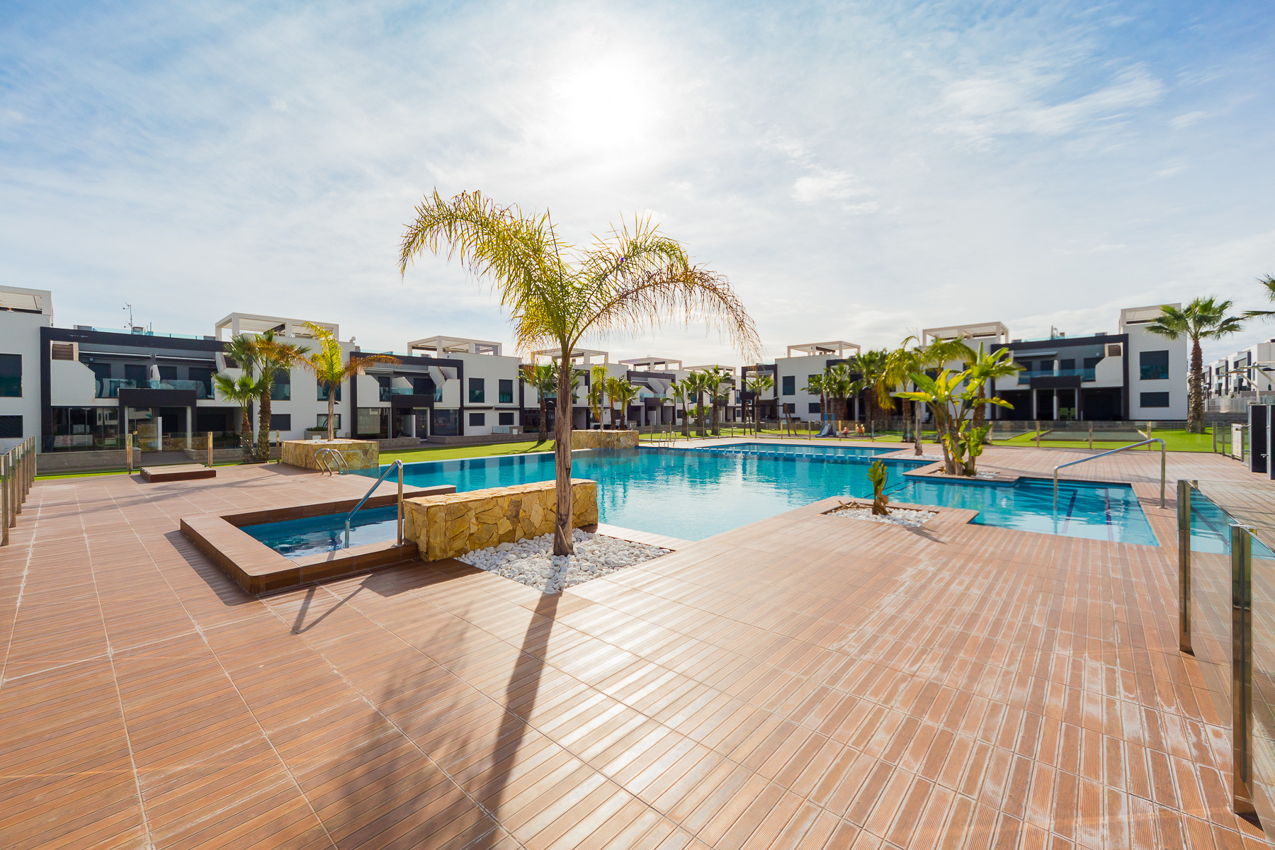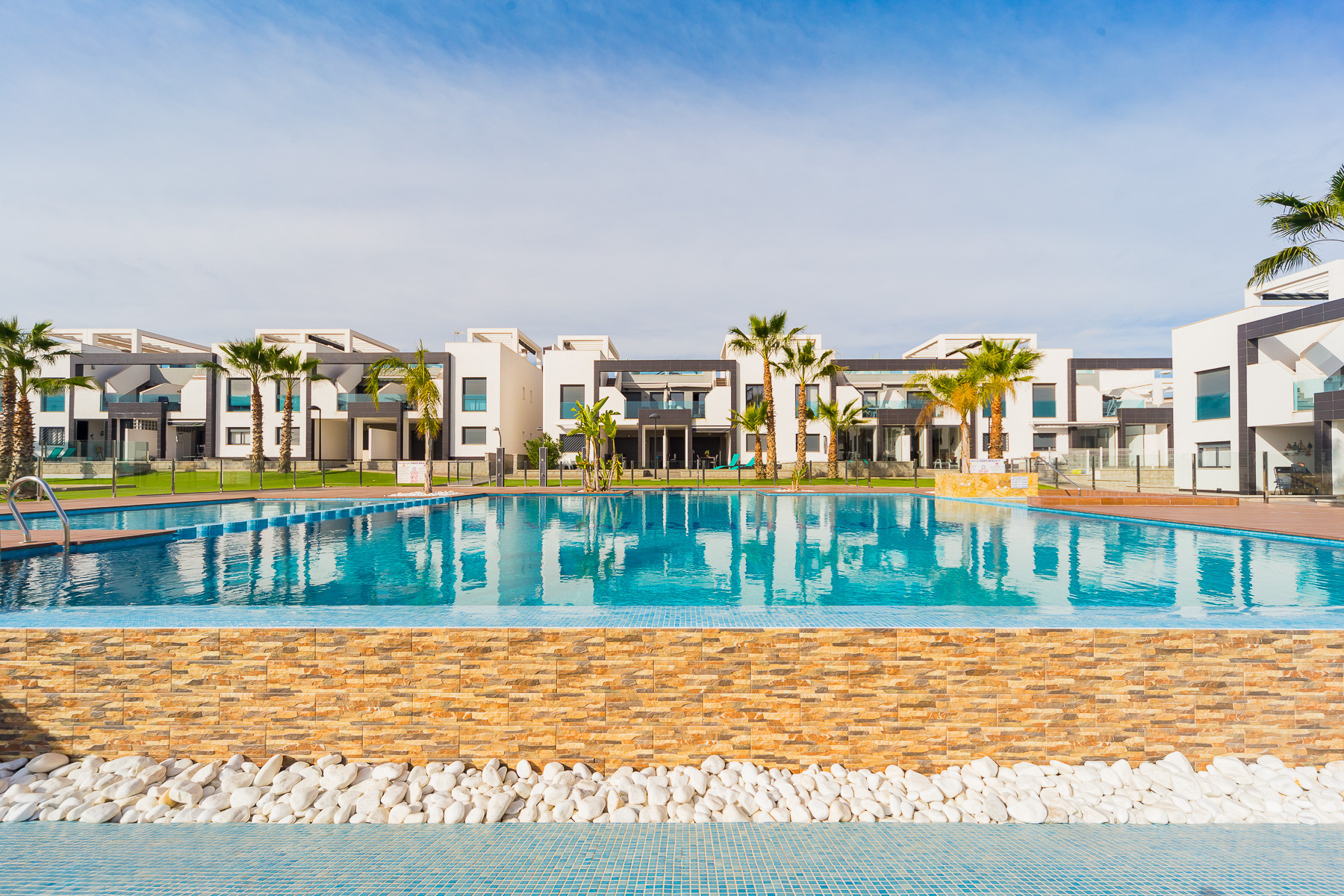 Modern bungalow for rent in a luxury complex "Oasis Beach" with style "High Tech" in La Zenia. It is spread out over 73 m2 and consists of two bedrooms, lounge, kitchen, two bathrooms, utility room and terrace. It is complete with comfortable modern furniture (including a summer garden furniture), household appliances, bedding and towels, kitchen utensils, air conditioning in the living room, barbeque. Russian TV is also available. The complex has a large inner green area with a playground and a communal swimming pool for adults and children. There is a private parking place. It is walking distance of a huge shopping complex of the Zenia Boulevard, where there are over 150 shops, including supermarket, bars, international restaurants, Casino, Cinema, Bowling and much more. It is 1 kilometre the blue flag beach of La Zenia. It can sleep up to six people. No pets are allowed and smoking is only allowed on the terrace.