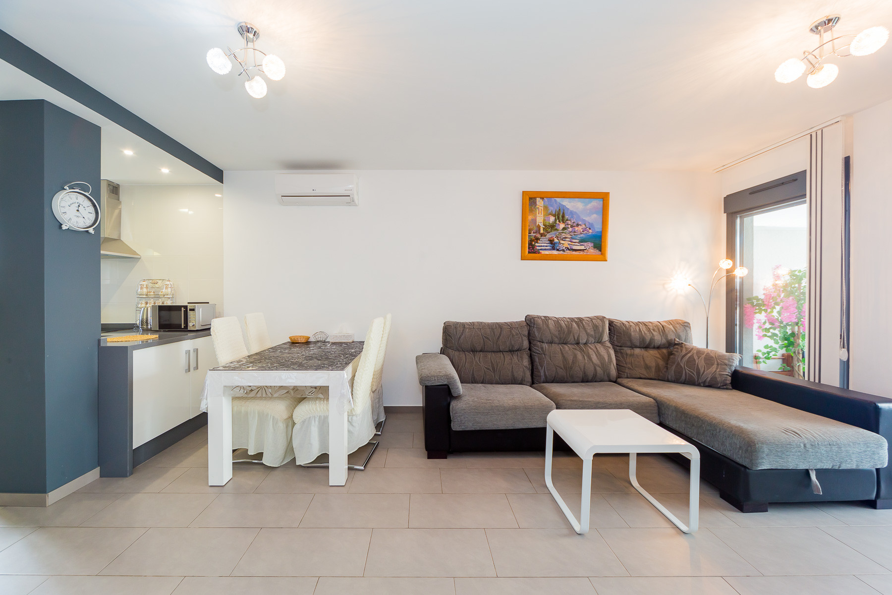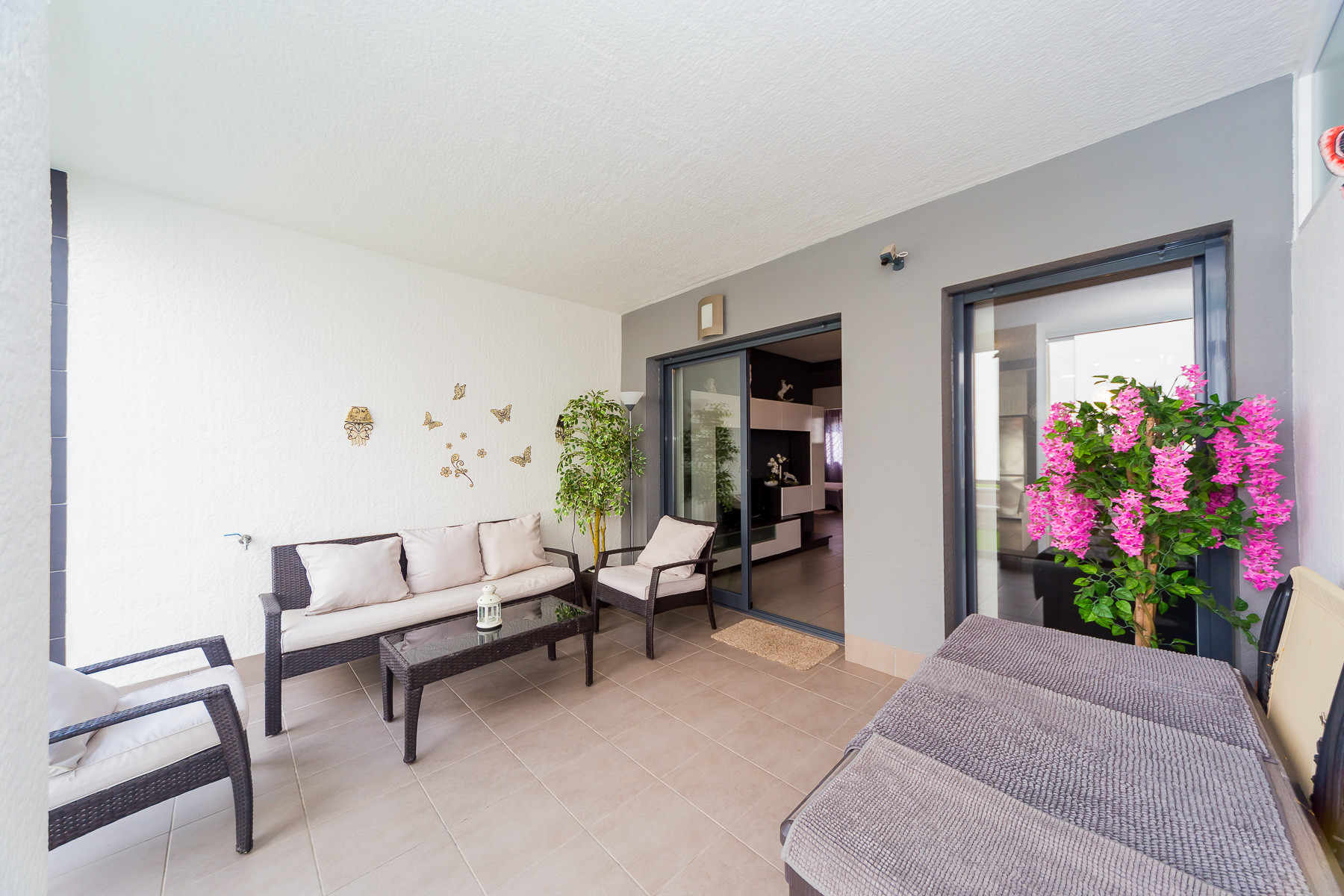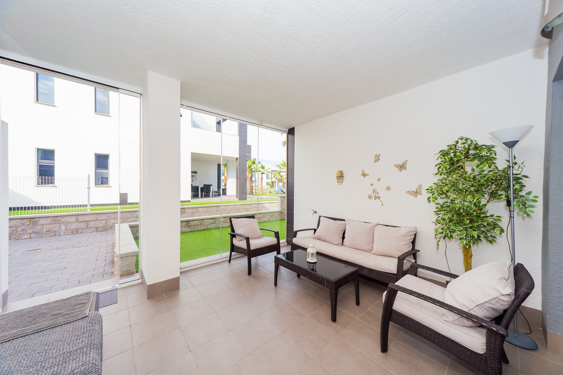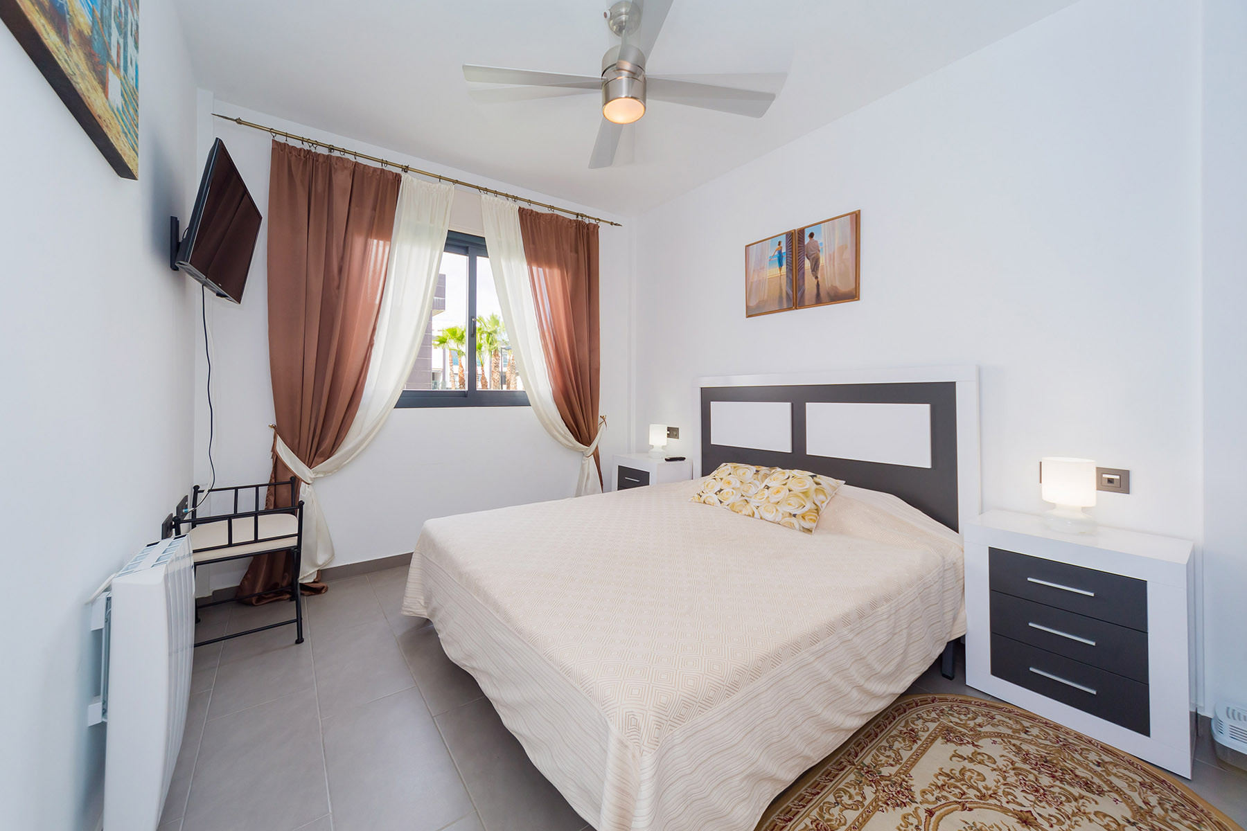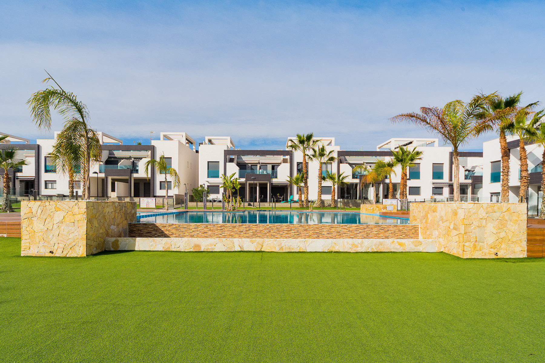 Modern bungalow for rent in a luxury complex "Oasis Beach" with style "High Tech" in La Zenia. It is spread out over 73 m2 and consists of two bedrooms, lounge, kitchen, two bathrooms, utility room and terrace. It is complete with comfortable modern furniture (including a summer garden furniture), household appliances, bedding and towels, kitchen utensils, air conditioning in the living room, barbeque. Russian TV is also available. The complex has a large inner green area with a playground and a communal swimming pool for adults and children. There is a private parking place. It is walking distance of a huge shopping complex of the Zenia Boulevard, where there are over 150 shops, including supermarket, bars, international restaurants, Casino, Cinema, Bowling and much more. It is 1 kilometre the blue flag beach of La Zenia. It can sleep up to six people. No pets are allowed and smoking is only allowed on the terrace.