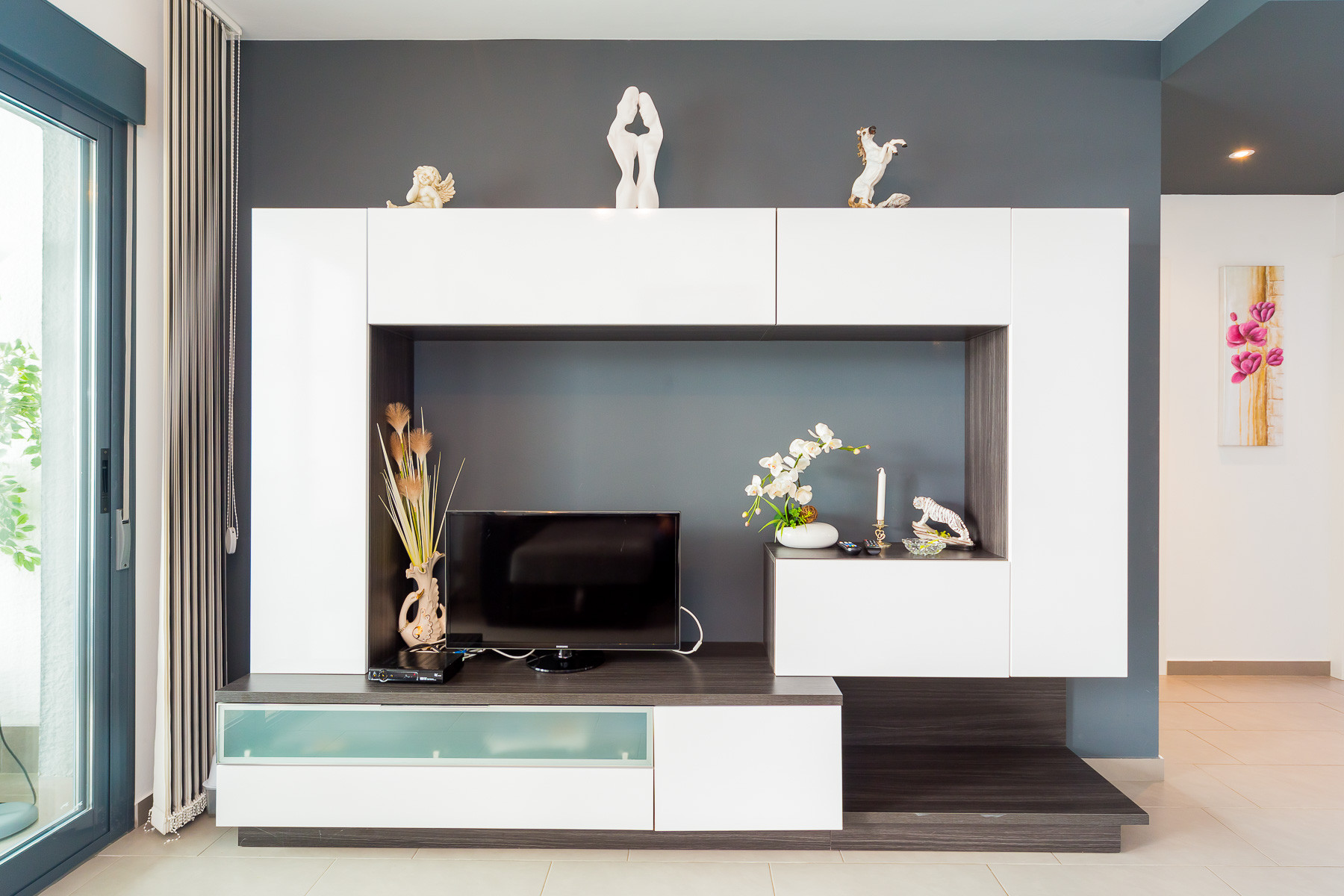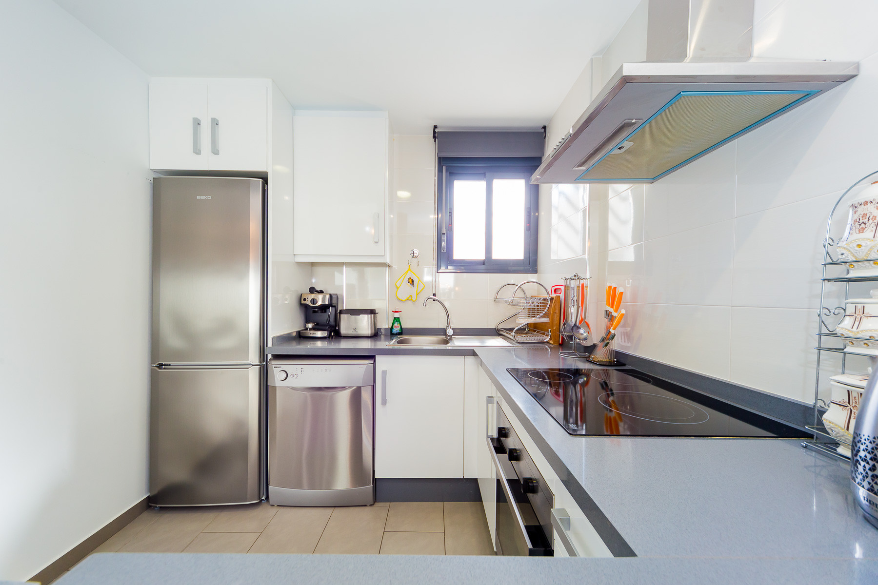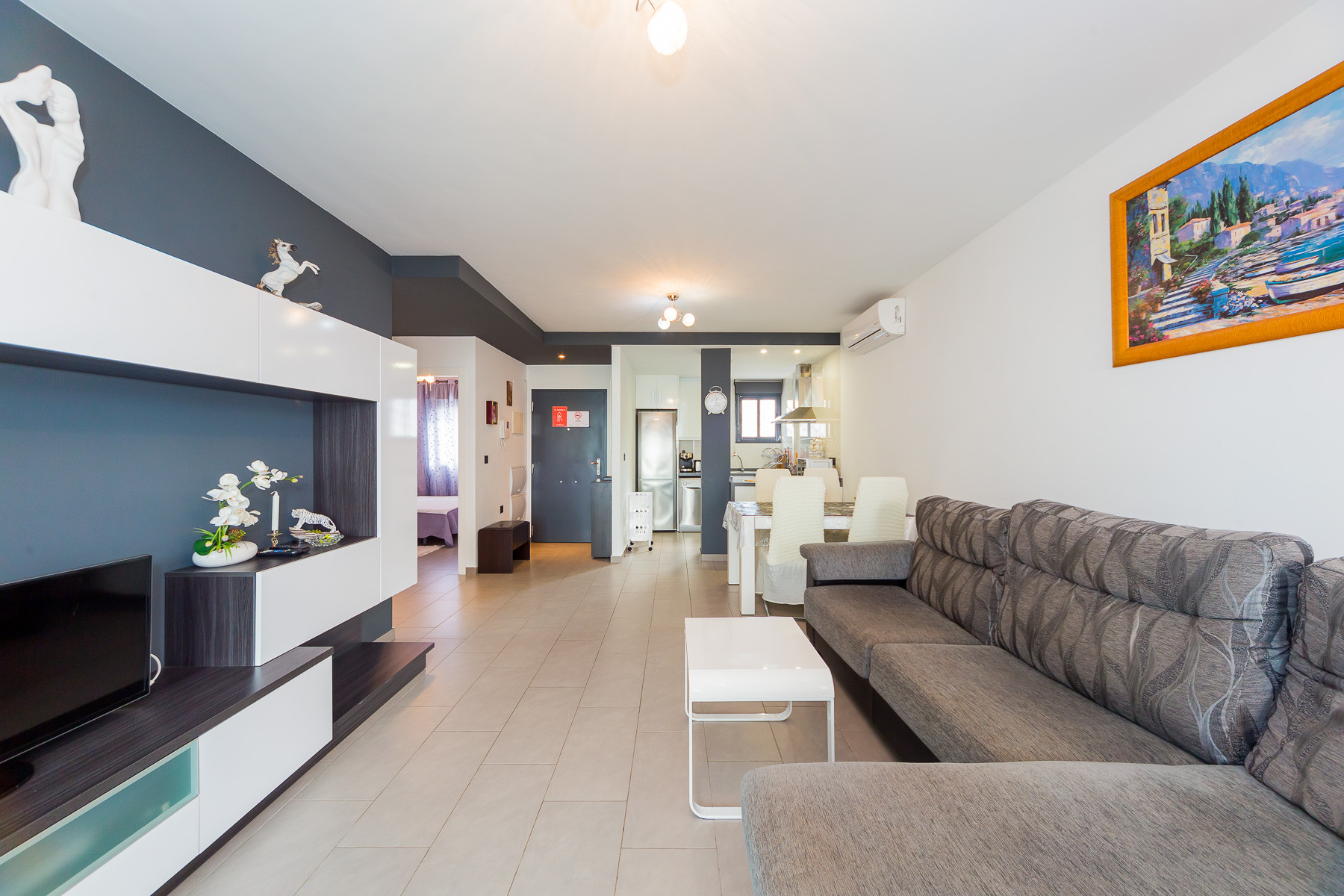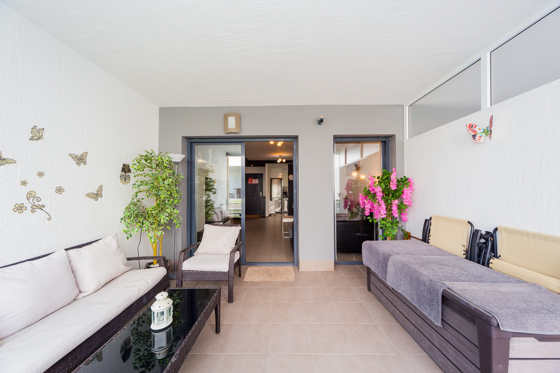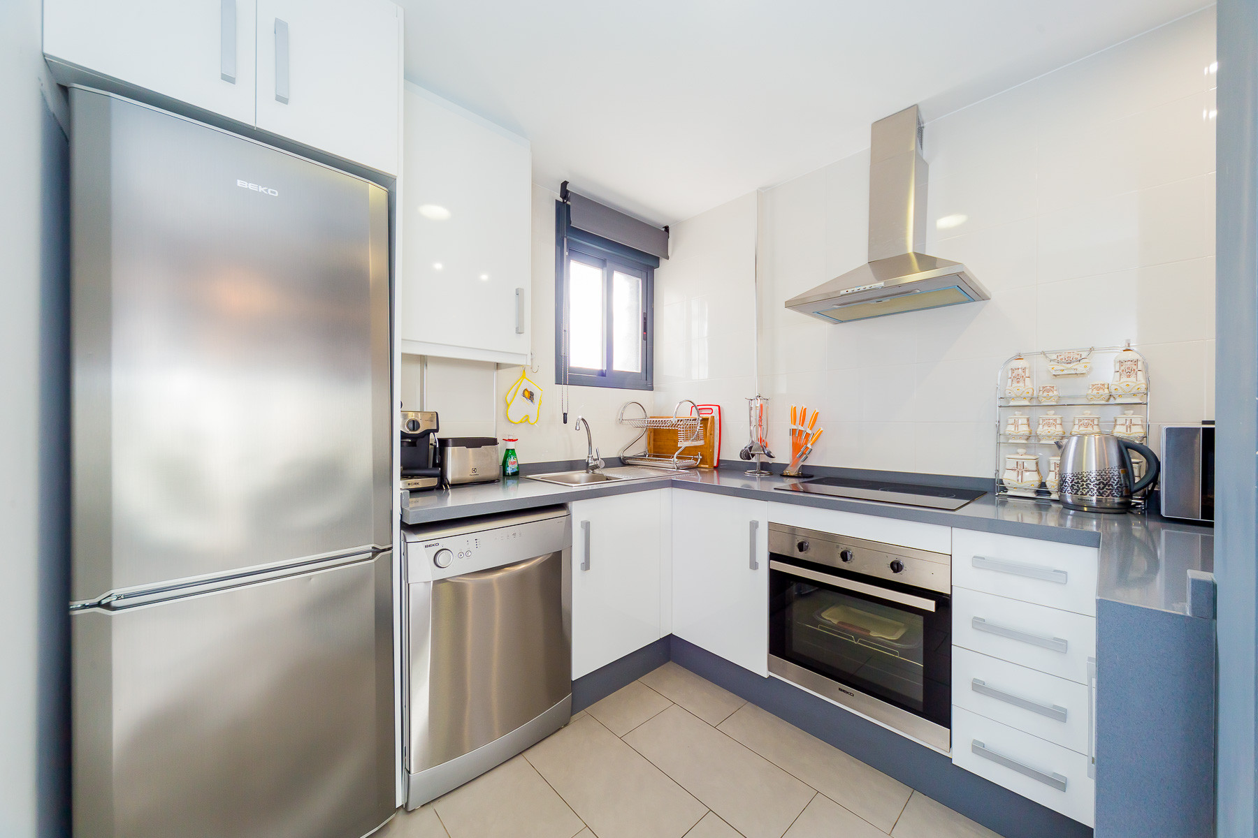 Modern bungalow for rent in a luxury complex "Oasis Beach" with style "High Tech" in La Zenia. It is spread out over 73 m2 and consists of two bedrooms, lounge, kitchen, two bathrooms, utility room and terrace. It is complete with comfortable modern furniture (including a summer garden furniture), household appliances, bedding and towels, kitchen utensils, air conditioning in the living room, barbeque. Russian TV is also available. The complex has a large inner green area with a playground and a communal swimming pool for adults and children. There is a private parking place. It is walking distance of a huge shopping complex of the Zenia Boulevard, where there are over 150 shops, including supermarket, bars, international restaurants, Casino, Cinema, Bowling and much more. It is 1 kilometre the blue flag beach of La Zenia. It can sleep up to six people. No pets are allowed and smoking is only allowed on the terrace.