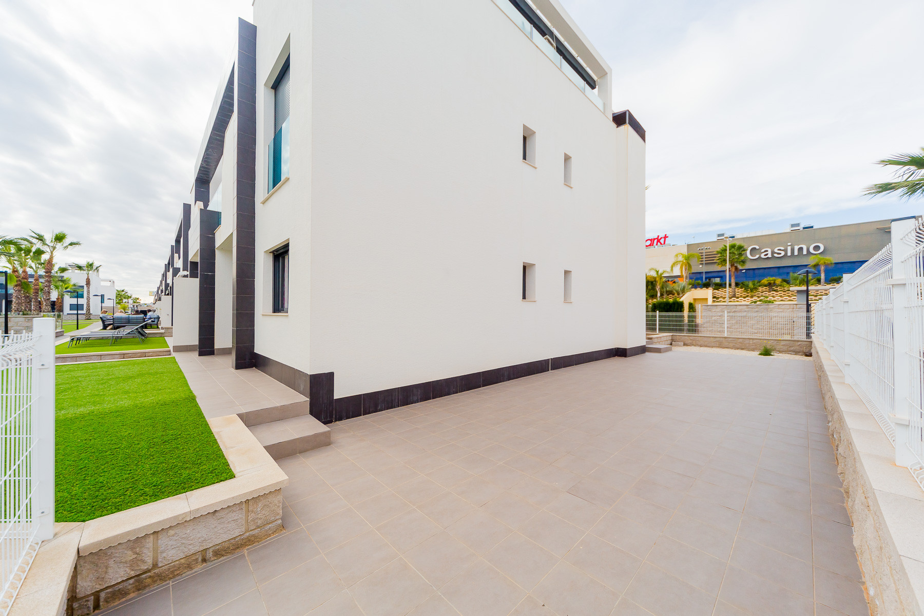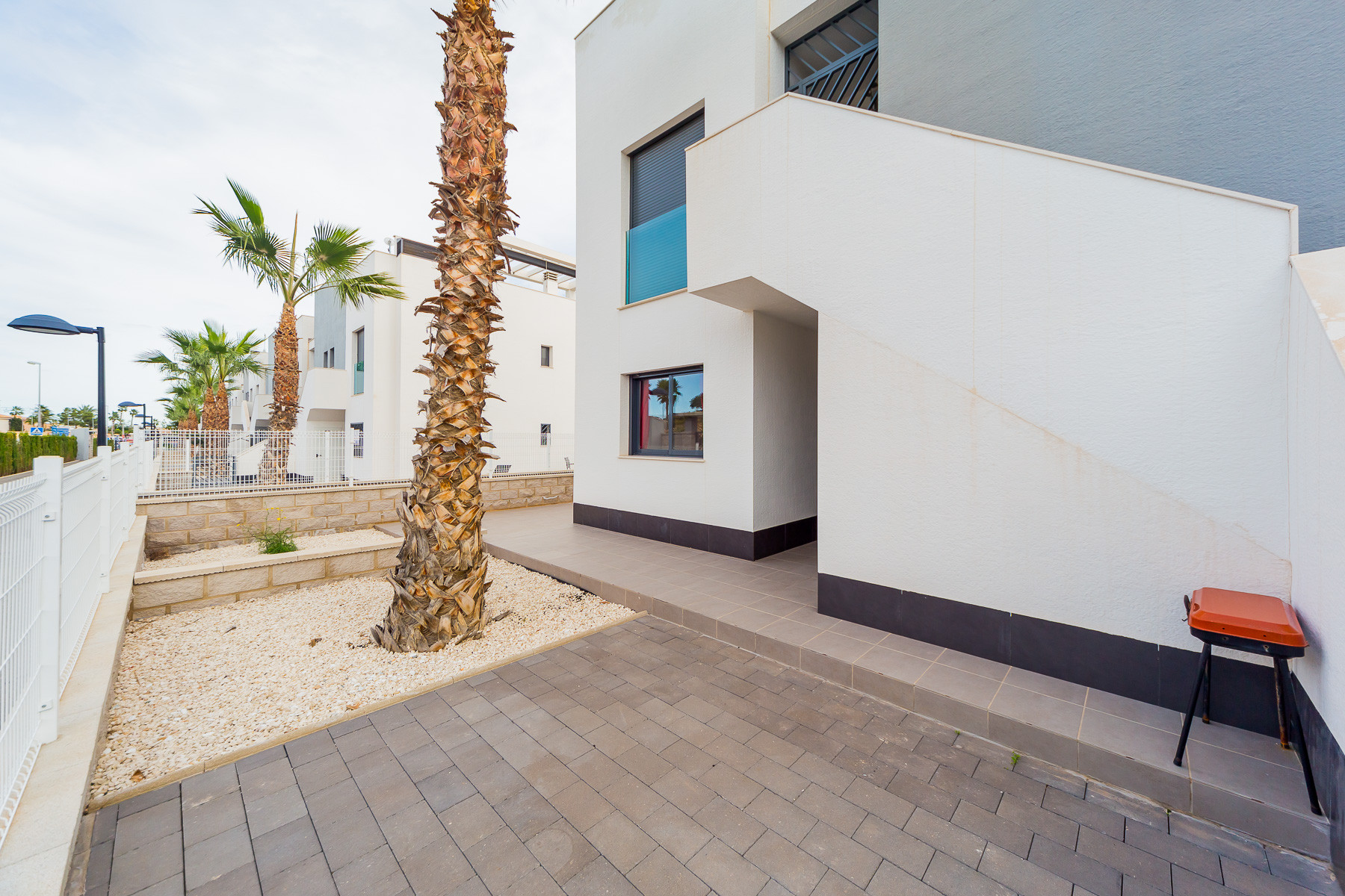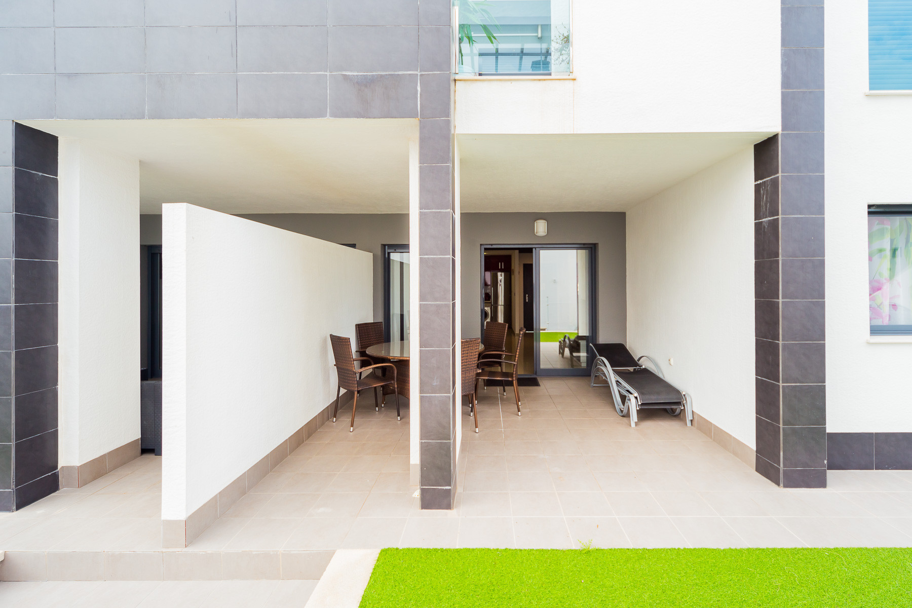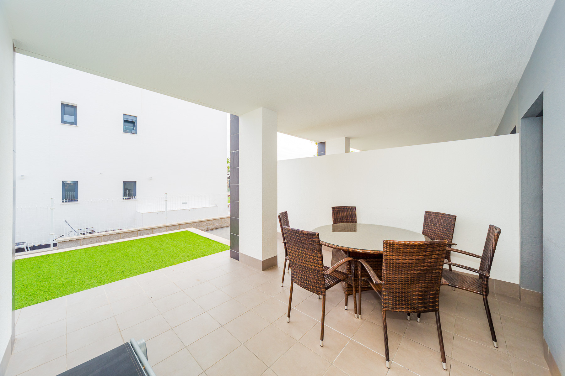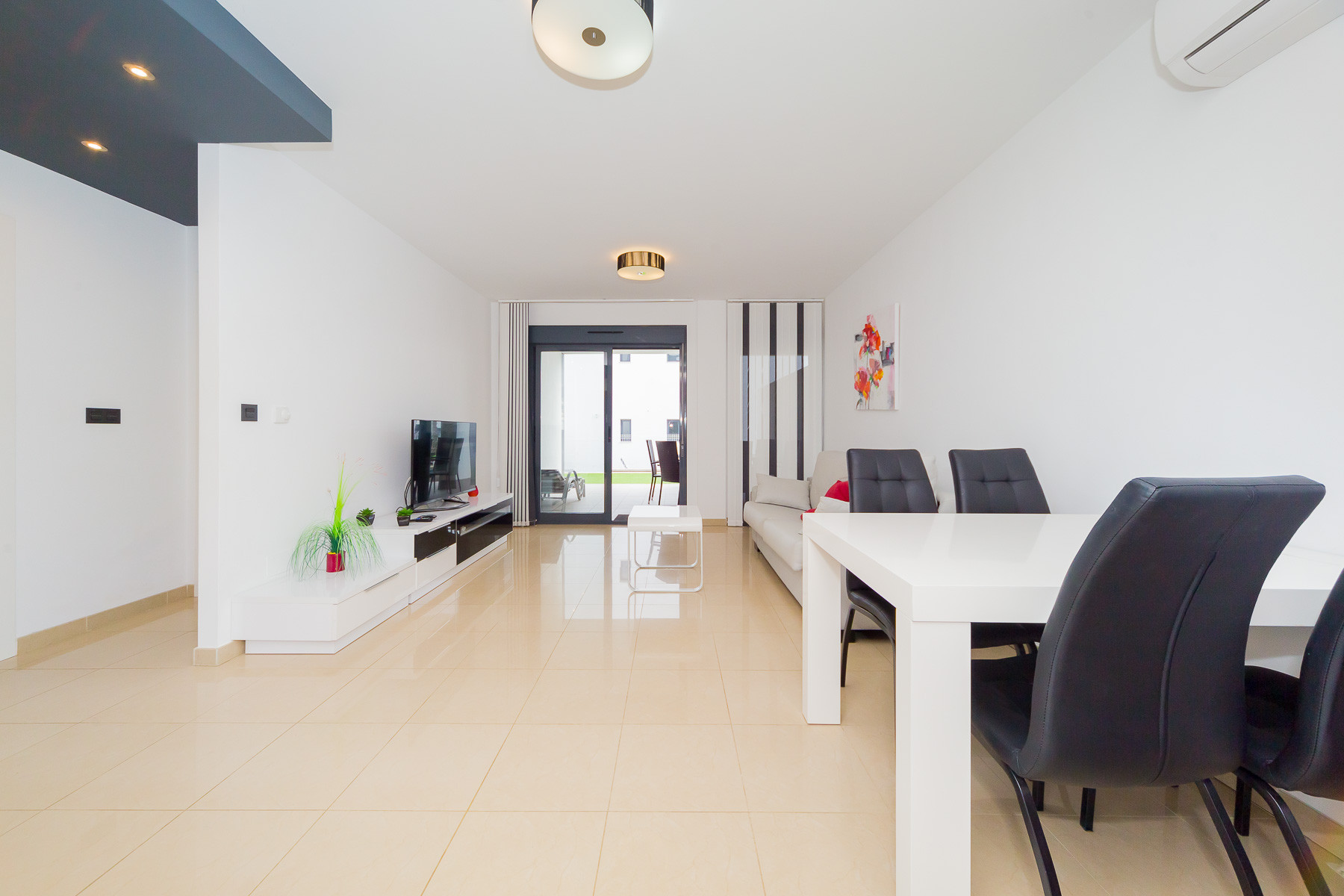 A modern bungalow located in a gated complex with communal swimming pool. It is spread out over 73 m2 and consists of a salon, two bedrooms, kitchen, two bathrooms and a terrace. There is a large private courtyard and a private garage parking space. It is fully equipped with new furniture, appliances, linens and towels, kitchen utensils, air conditioning, heated floors (which is important for the off-season).The air conditioning is only in the living room, but it's enough for all the apartments. Russian and Spanish TV are available. The terrace has outdoor furniture. It sleeps up to six people. Pets are not allowed and smoking is only permitted on the terrace. It is located adjacent to the new Zenia Boulevard open air shopping complex with a variety of over 150 shops bars, eateries, casino and much more. The sea is about 1 km away.