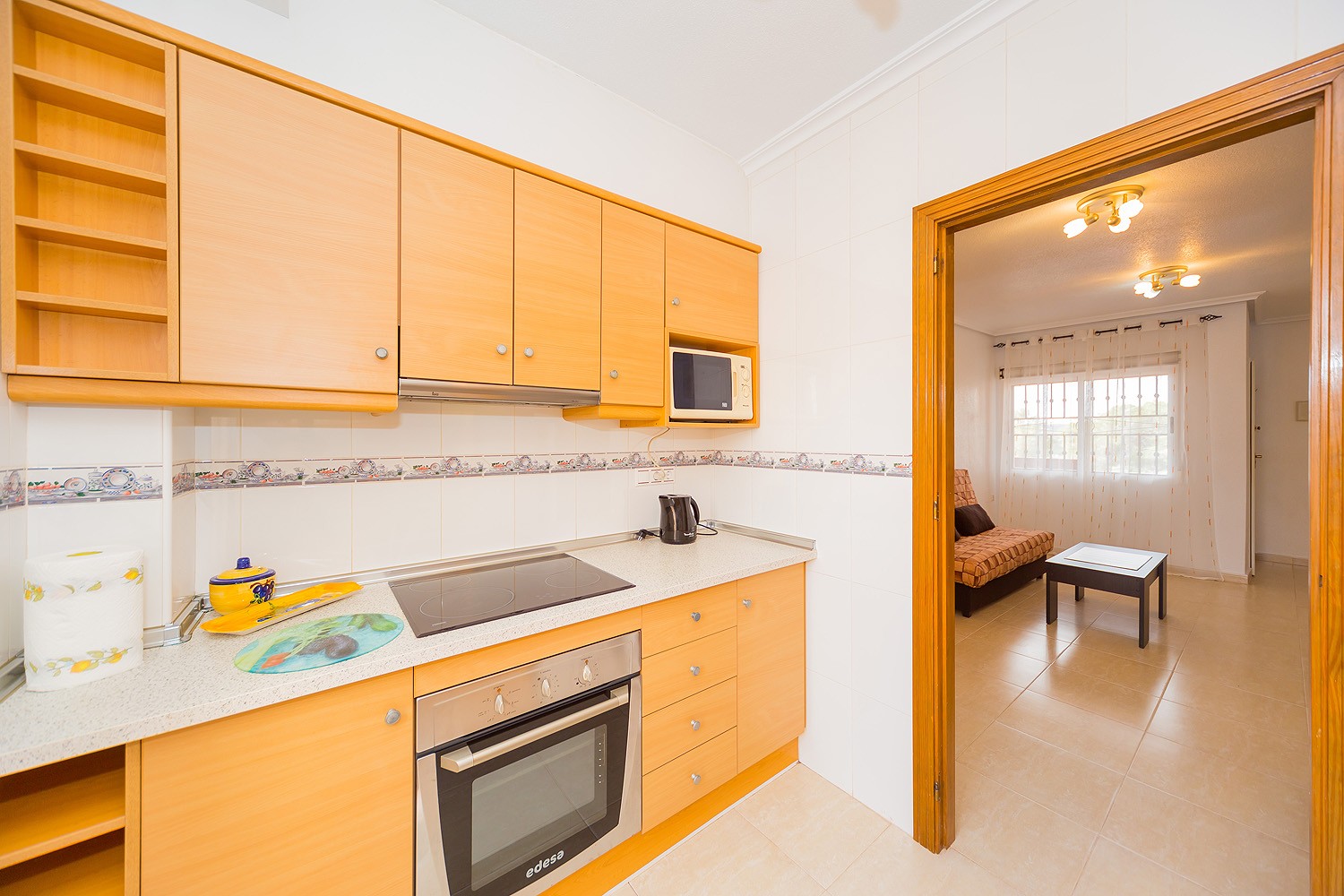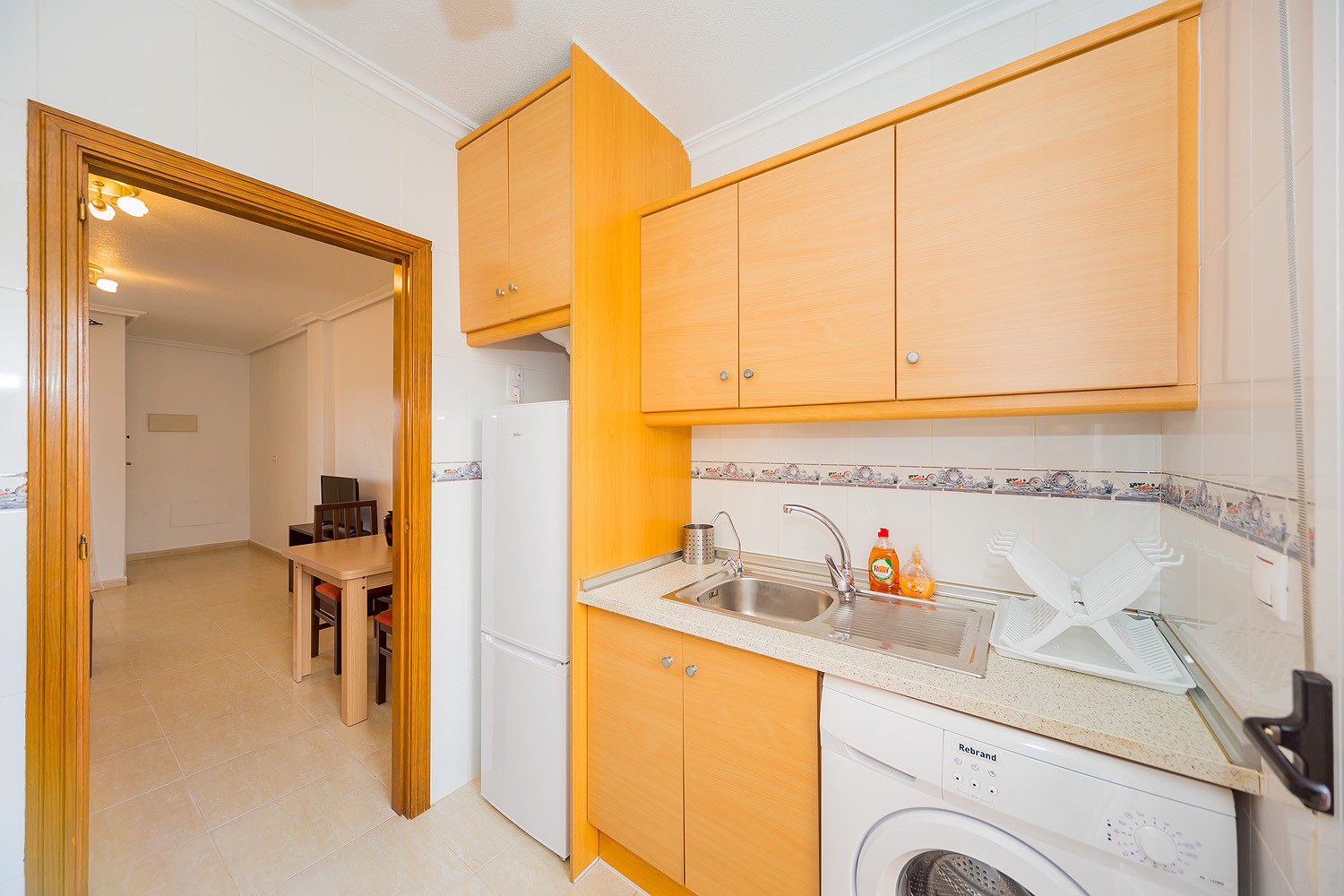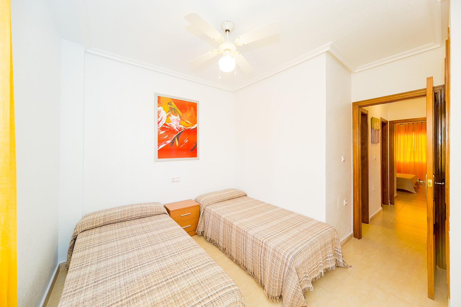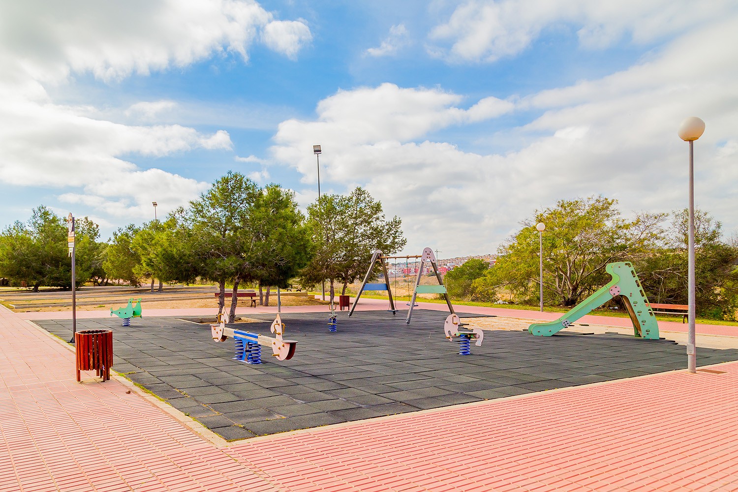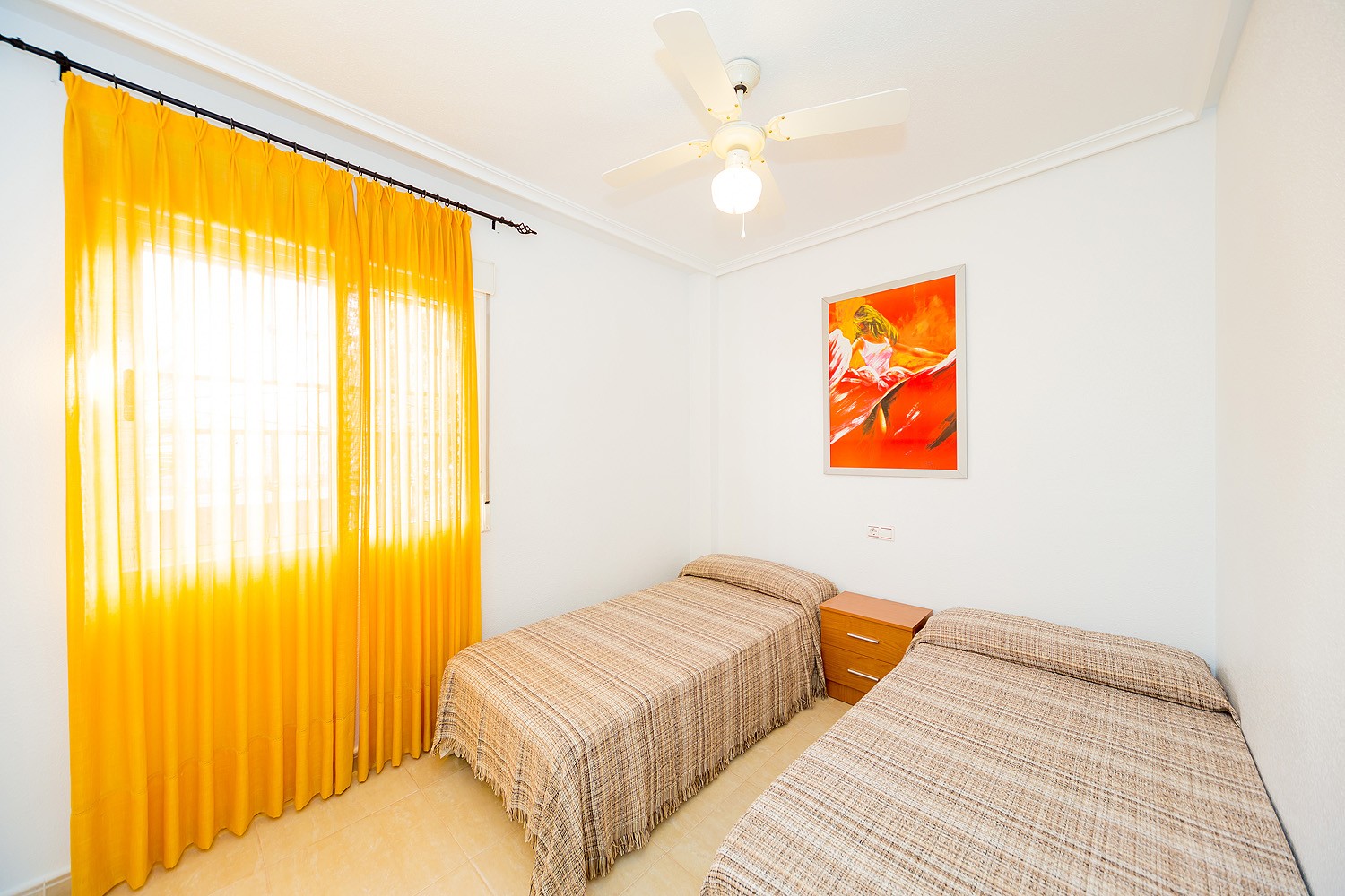 This bungalow is located in the urbanization of "Dream Hills", in the popular Los Altos, Orihuela Costa. It is set out over 75 m2 and consists of two bedrooms, living room, two bathrooms (one with bath, the second with shower), independent kitchen, from which you have access to a large patio. In front of the bungalow there is a large garden area. It is equipped with furniture, appliances, dishes, bed linen and towels. Spanish Television is also available. Both bedrooms have air conditioning, in the salon there is a ceiling fan. Both bedrooms have fitted wardrobes. There is a communal swimming pool and green area. Nearby there is also a children’s playground. It can sleep up to 6 people. No pets are allowed and smoking is only allowed outside the house. The area is very popular and the new ALDI supermarket is about 750 meters away. The blue flag beach of Playa Flamenca, La Zenia and Campoamor are all a short drive away. There are many bars and restaurants in walking distance and the Zenia Boulevard shopping complex with its array of shops bars and much more is a 5 min drive away.