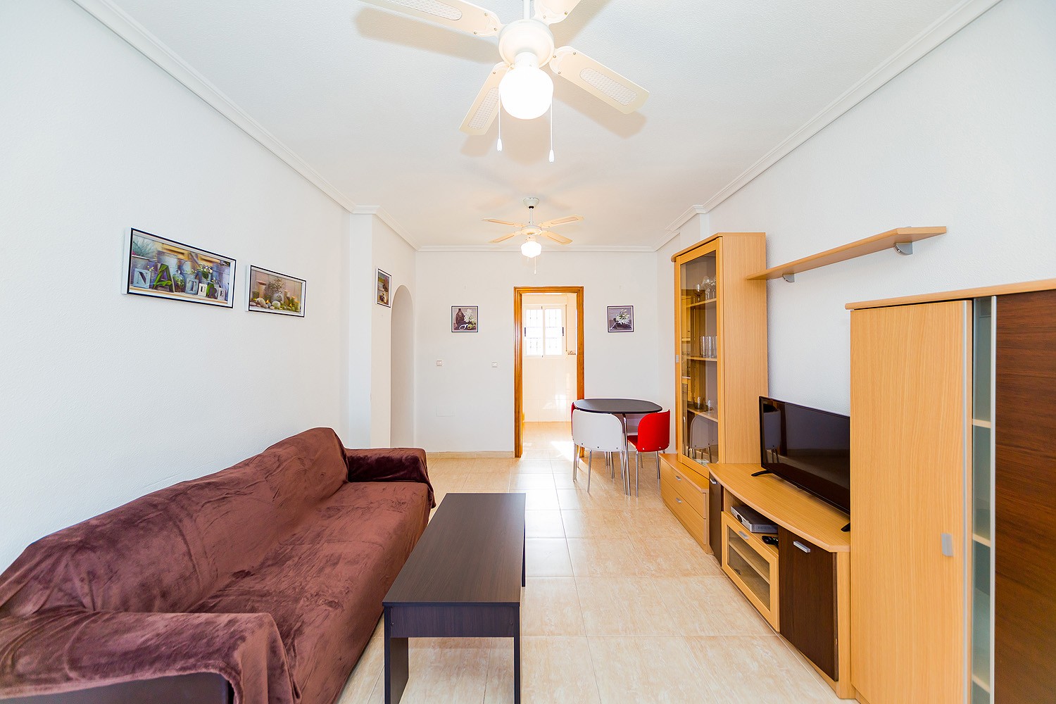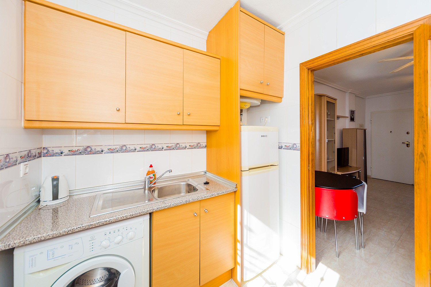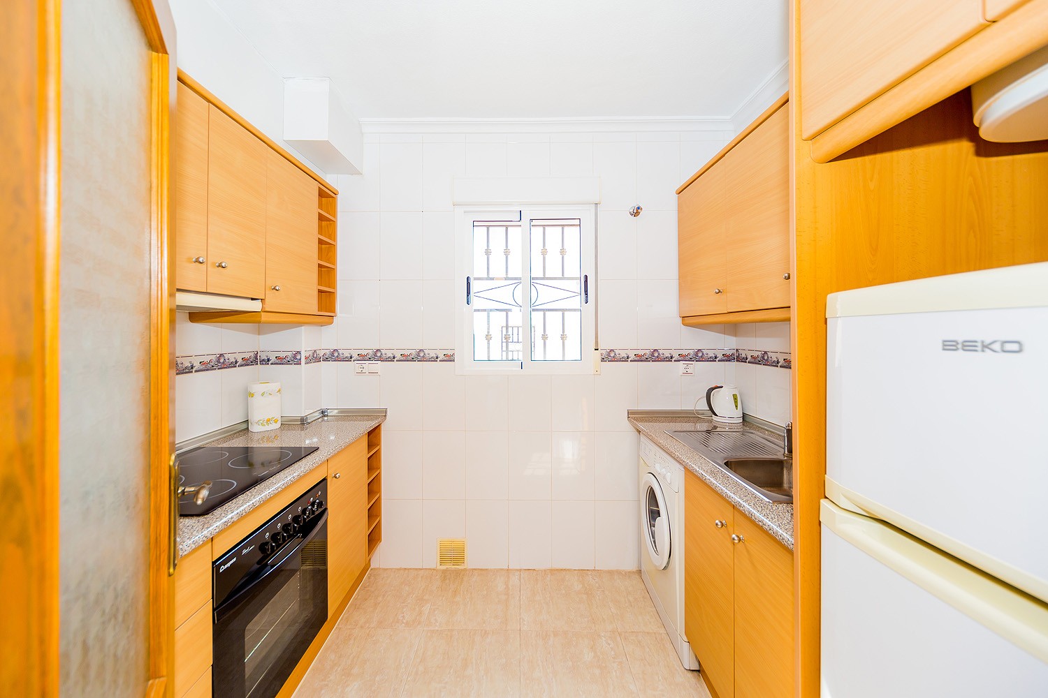This bungalow is located in the urbanization "Dream Hills” in the Los Altos on the Orihuela Costa. It sleeps up to 6 people and is set out over 75 m2. It consists of two bedrooms, living room, two bathrooms (one with bath and the other with a shower), There is an independent kitchen and terrace. There is also access to the private roof solarium, which. It is equipped with furniture, appliances, dishes, bed linen and towels. Spanish Television is also available. There is air conditioning and ceiling fans. Both bedrooms have fitted wardrobes. The urbanization has a communal swimming pool and a lovely green area. No pets allowed and smoking is only allowed outside the house. The area is very popular and the new ALDI supermarket is about 750 meters away. The blue flag beach of Playa Flamenca, La Zenia and Campoamor are all a short drive away. There are many bars and restaurants in walking distance and the Zenia Boulevard shopping complex with its array of shops bars and much more is a 5 min drive away.