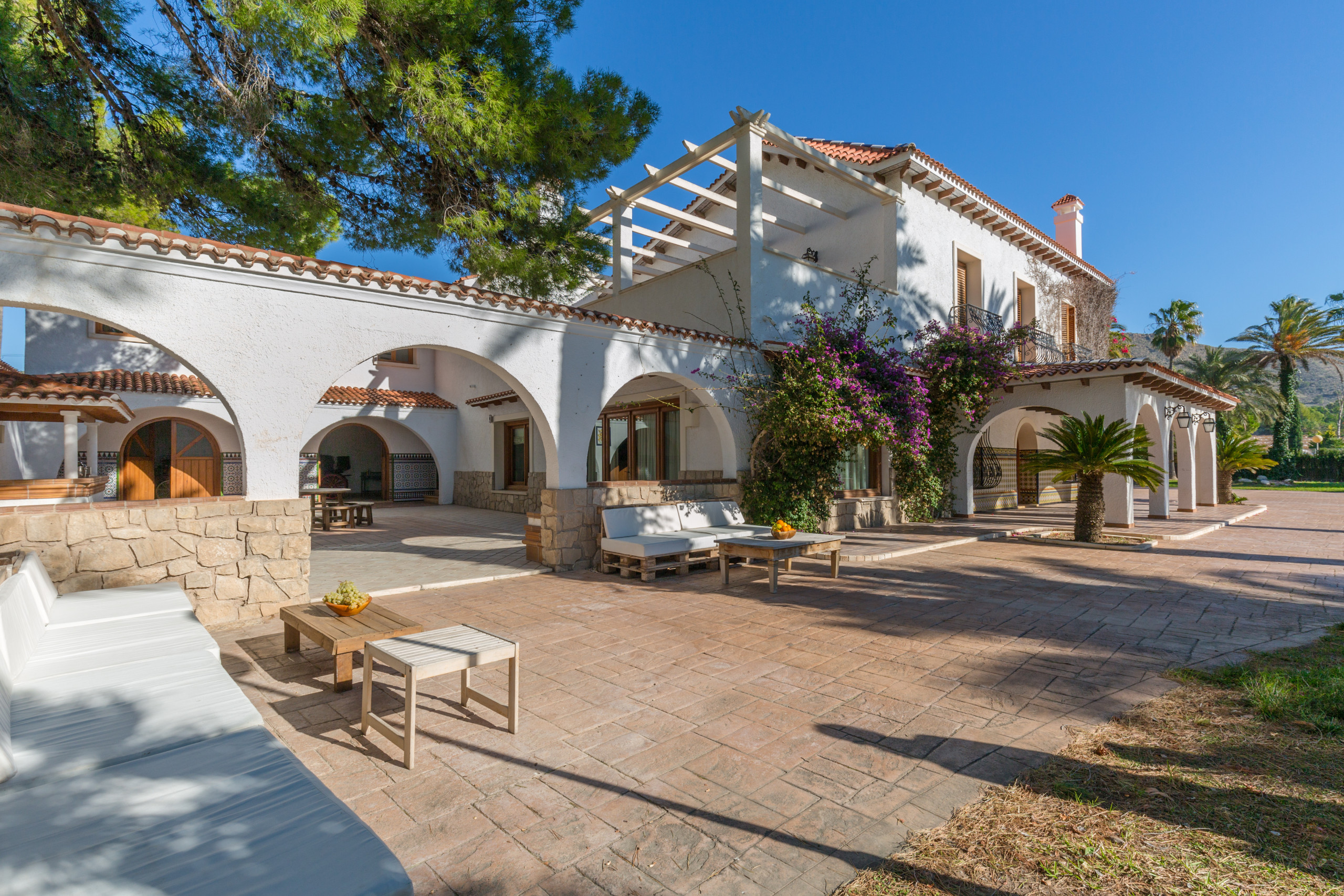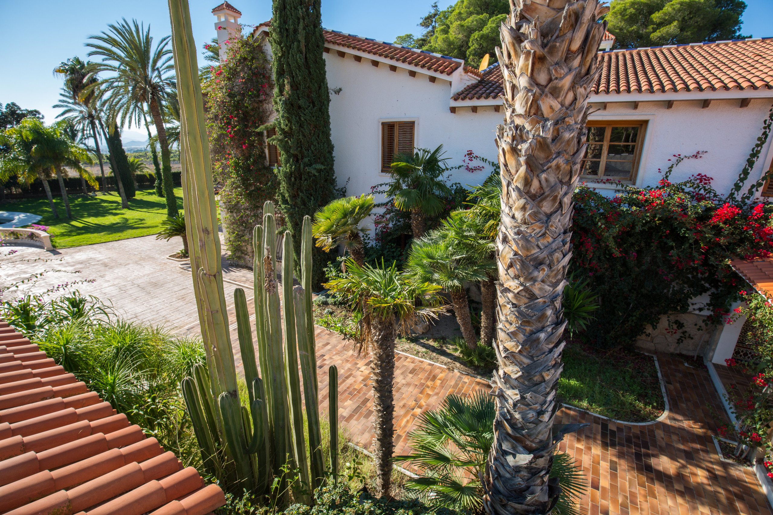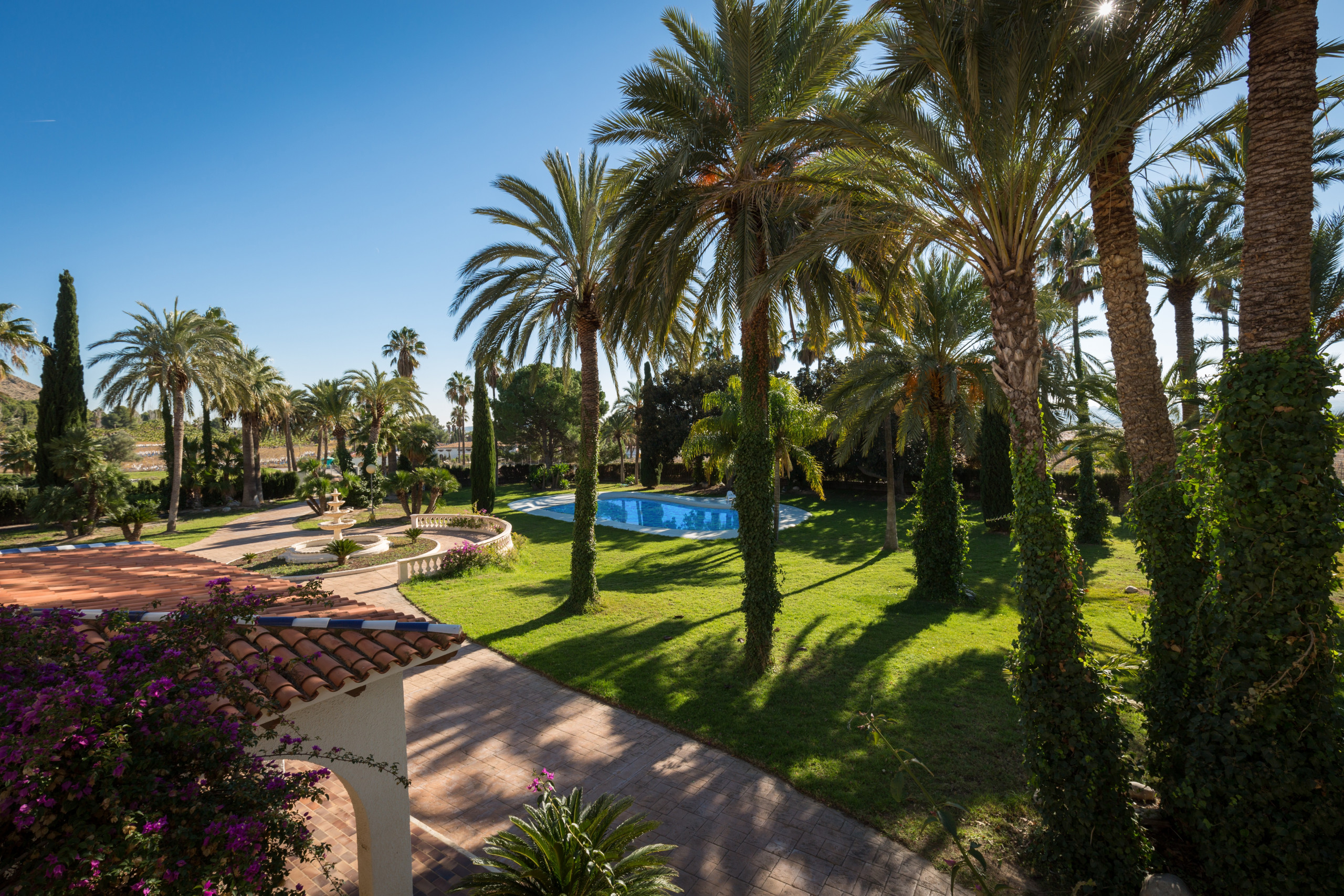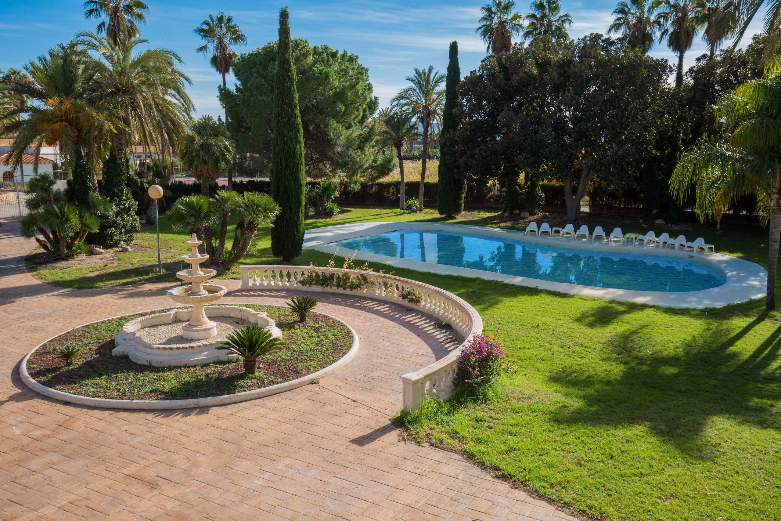 Large and strong palm trees of all kinds, fruit trees , bonsais, flower tendrils, cacti, well-kept pines and flower dreams in all colors allow you to forget the outside world. In its luxurious paradise garden, it has its own stable for horse lovers, a pool in the romantic pine forest with picnic area and bathrooms . A private picnic area , service dwelling, well, and a 25-meter pool complete the original experience under the coniferous trees. Everything is well equipped with hiking trails. And the fantastic experience goes even further. Palm trees, a 2 reservoirs and fountains, a pond, that frames the property with magnificent specimens that make this garden an experience.