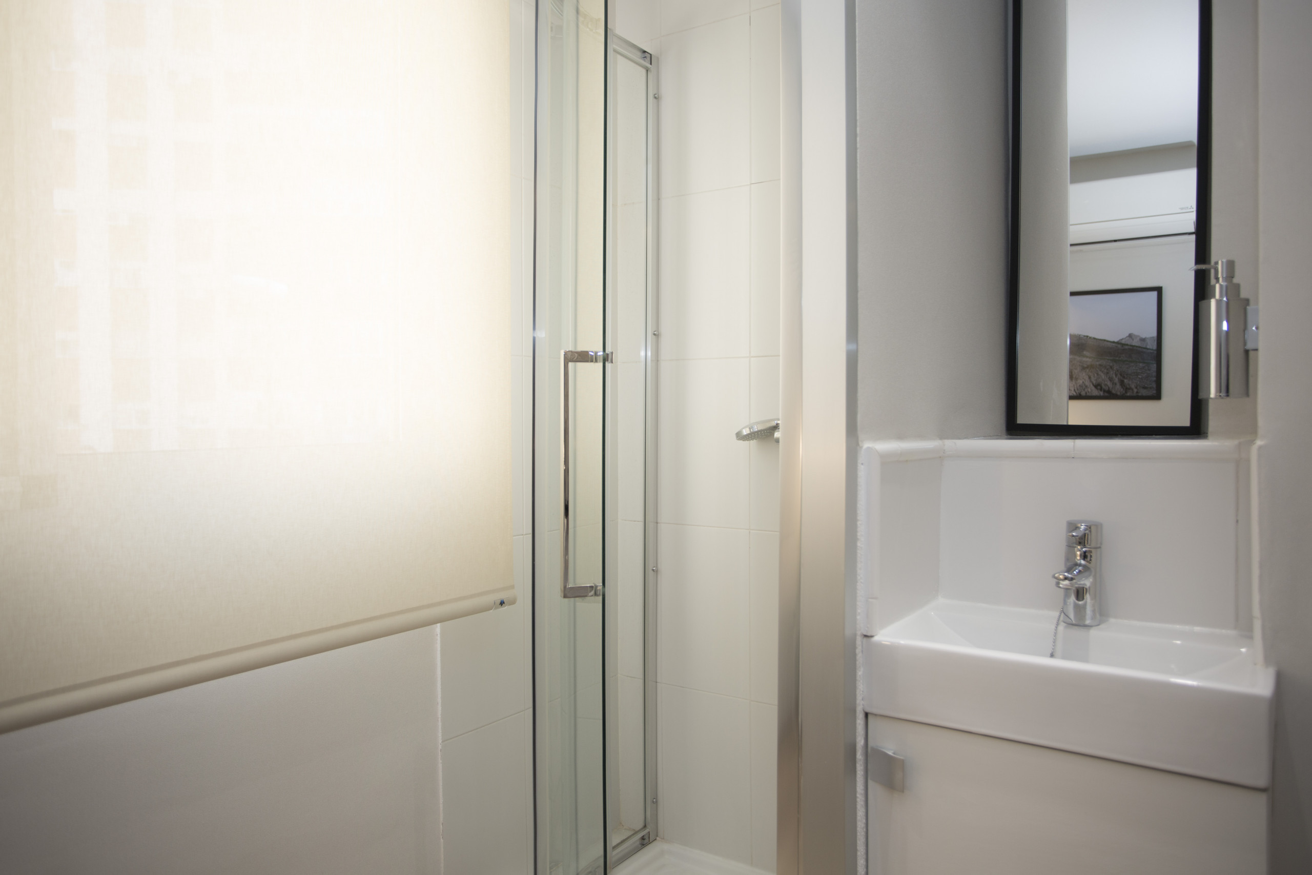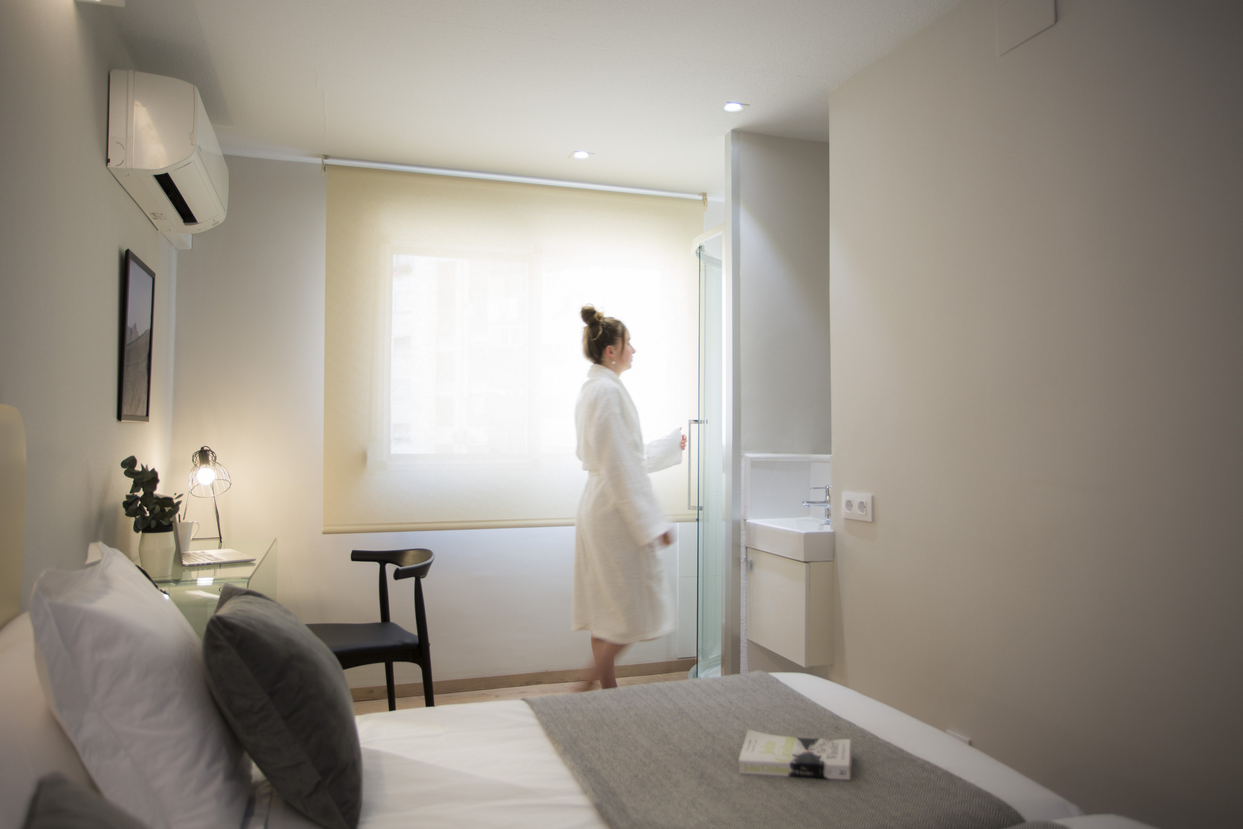 The bedroom has wifi connection, tv, bed sheets and towels, sink and shower inside the bedroom.