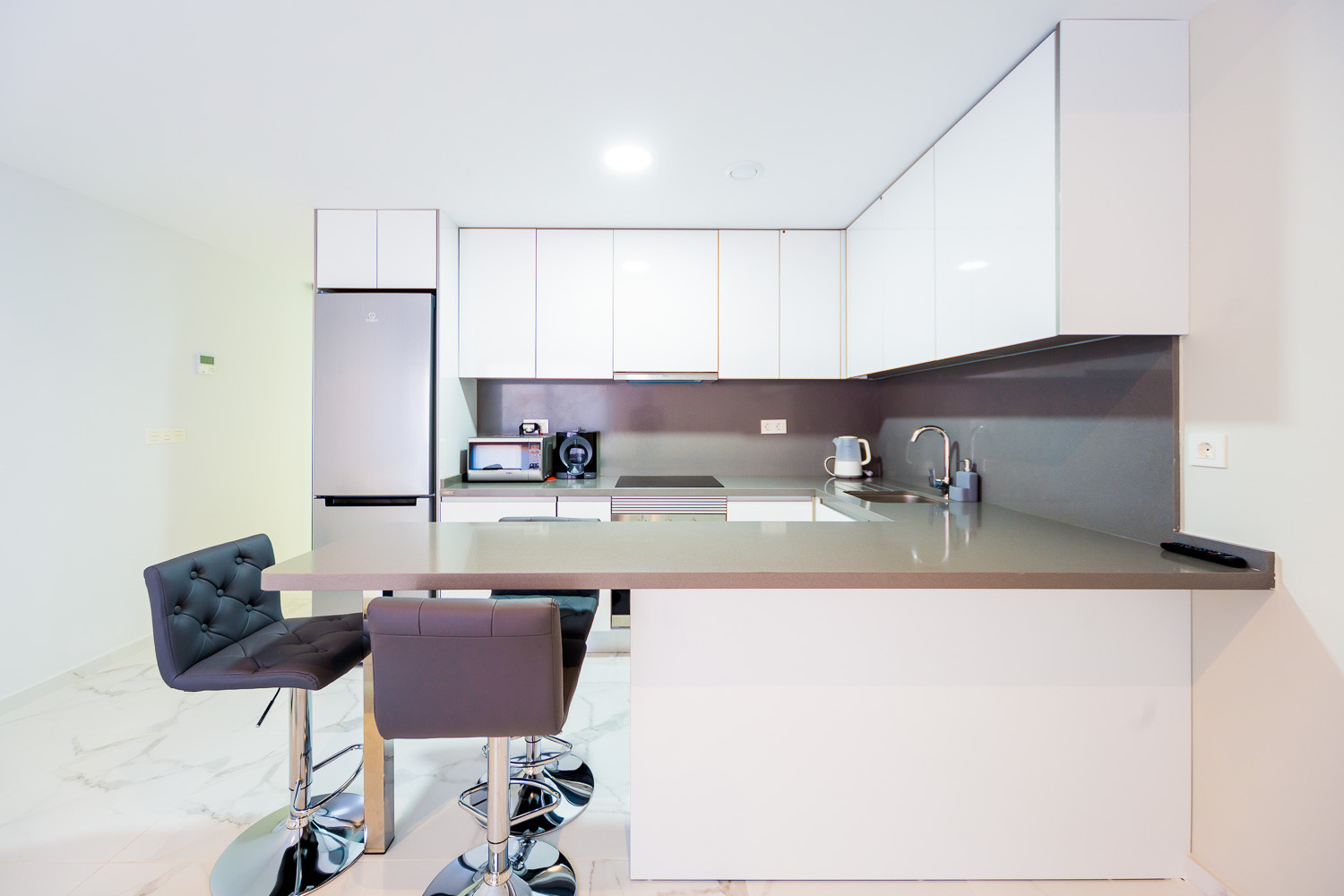 A cozy and spacious studio in the new modern complex "Residencial Alegria IV" on the second line of the sea, a few meters from the popular beach of the city of Los Locos. A 50 m2 studio benefits from furniture, appliances, including a coffee maker and dishwasher, dishes, linens and towels. There is a piped, hot and cold Conditioning. It has Spanish television and internet. The studio is divided into two areas, a bedroom and a living room with kitchenette, full bathroom with shower. The complex offers a communal pool and a Finish sauna.
