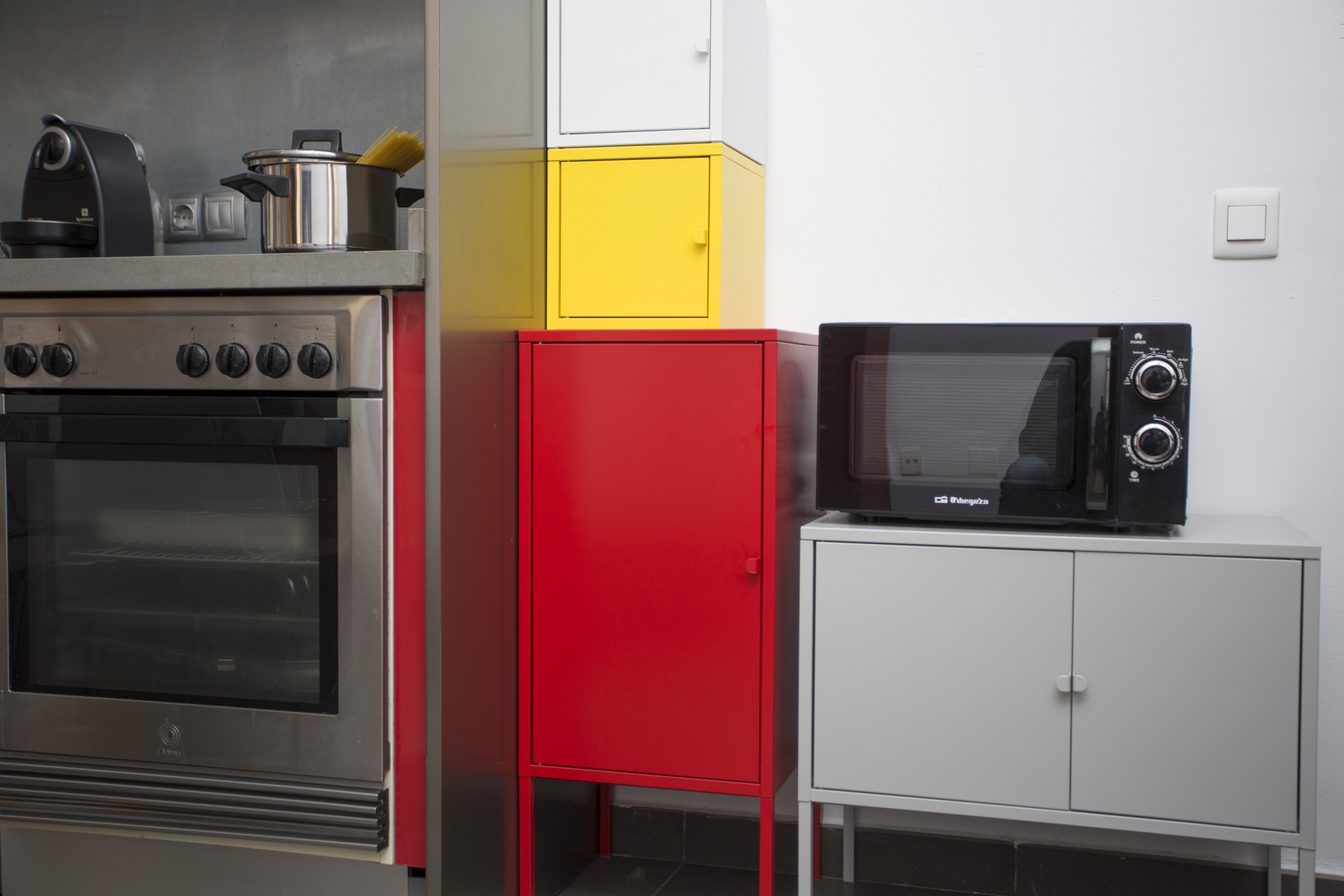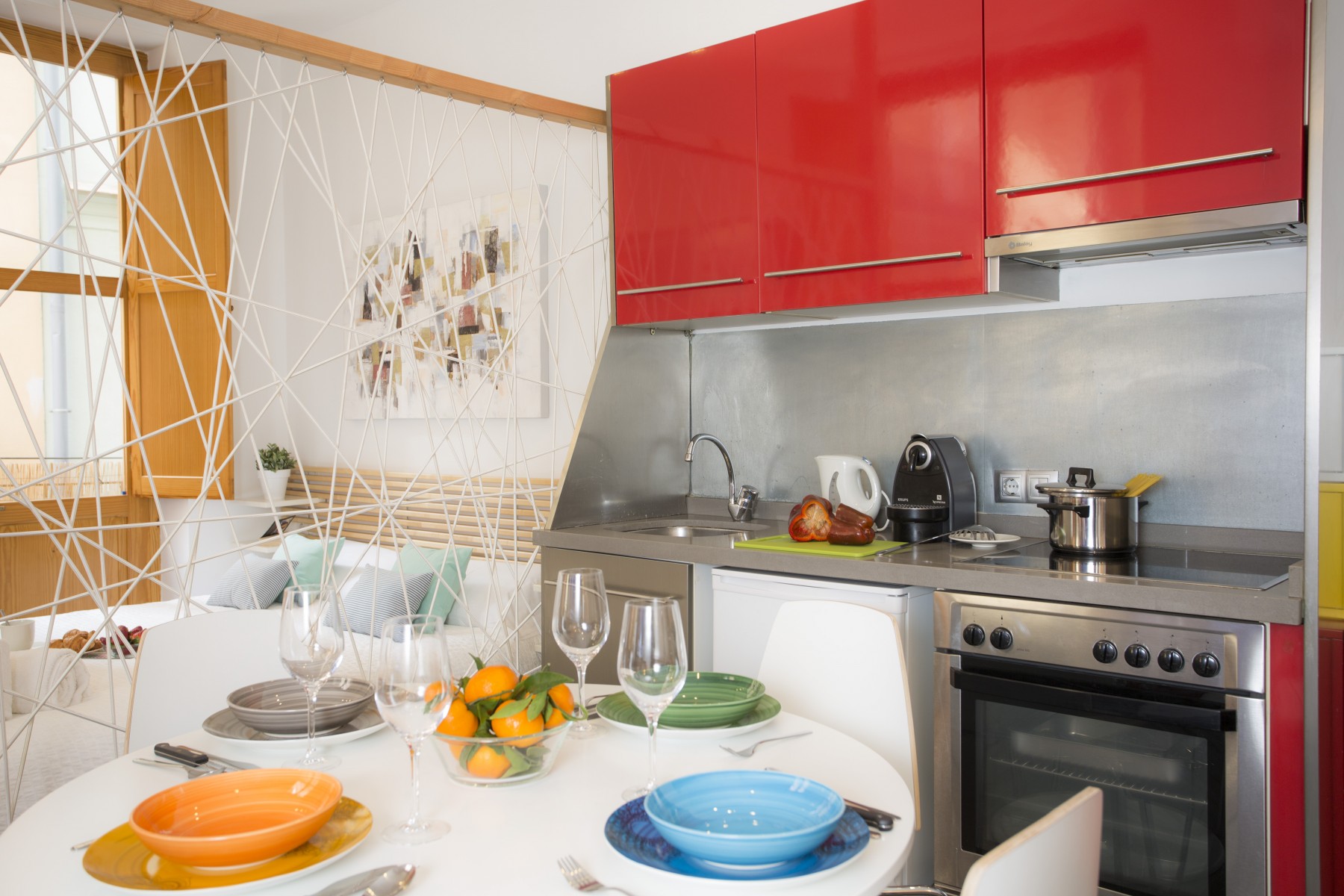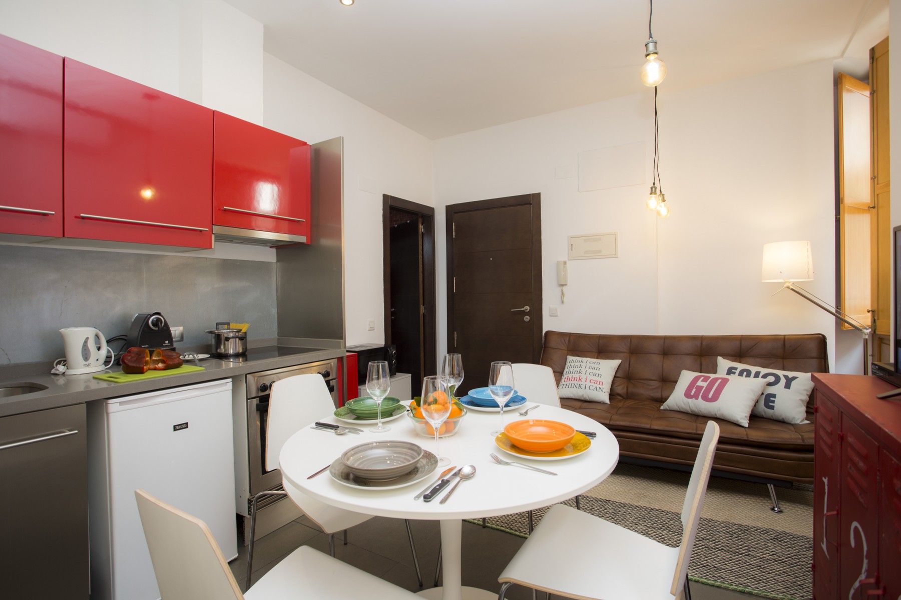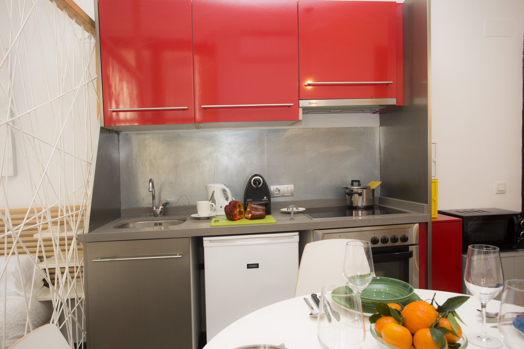 In the vitroceramic open plan kitchen, refrigerator, microwave, oven, freezer, dishes/cutlery, kitchen utensils, coffee machine, toaster, kettle and juicer are provided.