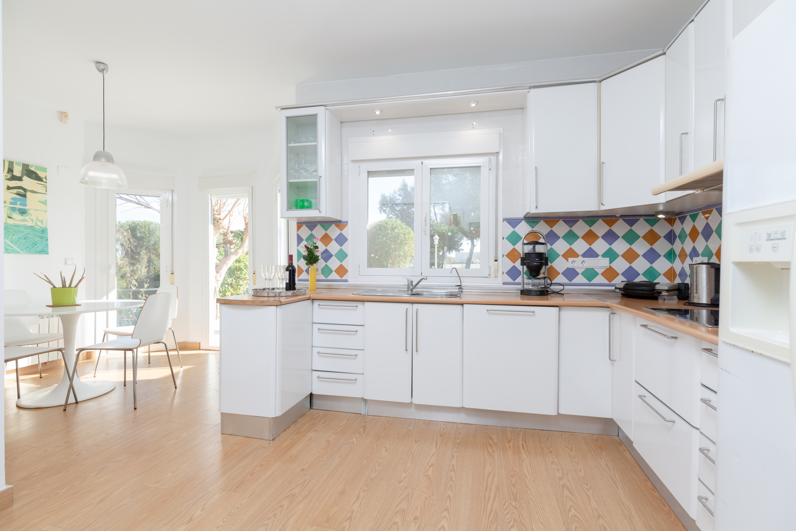 The independent glass-ceramic kitchen is equipped with a fridge, microwave, oven, freezer, washing machine, tumble dryer, dishwasher, dishes / cutlery, kitchen utensils, coffee maker, toaster, kettle and juicer.